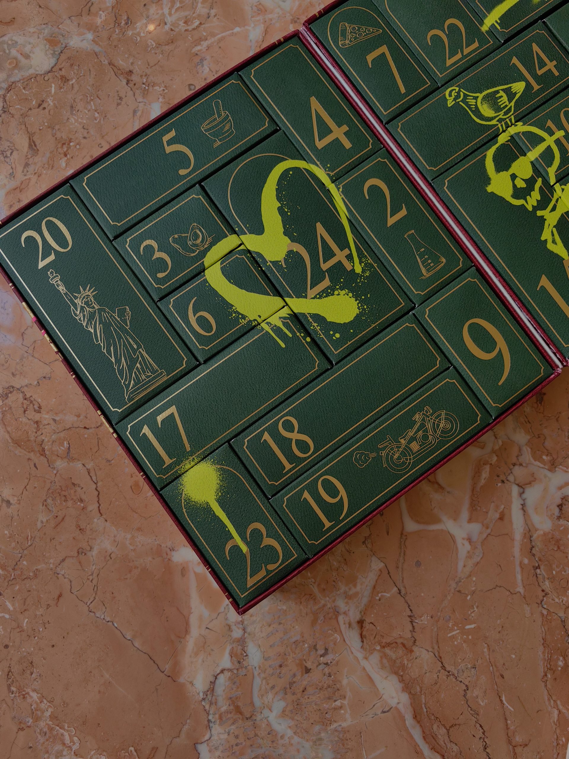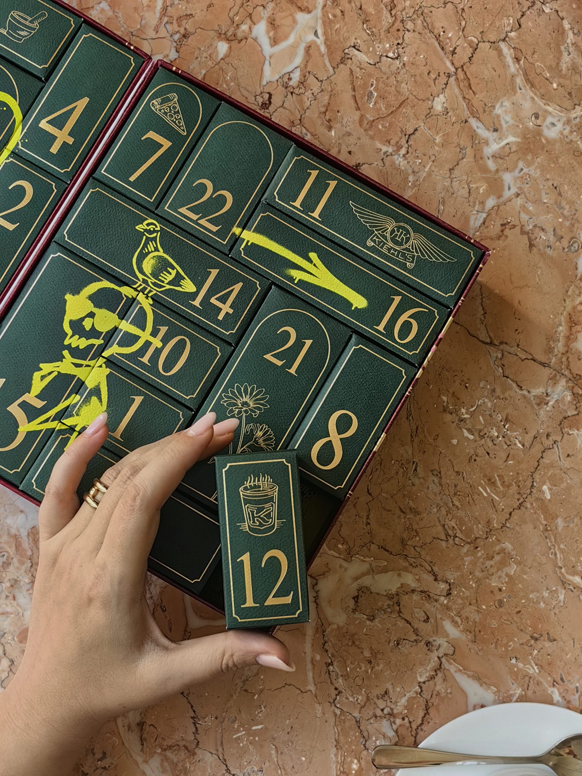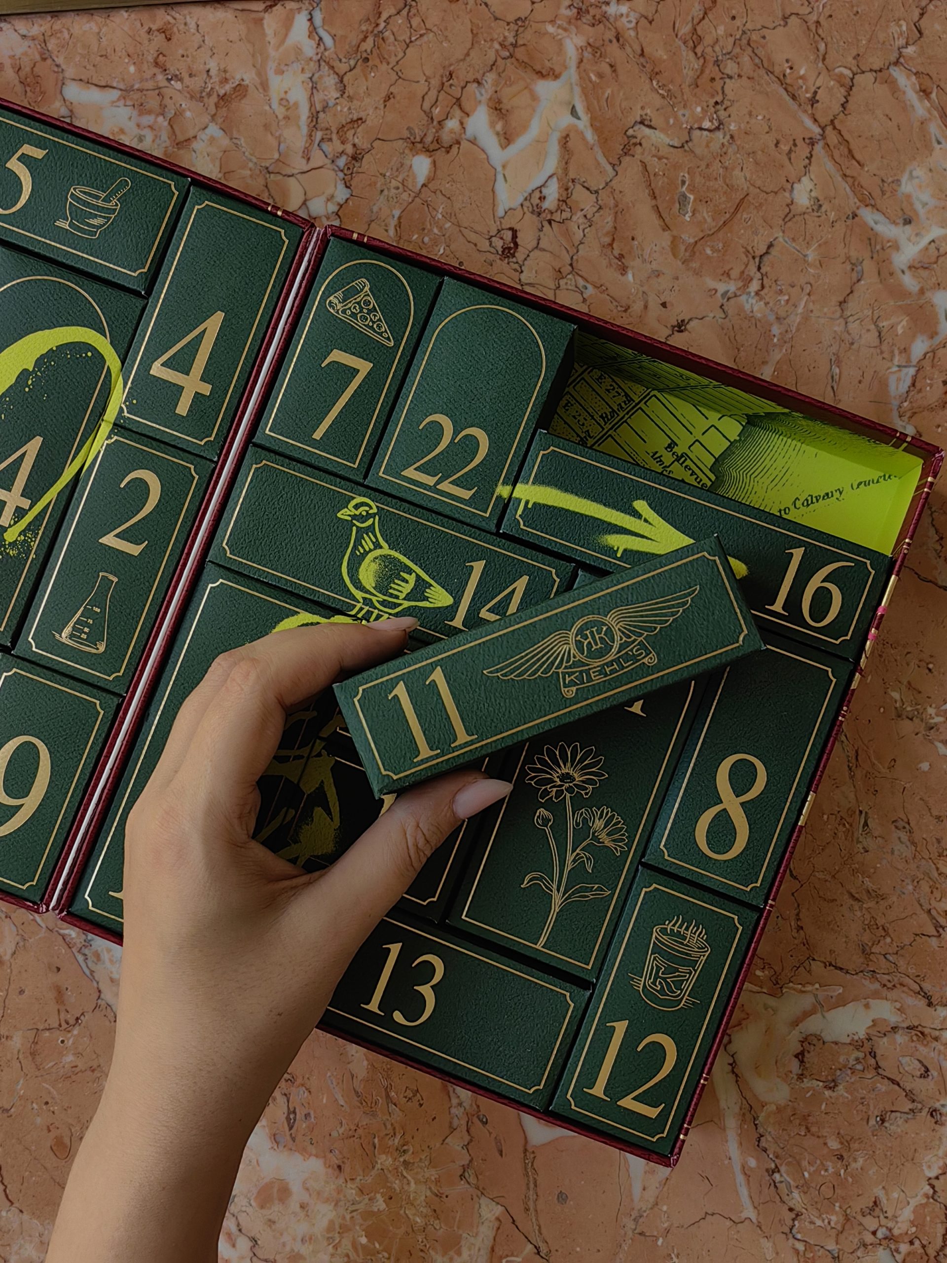 Uvijek pomno osmišljen, ove godine Kiehl’sov adventski kalendar dolazi u čvrstoj kutiji koja u unutrašnjosti krije 24 kultna proizvoda ovoga brenda. Boje su tipično blagdanske, duboka zelena iznutra te tamna crvena izvana, ali naravno začinjene prepoznatljivom Kiehl’s estetikom pa je tako vanjski dio prošaran neonsko rozim grafitima, dok je unutarnji iscrtan neonsko zelenim grafitima. Oba neodoljivo podsjećaju na grad iz kojeg nam dolazi ovaj brend – New York.