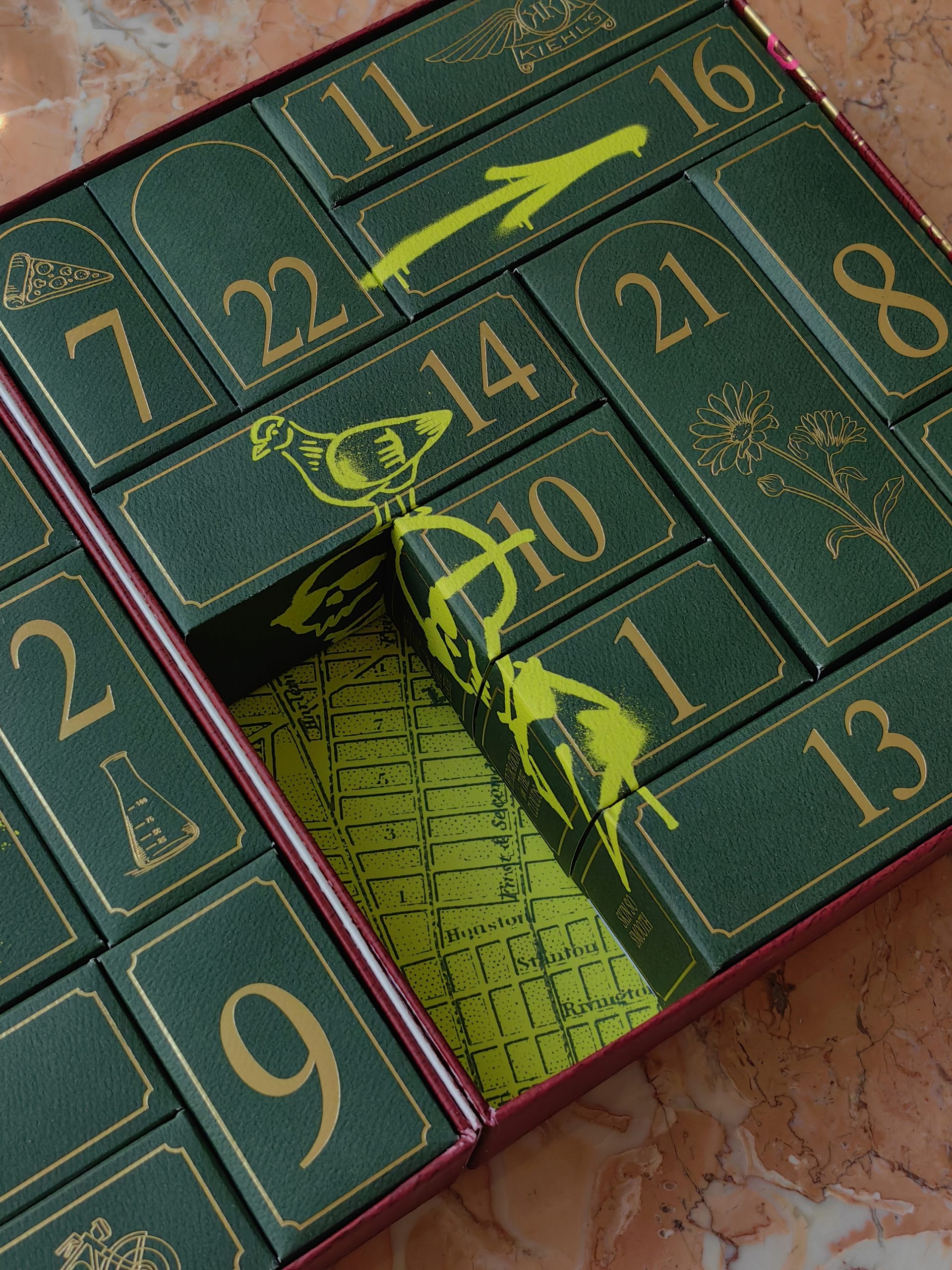 Uvijek pomno osmišljen, ove godine Kiehl’sov adventski kalendar dolazi u čvrstoj kutiji koja u unutrašnjosti krije 24 kultna proizvoda ovoga brenda. Boje su tipično blagdanske, duboka zelena iznutra te tamna crvena izvana, ali naravno začinjene prepoznatljivom Kiehl’s estetikom pa je tako vanjski dio prošaran neonsko rozim grafitima, dok je unutarnji iscrtan neonsko zelenim grafitima. Oba neodoljivo podsjećaju na grad iz kojeg nam dolazi ovaj brend – New York.