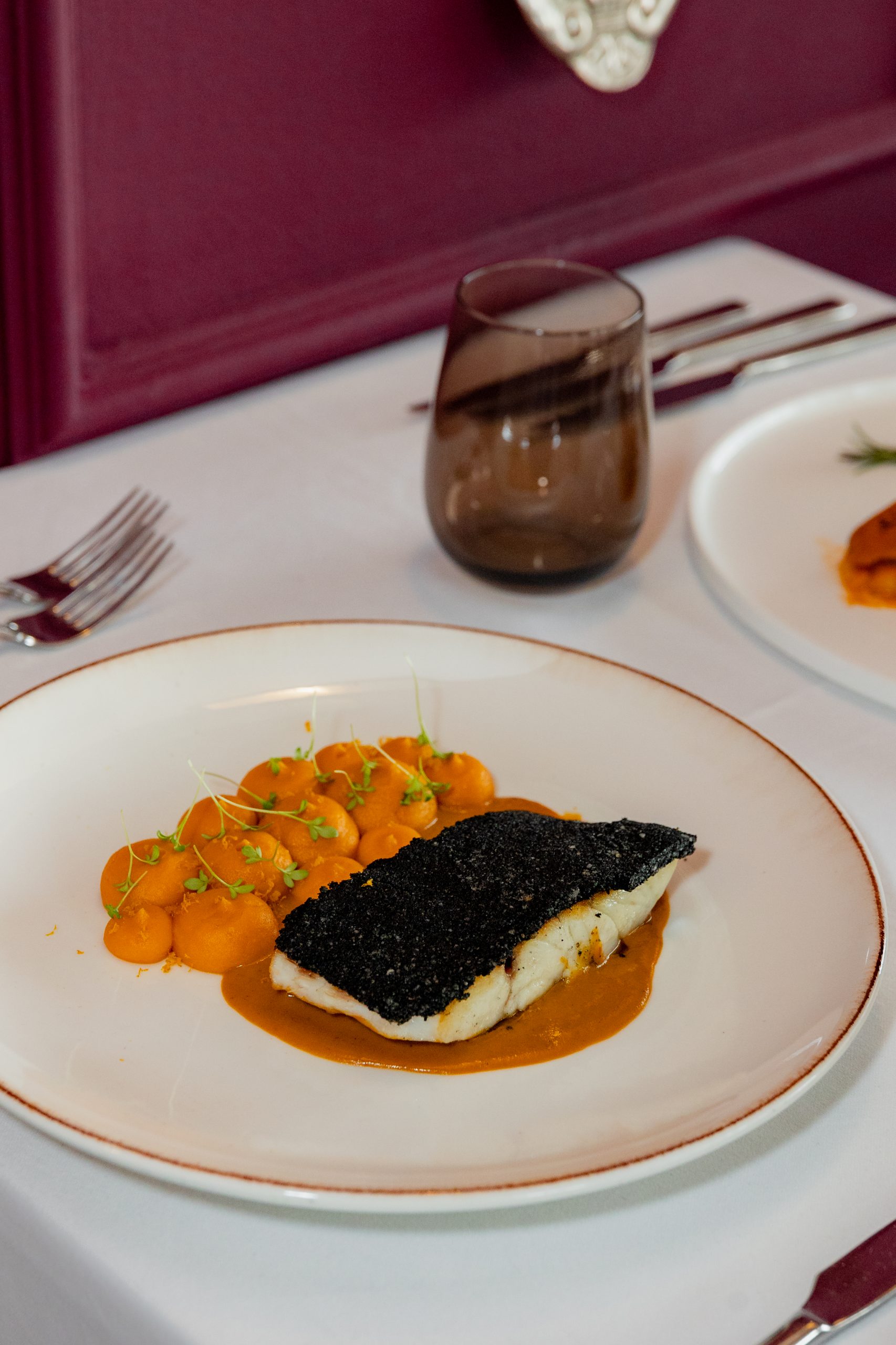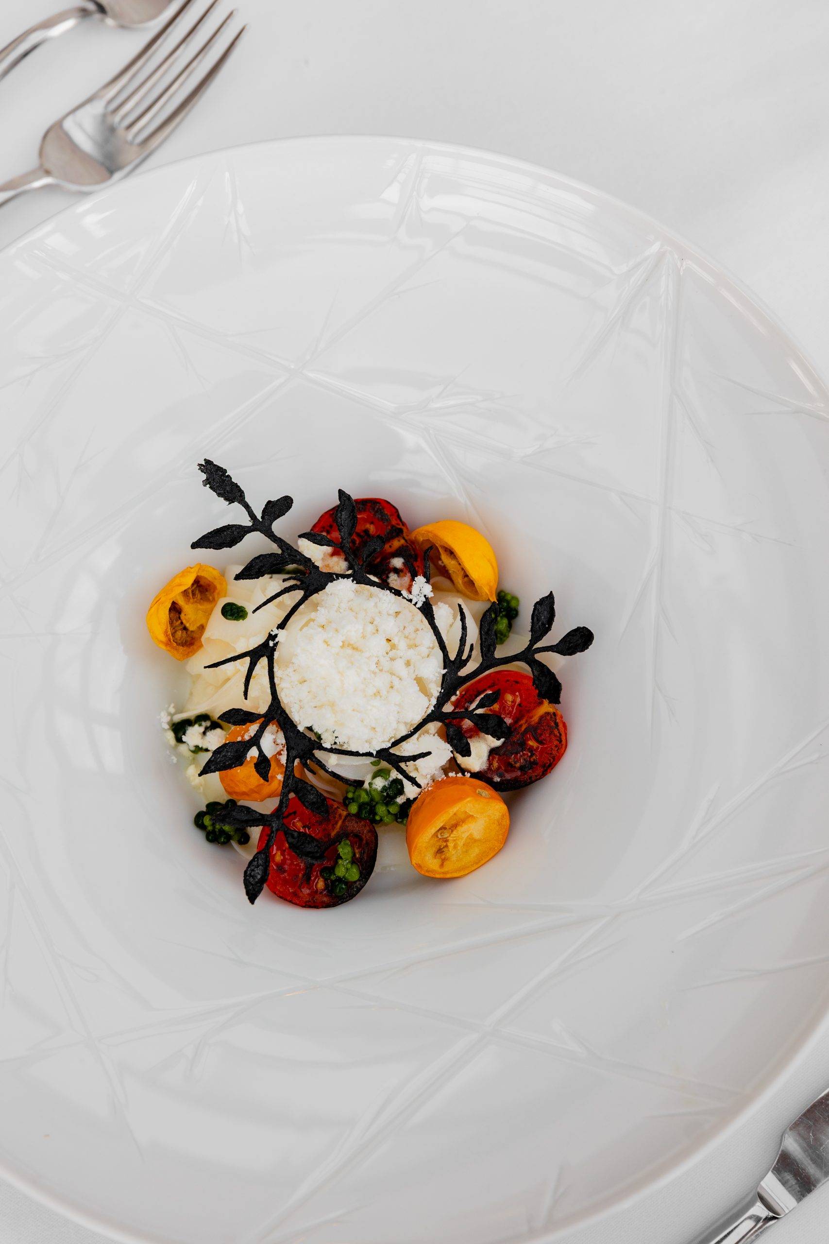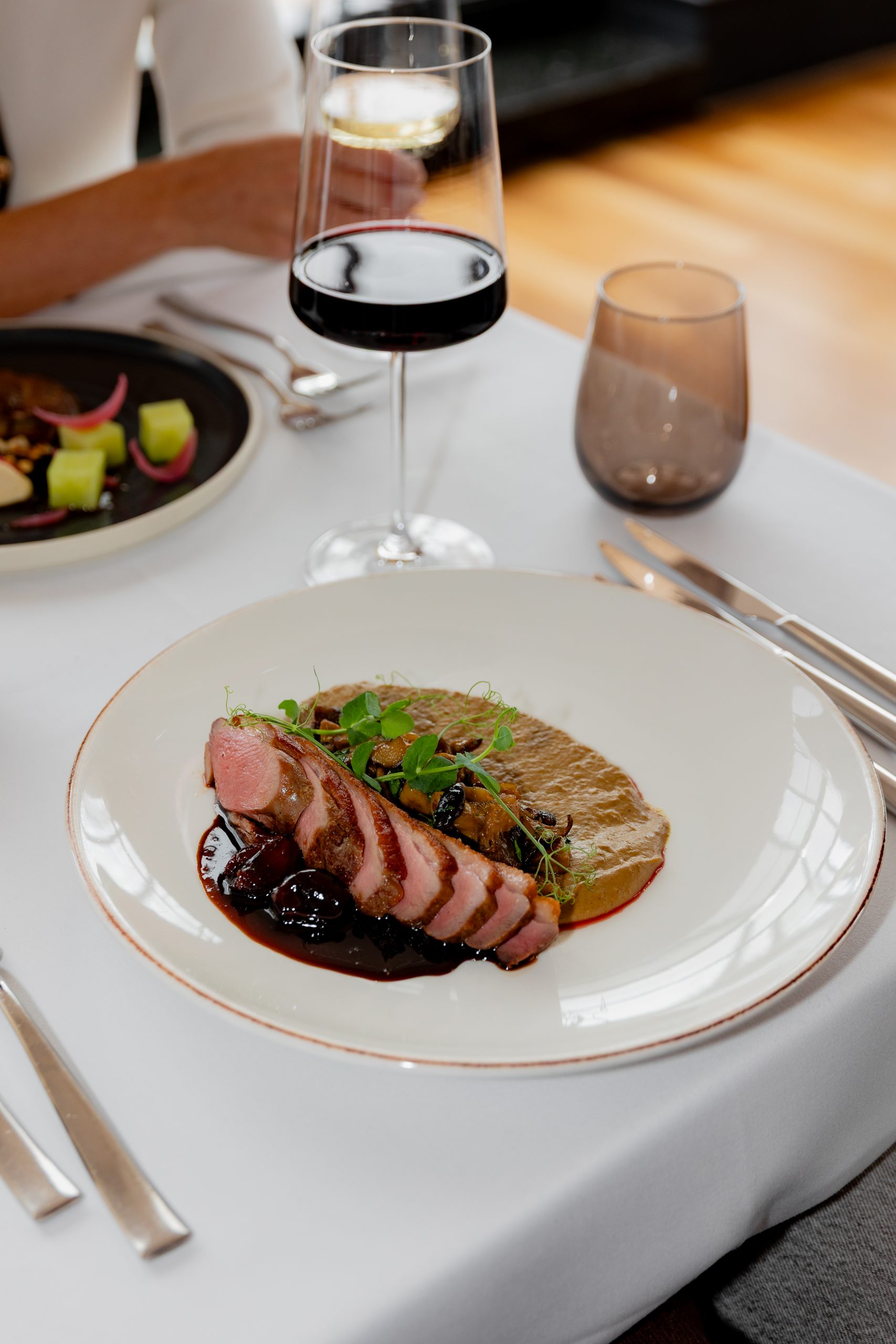 Namirnice su lokalne, ali bez namjere da budu folklorne: sipa, cherry rajčica, bosiljak, list, ružmarin, gljive, vrganji, kesten, fermentirano povrće. Sve je prisutno, ali u mjeri, u dijalogu. Chef gradi slojeve, ne ukrase – svaki tanjur ima svoj tonalitet, od svježine prema punoći, od svijetlog prema tamnijem, od suzdržanog prema emotivnom. Tako sipa tagliatelle sa cherry rajčicama, maslinovim uljem u prahu i perlama bosiljka postaje manifest preciznosti – Mediteran bez nostalgije, s jasnoćom mora i travnatom svježinom bilja. File lista u brudetu s palentom i paljenim ružmarinom govori o disciplini, o koncentriranom umaku koji nije sjećanje, već reinterpretacija. Krem juha od kiselog kupusa, gljiva, ječma i graha možda je najhrabriji trenutak menija – oda fermentima, zemlji i miru koji dolazi kad okus više nije dekor, već iskustvo. Pačja prsa s vrganjima, gljivama, karameliziranim češnjakom i vinom vraćaju klasičan ton, ali bez težine, dok Mont Blanc s kesten pireom donosi zimski završetak koji smiruje.
