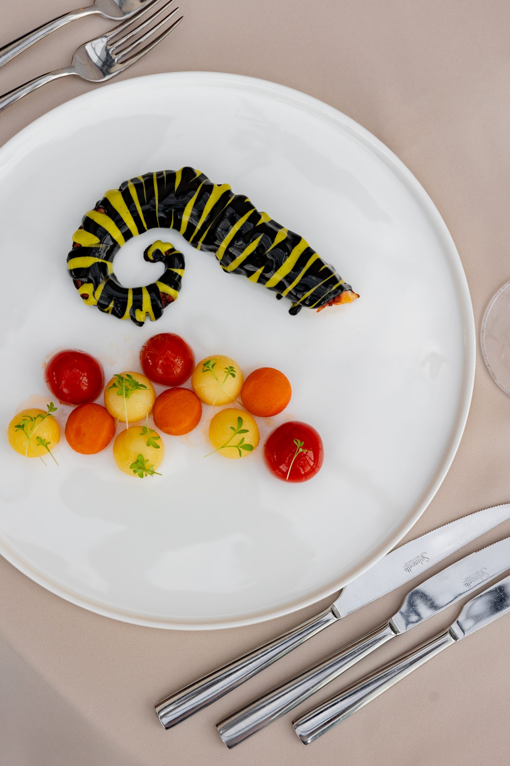 Filozofija menija oslanja se na tri uporišta – zemlju, toplinu i svjetlo. Zemlju donose fermenti, korjenasto povrće i gljive; toplinu stvaraju redukcije, pečeni tonovi i začini; svjetlo dolazi kroz male kontraste – svježinu rajčice, travnate note bosiljka, mineralnost mora. Upravo taj balans između težine i lakoće čini da meni diše. U središtu je ideja topline i utjehe — ne sentimentalne, nego one stvarne, koja dolazi iz jasnoće i jednostavnosti.