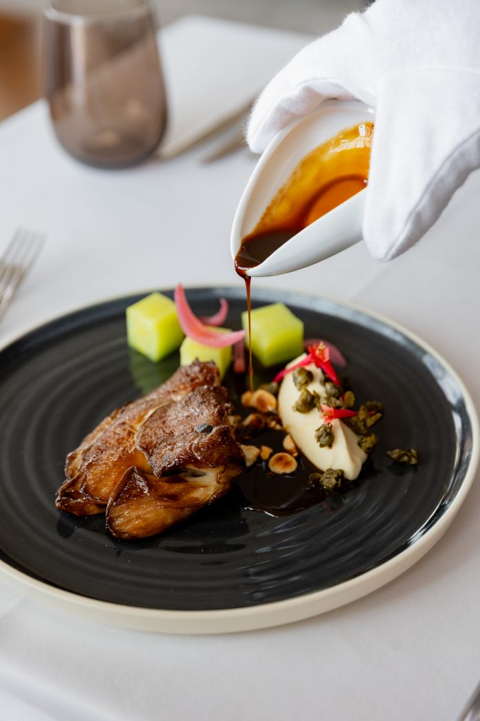 Namirnice su lokalne, ali bez namjere da budu folklorne: sipa, cherry rajčica, bosiljak, list, ružmarin, gljive, vrganji, kesten, fermentirano povrće. Sve je prisutno, ali u mjeri, u dijalogu. Chef gradi slojeve, ne ukrase – svaki tanjur ima svoj tonalitet, od svježine prema punoći, od svijetlog prema tamnijem, od suzdržanog prema emotivnom. Tako sipa tagliatelle sa cherry rajčicama, maslinovim uljem u prahu i perlama bosiljka postaje manifest preciznosti – Mediteran bez nostalgije, s jasnoćom mora i travnatom svježinom bilja. File lista u brudetu s palentom i paljenim ružmarinom govori o disciplini, o koncentriranom umaku koji nije sjećanje, već reinterpretacija. Krem juha od kiselog kupusa, gljiva, ječma i graha možda je najhrabriji trenutak menija – oda fermentima, zemlji i miru koji dolazi kad okus više nije dekor, već iskustvo. Pačja prsa s vrganjima, gljivama, karameliziranim češnjakom i vinom vraćaju klasičan ton, ali bez težine, dok Mont Blanc s kesten pireom donosi zimski završetak koji smiruje.