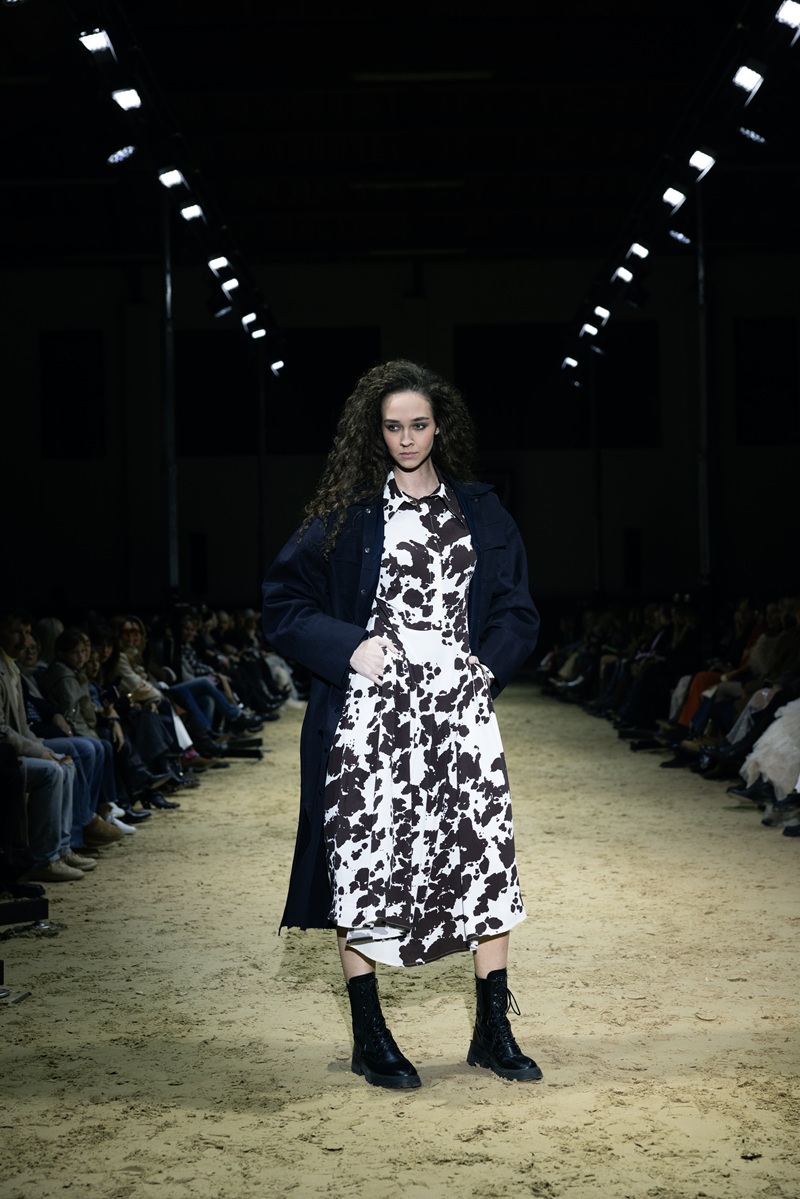 Ovo je linija koja slavi pokret i snagu: savršeno krojena odijela koja precizno grle siluetu, kaputi koji padaju s elegancijom, večernji komadi s naglaskom na senzualnost i dnevni outfiti spremni za prijelaz iz stabilnog u urbani ritam. Funkcionalnost dolazi kroz sportske elemente: traper hlačice i pamučne majice spojene s profinjenom svilom, čipkom koja dodaje misterij i najfinijim vunenim štofovima za toplinu. Paleta boja je sofisticirana: tamno plava i smeđa kao baza, crna i bjelokost za dubinu, uz detalje roze i zelene koji unose svježinu.