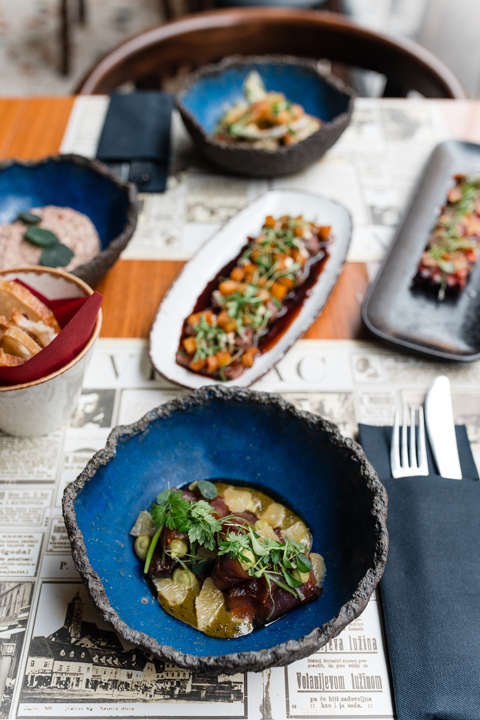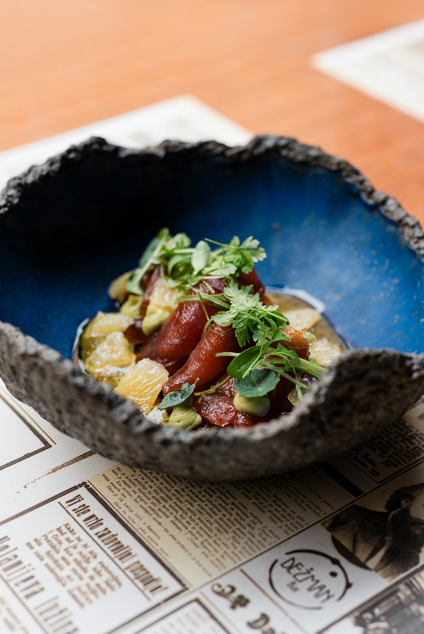 Večer započinje profinjenim tuna crudom, gdje se svježina ribe susreće s kremom od grill avokada, ukiseljenim limunom, pistacijom i blagom pikantnošću jalapeña. Slijedi neodoljiva hobotnica na ražnjiću, pečena na grillu, u društvu poriluka, pancete i aromatičnog umaka od plavog sira, koja donosi bogate umami okuse i savršen kontrast tekstura. Za ljubitelje klasike tu je i beef tartare od vrhunskog bifteka, pripremljen s vlascem, ljutikom, kaparima i pažljivo odabranim začinima, koji svakoj večeri daje dozu bezvremenske elegancije.