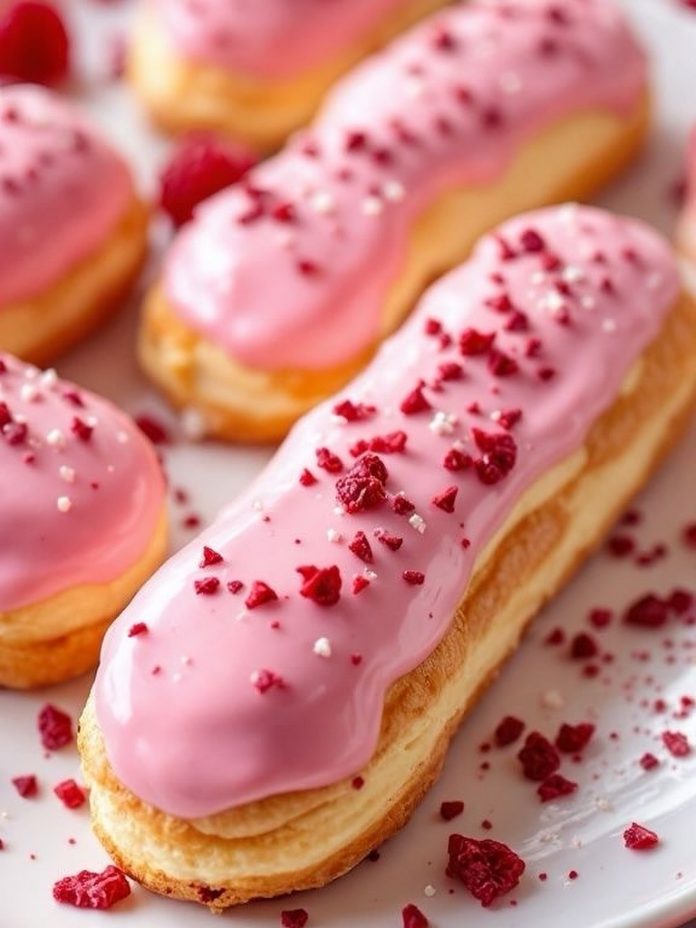 - Éclairse prerežite ili probušite s donje strane. Napunite ih kremom od vanilije, dodajte sloj malinastog umaka i zatvorite. Po vrhu ih prelijte glazurom koju ste napravili na klasičan način ili otopljenom čokoladom, pa ukrasite malinama ili laticama.