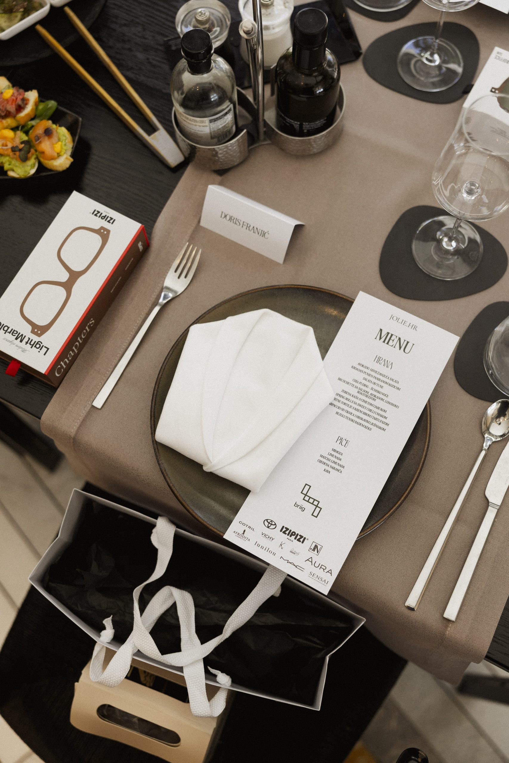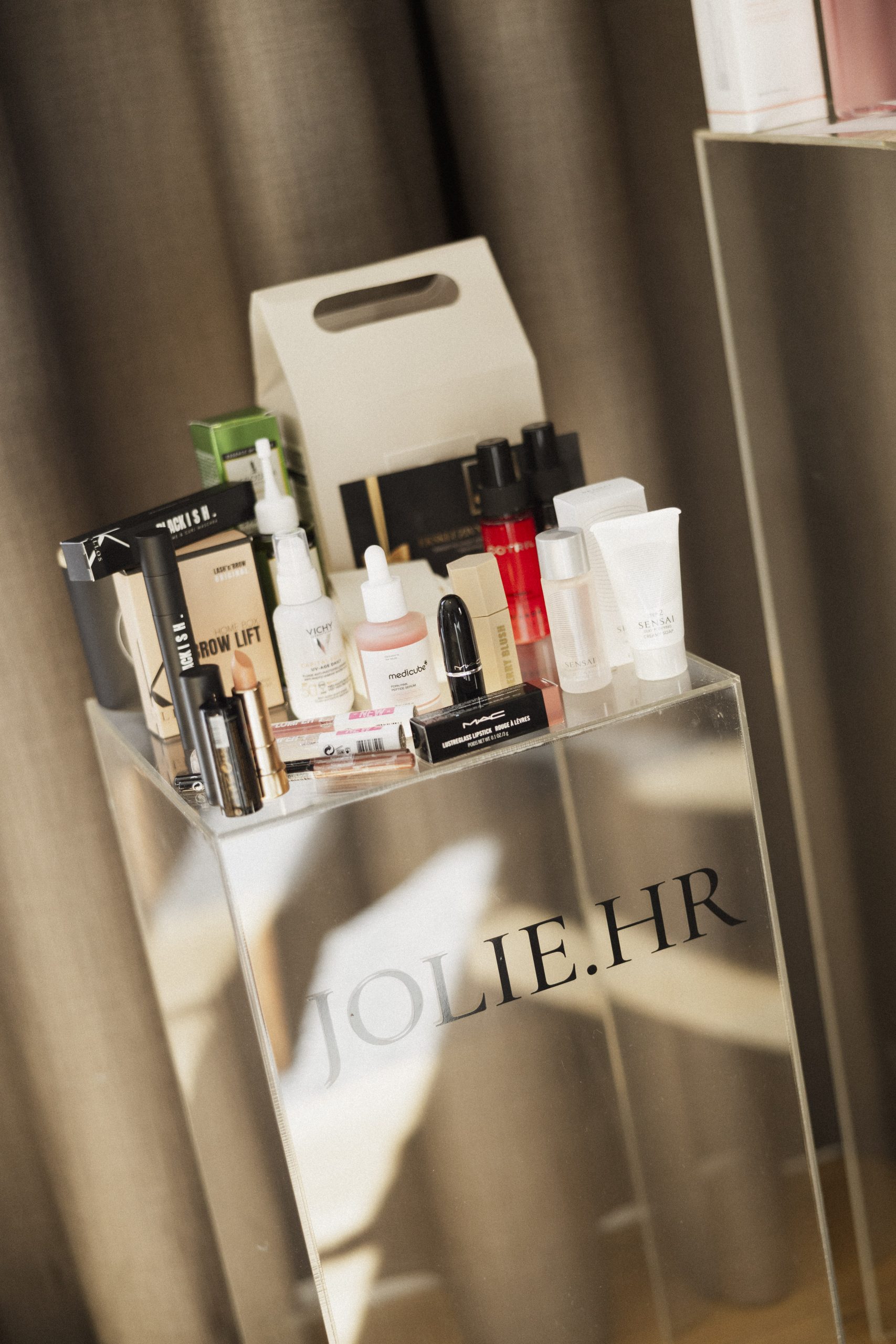 Goodie bag koji je svaka gošća ponijela kući bio je prava mala kutija iznenađenja i pažljivo odabranih proizvoda. Osim Izipizi naočala po izboru i vaučera JN Medical Groupa za ekskluzivne tretmane, u njemu su se našli i Cotril Firewall sprej za zaštitu od topline i Cotril Umbrella sprej za restrukturiranje i zaštitu kovrčave ili lomljive kose, proizvodi Kallos brenda: Homebox brow lift i maskara, krema za ruke i silikonska torbica, Vichy Capital Soleil UV-Age Daily SPF 50+, Afrodita Scalp & Hair ulje za kosu, te luksuzni proizvodi Sensai za dvostruko čišćenje i hidrataciju kože. Tu su bili i MAC ruževi i sjajila, Medicube serum iz Beauty Gardena, Aura olovke, ruževi i svijeća s mirisnim voskom koji se otapanjem pretvara u balzam za ruke, kao i JN Beauty set s paletom make-up proizvoda i beauty dodacima. Poseban dodatak u goodie bagu bile su i lunilou čarape, kao simbol održive udobnosti i brenda koji promiče svjesnu modu.