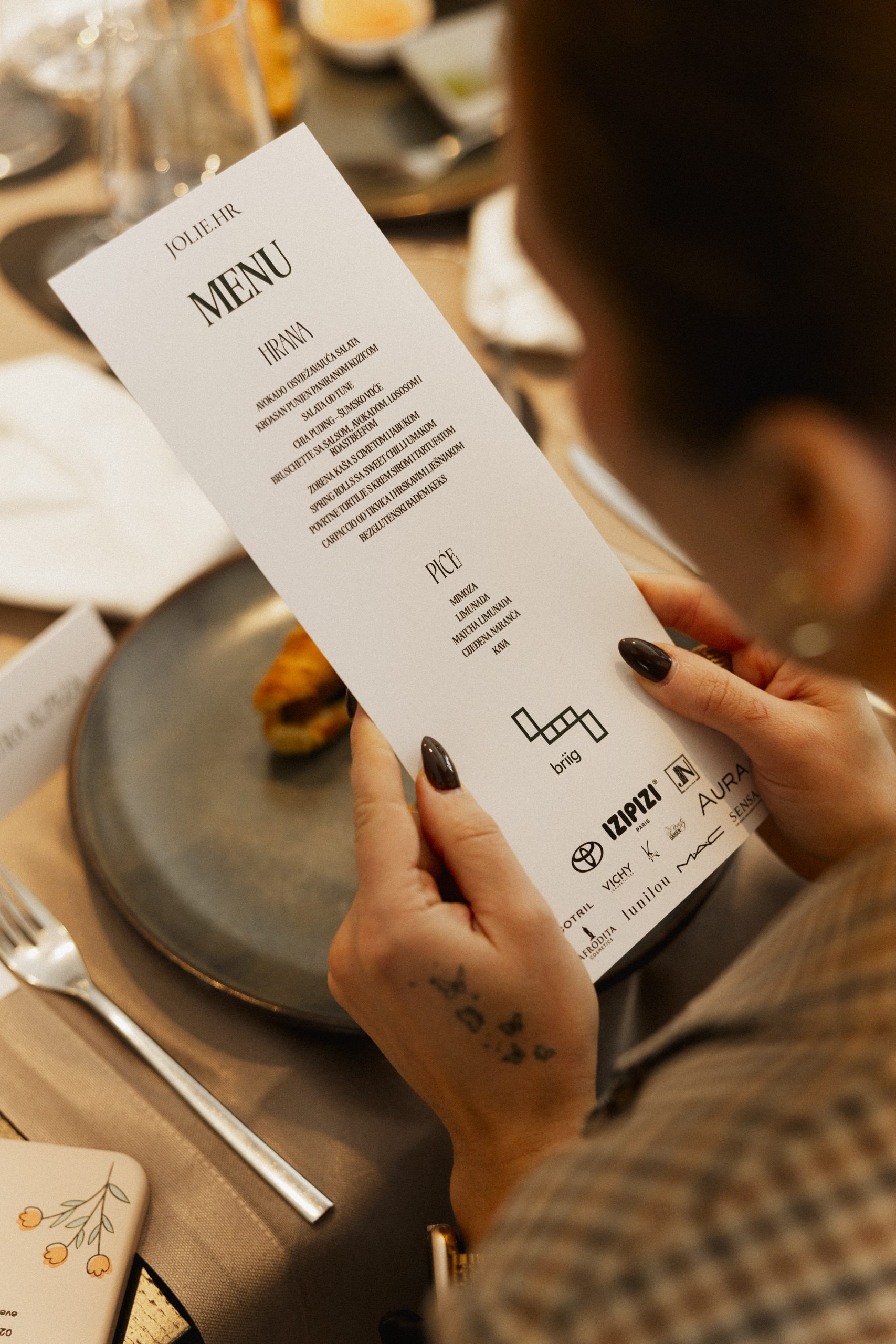 Za gastro dio eventa pobrinuo se hotel briig, koji je pripremio raskošan brunch meni u savršenom balansu svježih i laganih okusa. Na stolovima su se našli kroasani punjeni paniranom kozicom, bruschette sa salsom, avokadom, lososom i roastbeefom, spring rolls sa sweet chilli umakom te povrtne tortilje s krem sirom i tartufatom. U ponudi su bile i osvježavajuće opcije poput avokado salate, salate od tune, carpaccia od tikvica s hrskavim lješnjakom te chia pudinga s voćem i zobene kaše s cimetom i jabukom. Za kraj, uzvanice su uživale u bezglutenskim badem keksima uz čašu cijeđene naranče, limunade, matcha limunade, mimose ili kave.