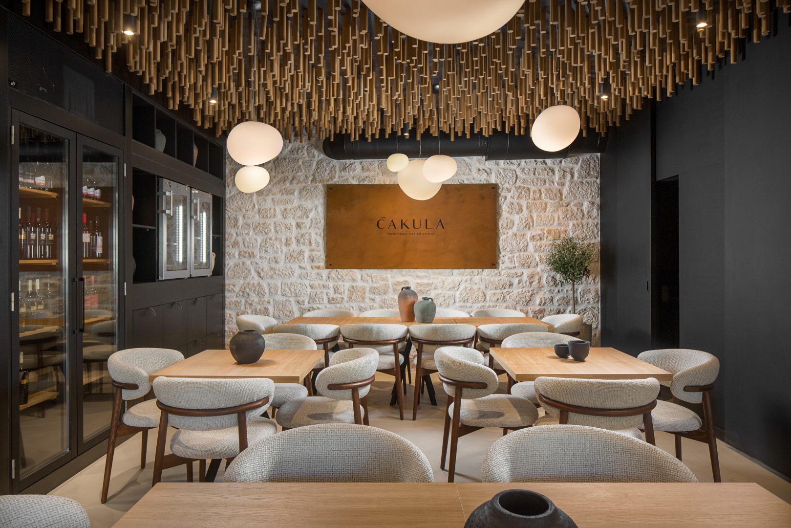 Ideja dizajnera je bila ovom lokalu dati istarsku dušu na suvremeni način, a to je i postigao savršenim spajanjem tradicionalnog materijala istarskog kamena s modernim materijalima kortenom i mikrobetonom.