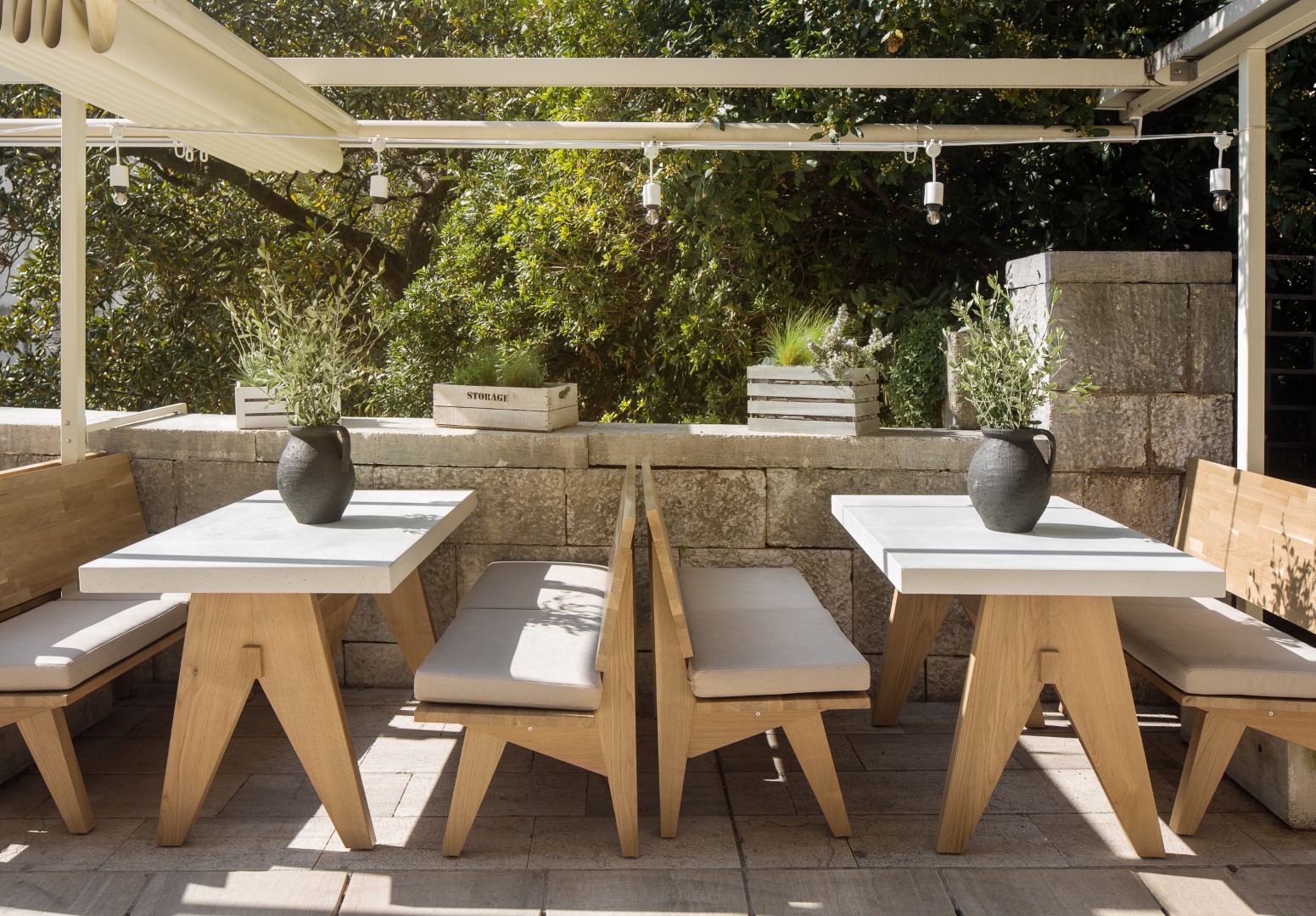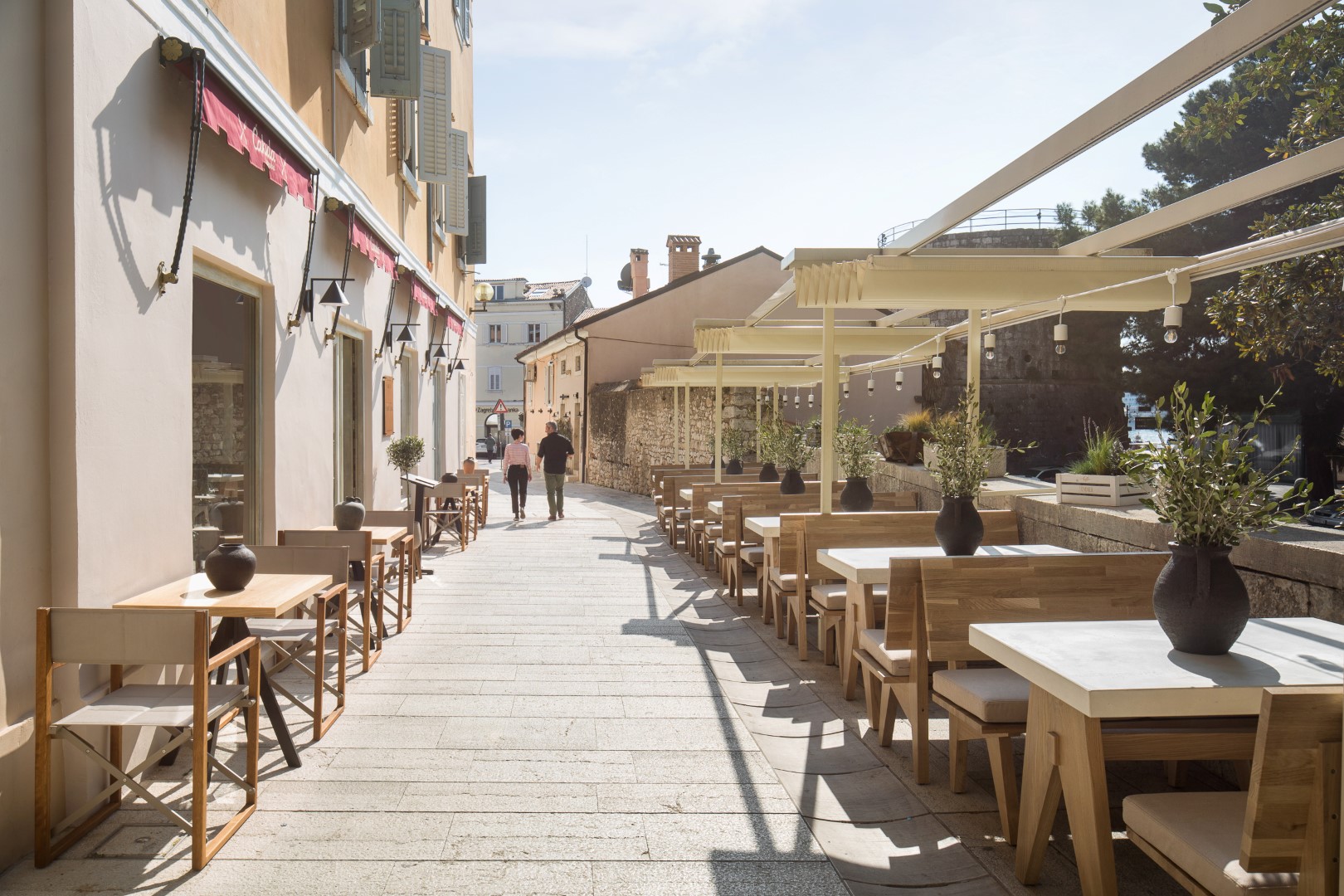 Terasa restorana je zapravo ulica starogradske jezgre popločana istarskim kamenom. Sandrova želja bila je, između ostalog, proljepšati ulicu te je upravo to i učinio stolovima i klupama koje je dizajnirao posebno za ovaj lokal. Sačinjeni od hrastove konstrukcije s posebnom pločom od armiranog betona u koji je ugraviran logo restorana, stolovi i klupe savršeno se uklapaju u ovaj povijesni dio grada Poreča.