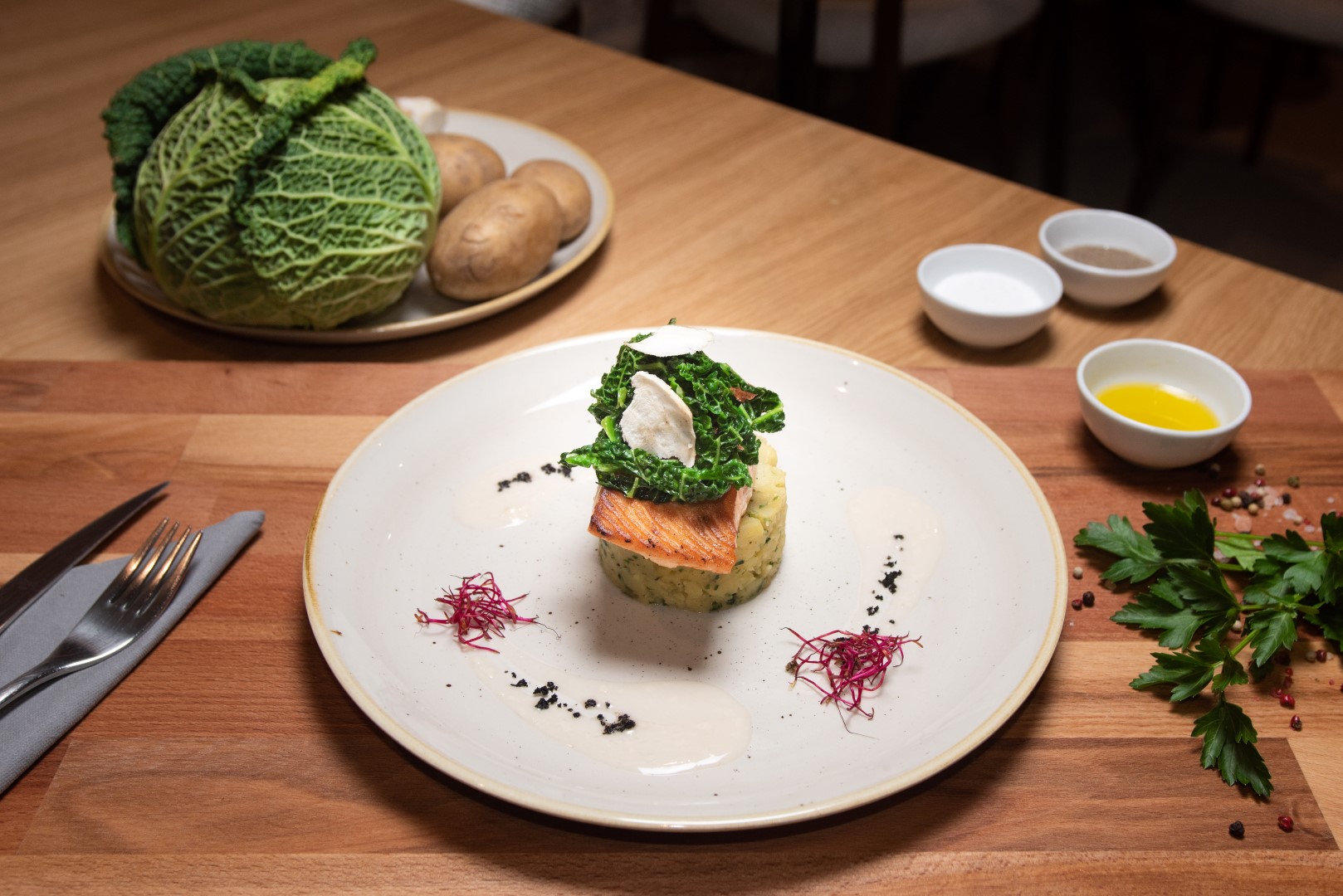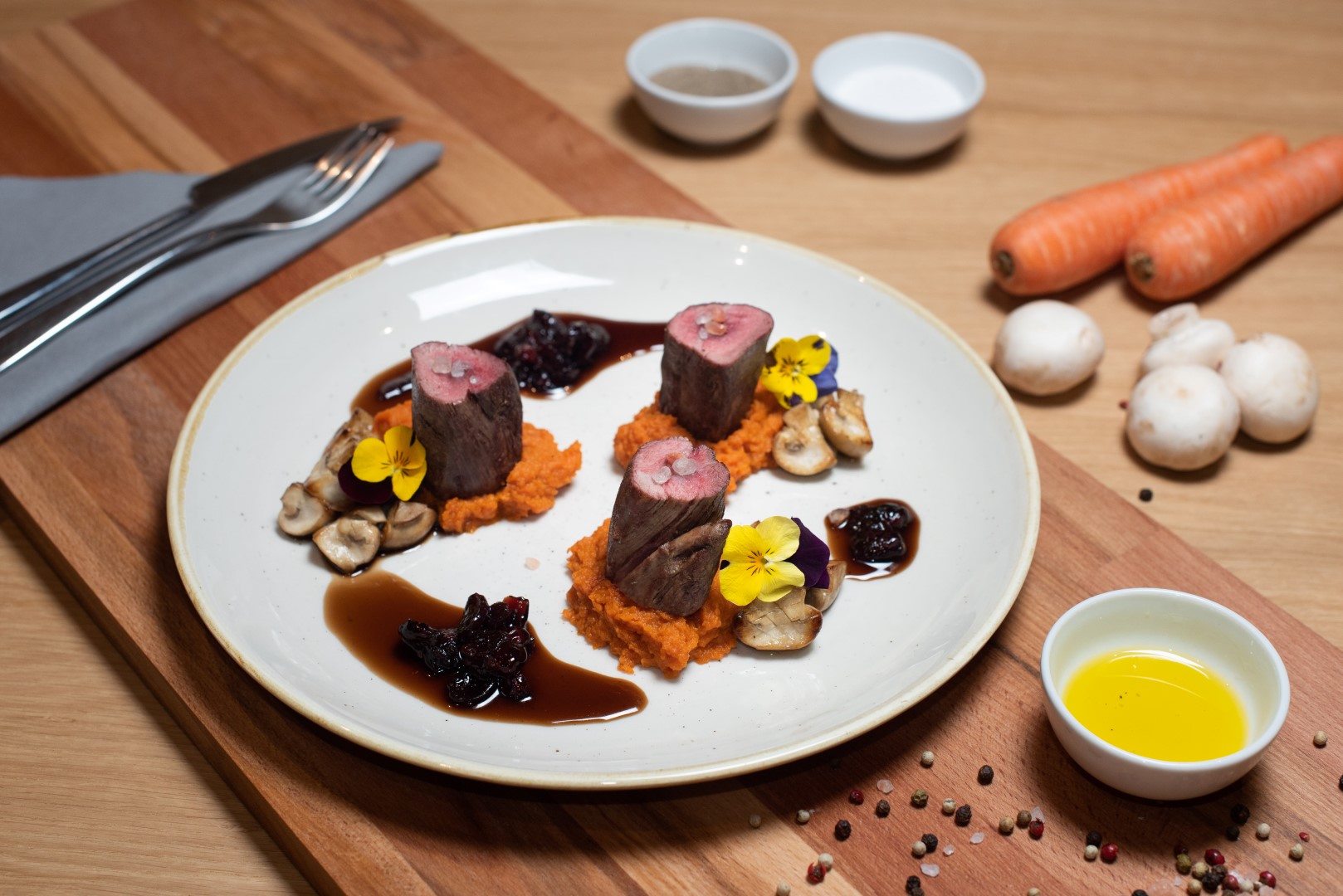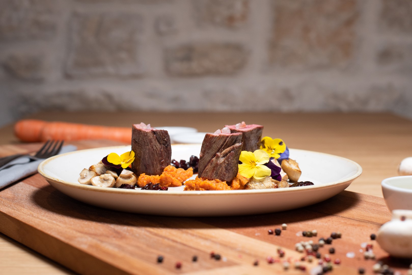 Interijerom vladaju kontrasti kojima je svrha odvajanje dva funkcionalna prostora. Prostor za goste uređen je u svijetlim tonovima i upotpunjen prirodnim materijalima, čime se naglašava profinjenost samog restorana, a dodatno ga ispunjavaju po mjeri rađene vitrine za vino te dry-ageri, frižideri za sazrijevanje mesa. Kuhinjeski elementi monokromatski su crne boje kako bi se dodatno naglasile delicije vrsnih chefova.