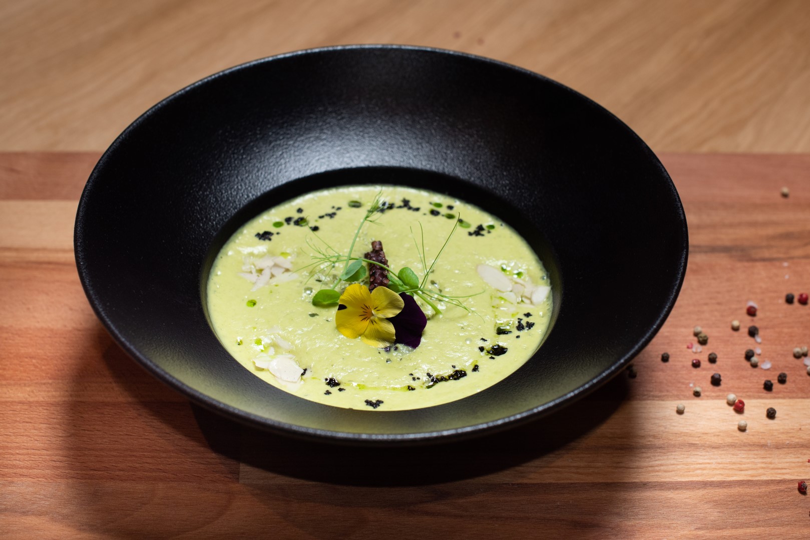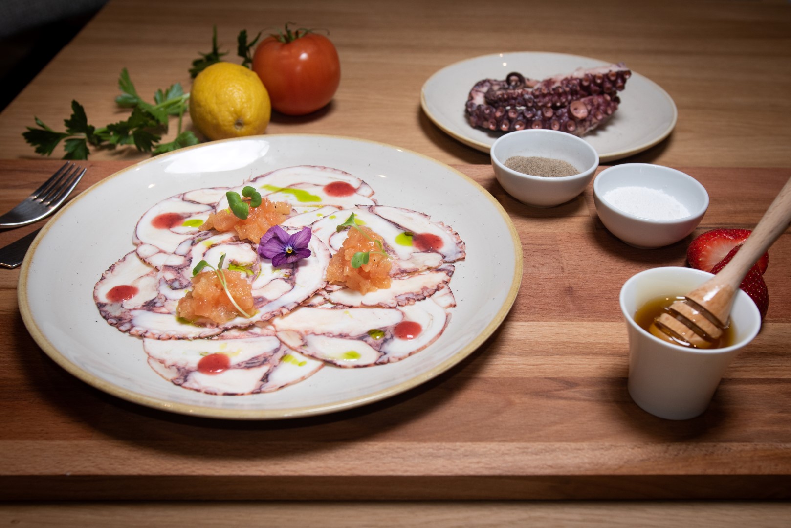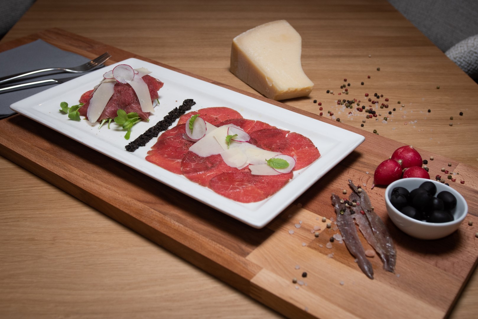 Interijerom vladaju kontrasti kojima je svrha odvajanje dva funkcionalna prostora. Prostor za goste uređen je u svijetlim tonovima i upotpunjen prirodnim materijalima, čime se naglašava profinjenost samog restorana, a dodatno ga ispunjavaju po mjeri rađene vitrine za vino te dry-ageri, frižideri za sazrijevanje mesa. Kuhinjeski elementi monokromatski su crne boje kako bi se dodatno naglasile delicije vrsnih chefova.
