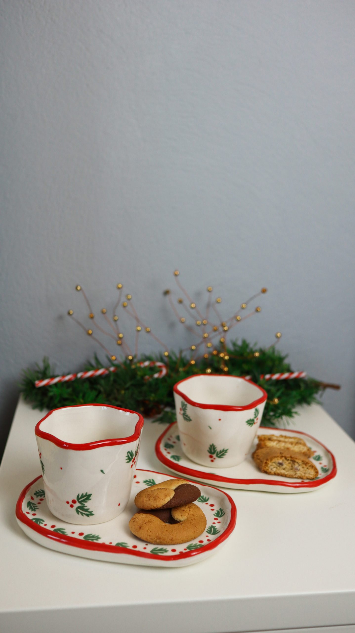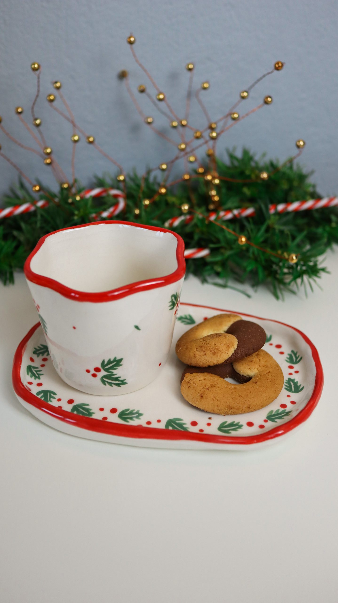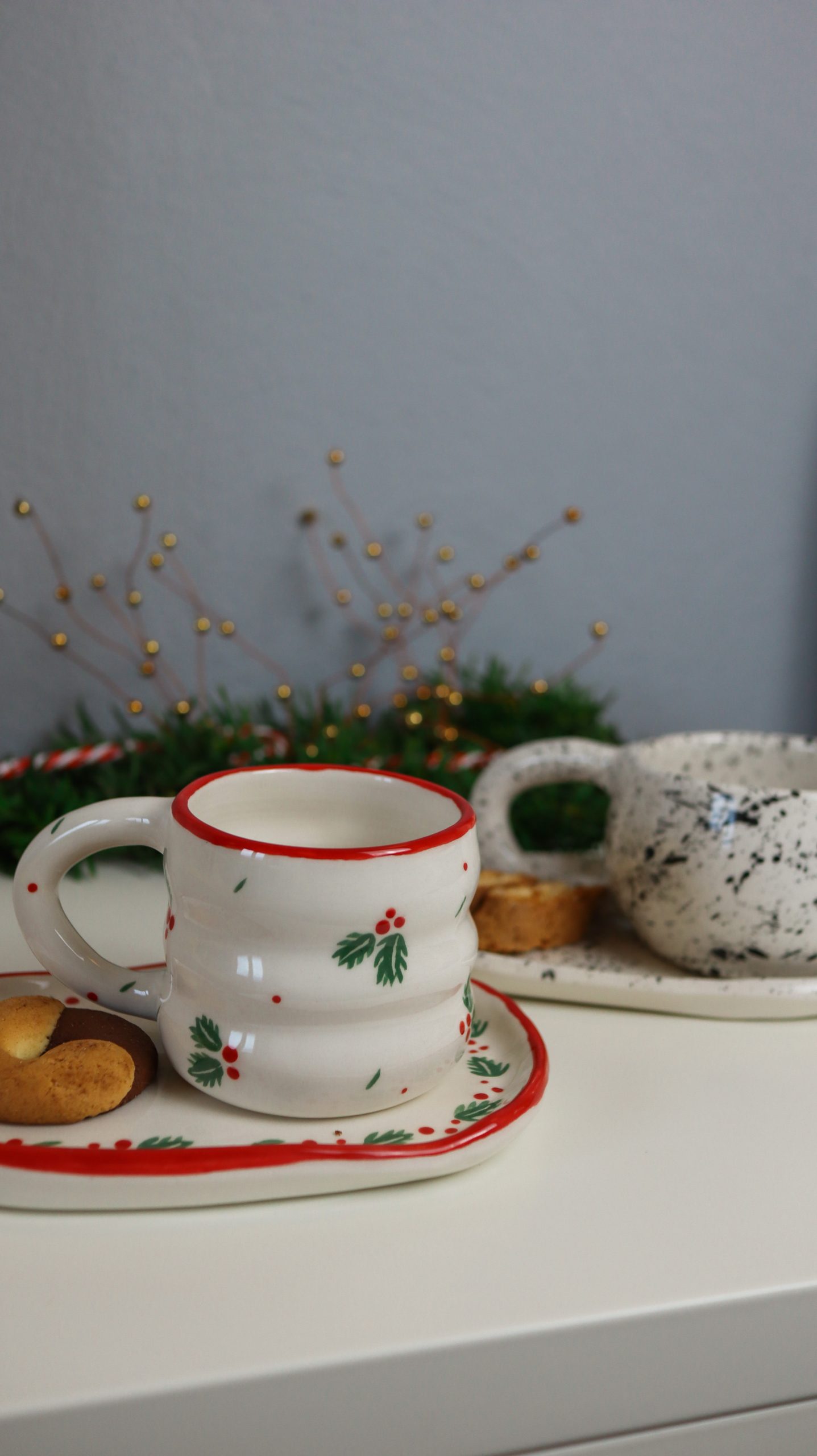 U ovoj blagdanskoj kolekciji očekuju vas dvije vrste dizajna. Za početak tu je poprskani crni šampus koji je već neko vrijeme favorit ljubitelja keramike pa ga je Barbara odlučila uključiti i u ovu kolekciju. Ostatak kolekcije prikladno za ovo blagdansko vrijeme i Božić ima motiv božikovine s akcentima u klasičnim božićnim bojama poput crvene i zelene.