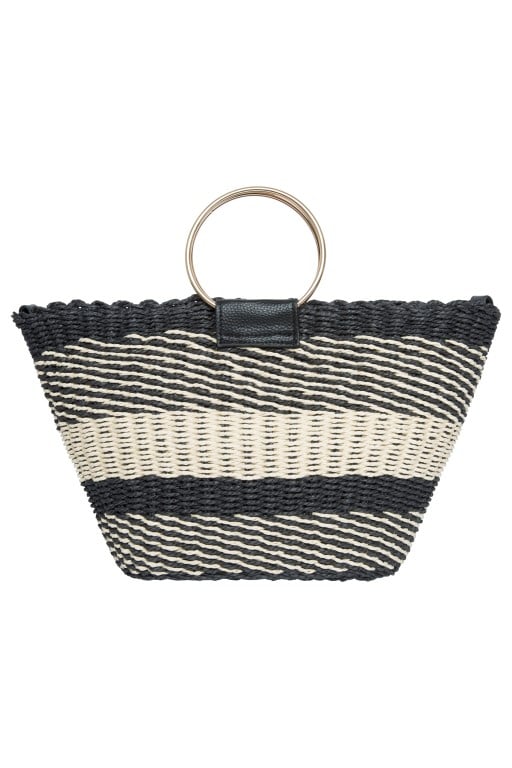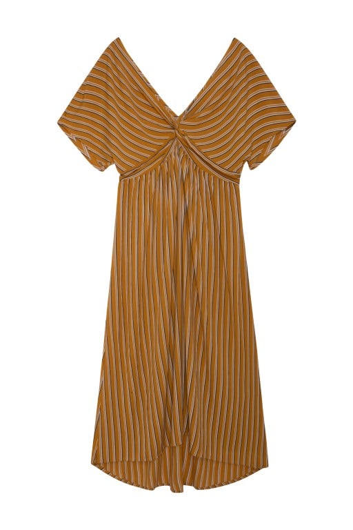 Za treću kombinaciju Dora je odabrala dugu žutu haljinu na pruge i trendi špagerice, cijeli look upotpunila je okruglom pletenom torbom koju ćemo i ove sezone viđati na gradskim ulicama i plažama – cijena žute haljine 299 kn.