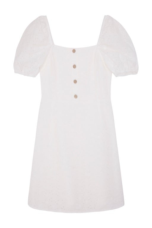 Bijelu mini haljinu s izvezenim kratkim rukavima Dora je odabrala za šetnju gradom. Slamnati šešir pruža zaštitu od sunca, a ujedno daje profinjenu notu. Cijeli outfit upotpunila je ultra modernom pletenom torbicom koja izgleda poput mini kovčežića – cijena bijele haljine 259 kn.