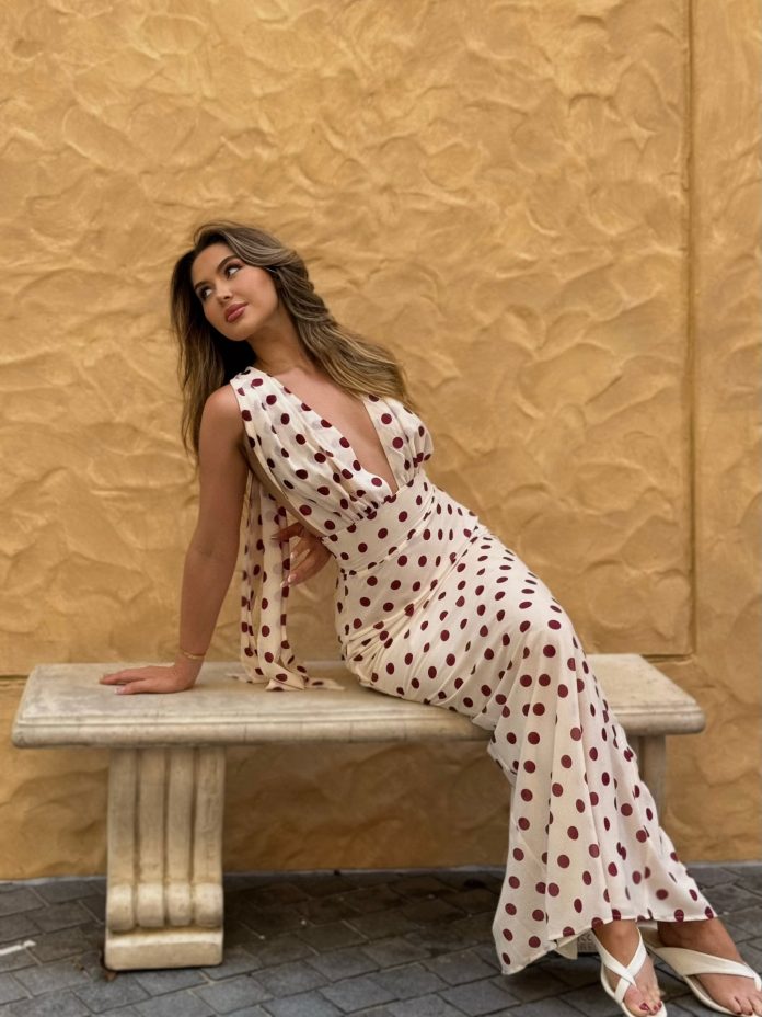 Model haljine se zove Nadine Halter Chiffon Maxi Dress, a dolazi u verziji boje bjelokosti s točkama boje vina, između ljubičaste i burgundy crvene. Uz halter vezanje oko vrata te usku siluetu koja savršeno naglašava liniju ženskog tijela, riječ je o haljini koja se odlično može uklopiti i u svečane lookove, ali i u casual prilike kada samo želite biti ‘malo sređeniji’. Bez obzira nosili je uz jednostavne sandale ili uz elegantne potpetice, uvijek izgleda sofisticirano.