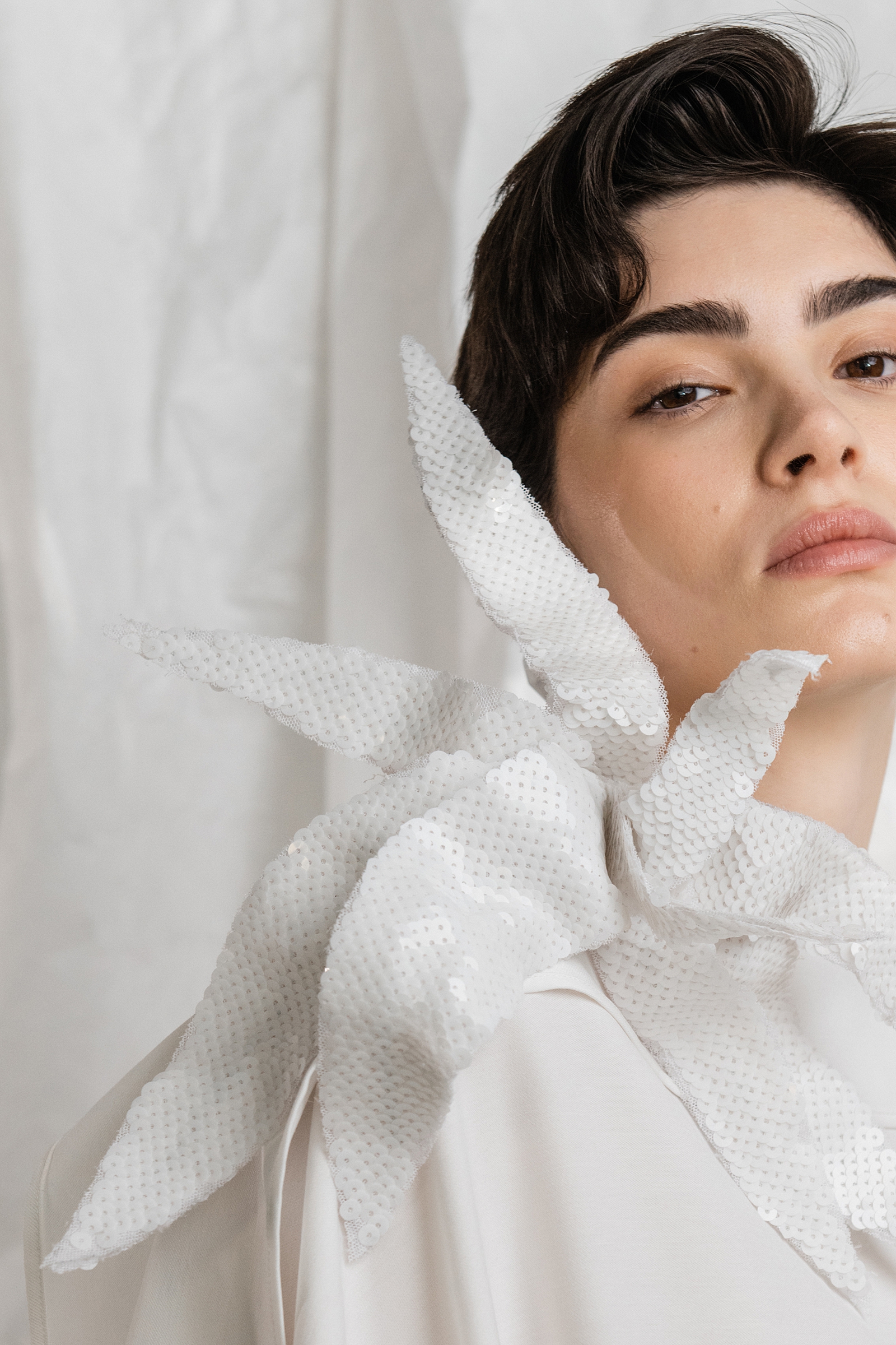 U fokusu LIMINAL-a su haljine i kombinezoni koji prate pokret tijela i oblikuju siluetu kroz meke, fluidne linije uz strukturirane komade poput blejzera, koji unose arhitektonsku preciznost i jasnoću. Poseban akcent čine ručno oblikovani cvjetni broševi, zamišljeni kao skulpturalni detalji koji postoje negdje između modnog dodatka i objekta.