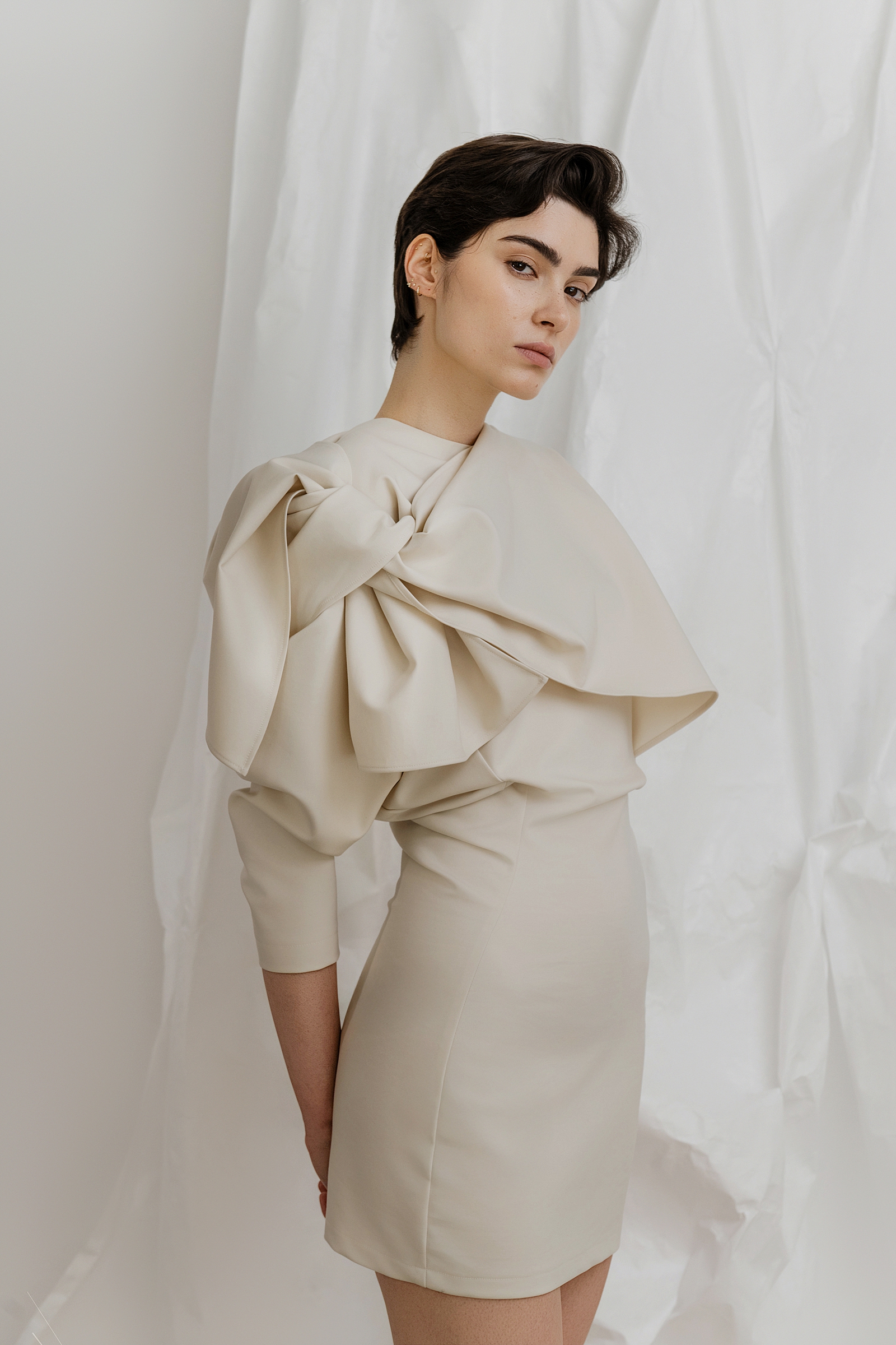 Posebna pažnja posvećena je odabiru materijala, gdje svaka tkanina nosi svoju ulogu u jeziku kolekcije. Svila se ističe preciznim padom i prirodnom lakoćom, nježno se prilagođavajući tijelu. Cupro, kao regenerirana celuloza, suptilno reagira na svjetlo mijenjajući svoj karakter s pokretom i promjenom ambijenta. Brušeni pamuk donosi taktilnu dimenziju: mekan, gotovo baršunast na dodir, s osjećajem koji nadilazi vizualni dojam. Prirodne i lepršave tkanine naglašavaju pokret i ugodu nošenja, oblikujući komade koji djeluju lako, ali s jasnom namjerom odražavajući ženstvenost koja je istovremeno prizemljena i izražajna, smirena i samouvjerena.
