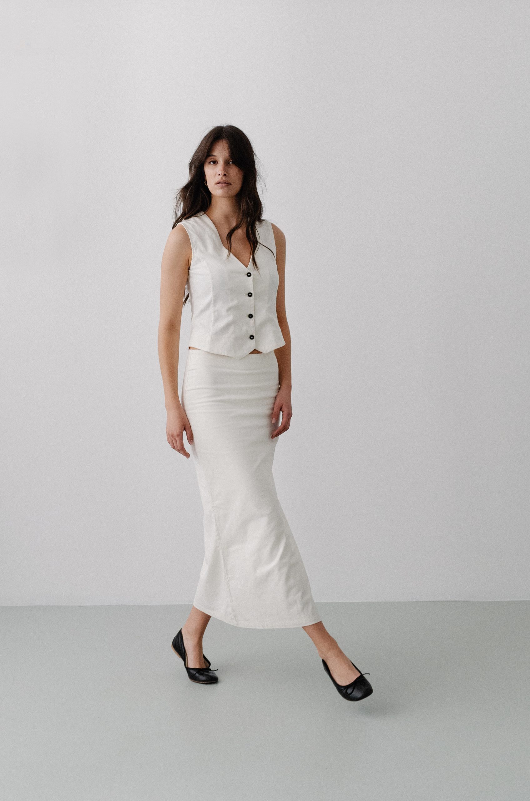 Kolekcija uključuje laneni prsluk i lanenu suknju: Dostupni u dvije boje, Mocha Dream i Ivory Breeze, ovi komadi su savršeni za sve prilike. Laneni prsluk nudi svestranost i može se nositi samostalno, dok lanena suknja donosi eleganciju i udobnost.