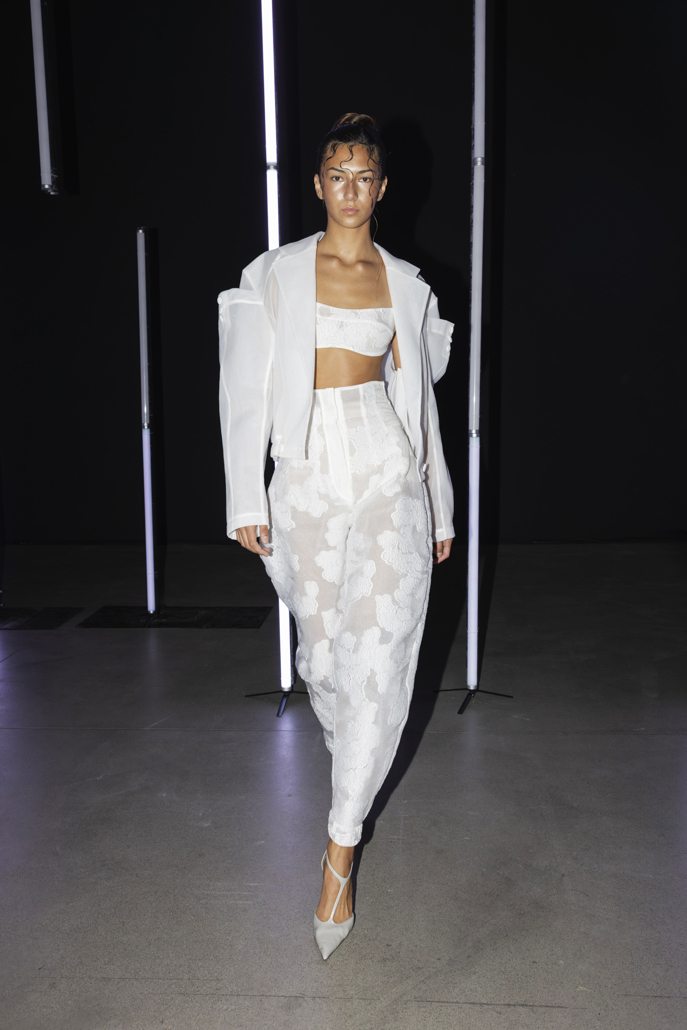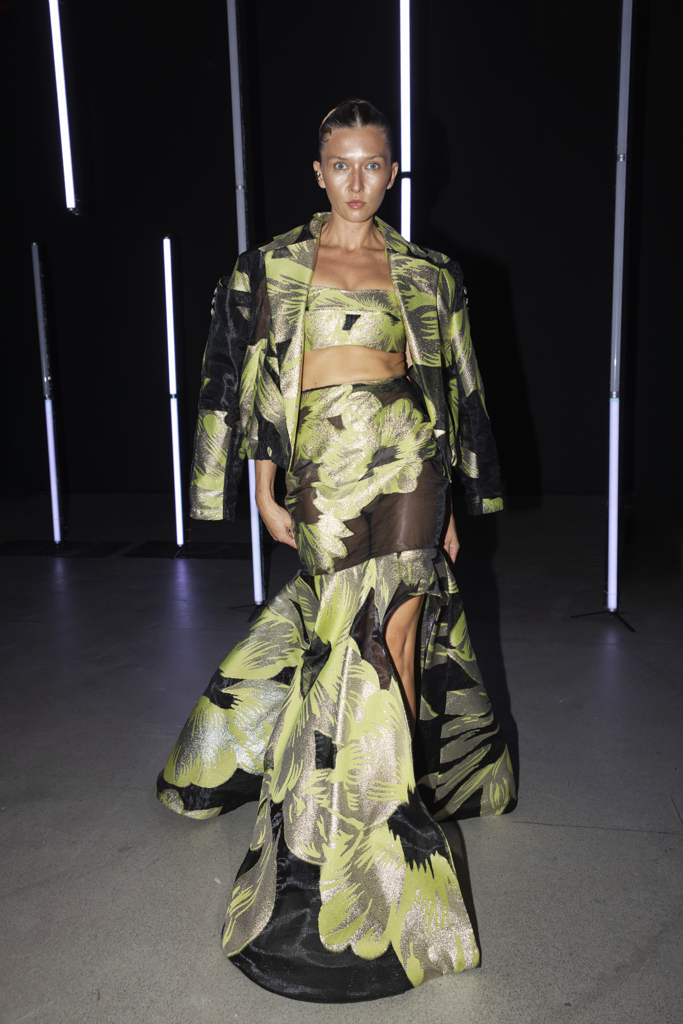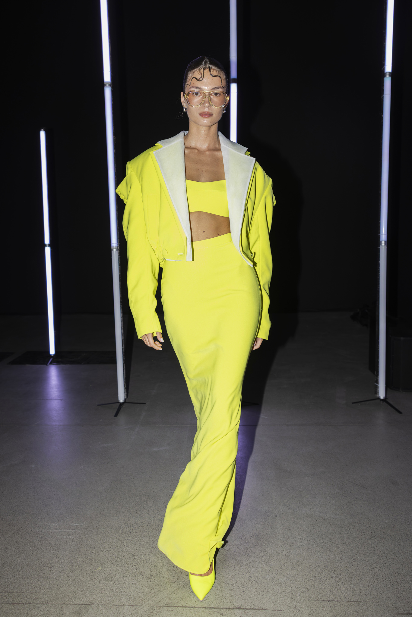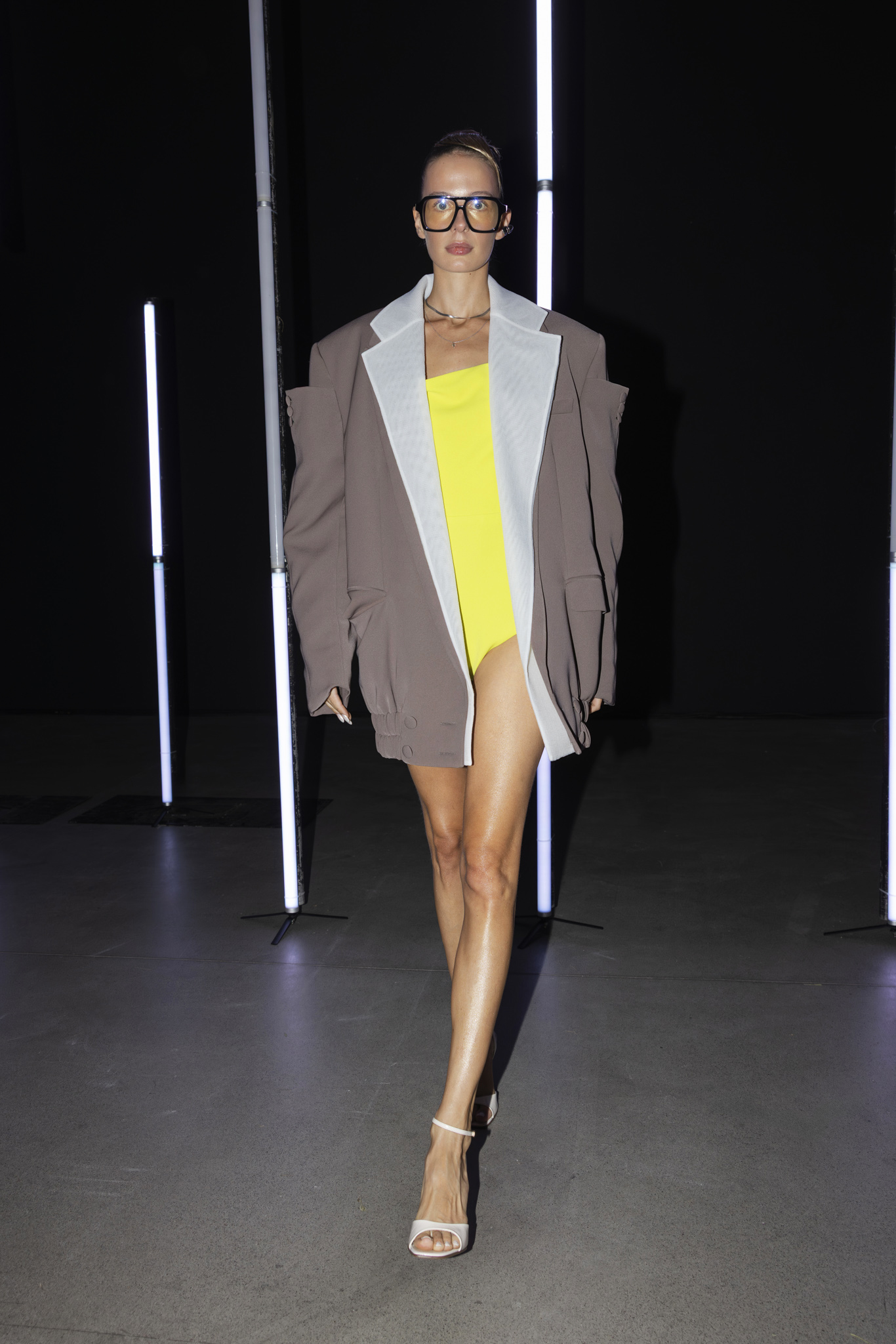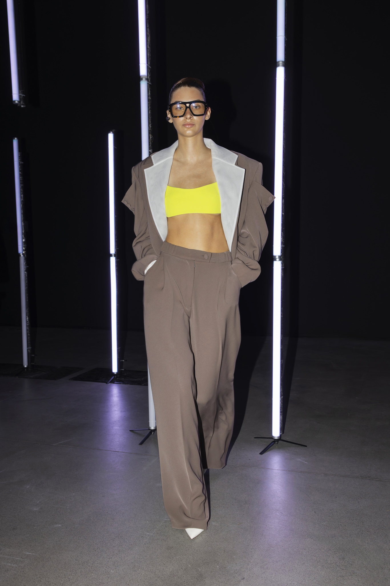 Paleta boja dodatno je podcrtala jasnoću koncepta: crna i bijela, kao temelj kontrastne igre, sofisticirana taupe nijansa, koja lebdi između sive i smeđe s maslinastim podtonom, kao znak promišljene suzdržanosti, te neonsko-žuta koja je u trenutku probijala ozbiljnost i unosila futuristički, električni naboj. Zvukovi odabrani za reviju nisu bili tek glazbena podloga, već savršeno iscrtana atmosfera kolekcije – ritmovi intenzivni i odlučni, mjestimice mračni, a ipak ispunjeni energijom koja je poticala osjećaj snage i samouvjerenosti na pisti.