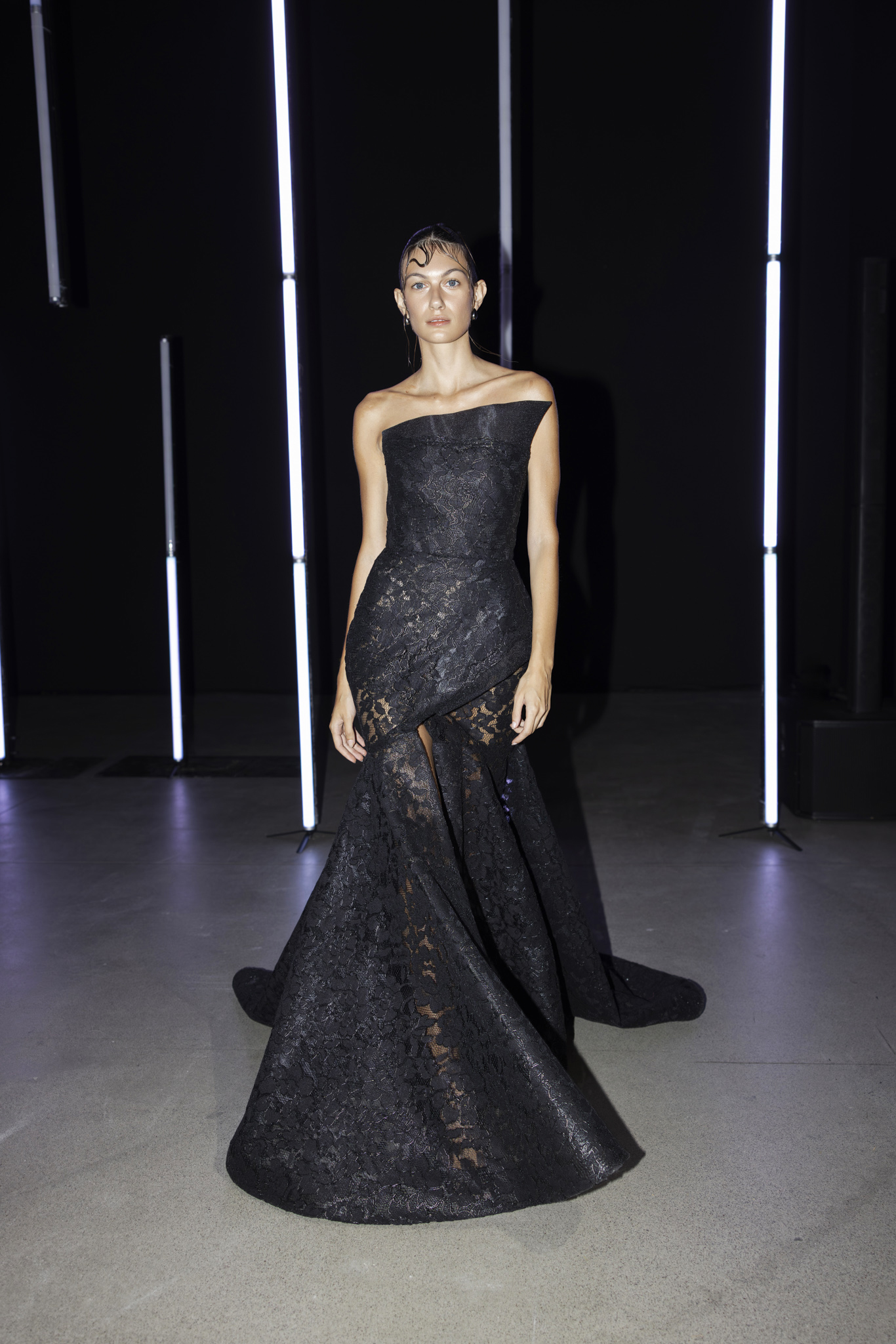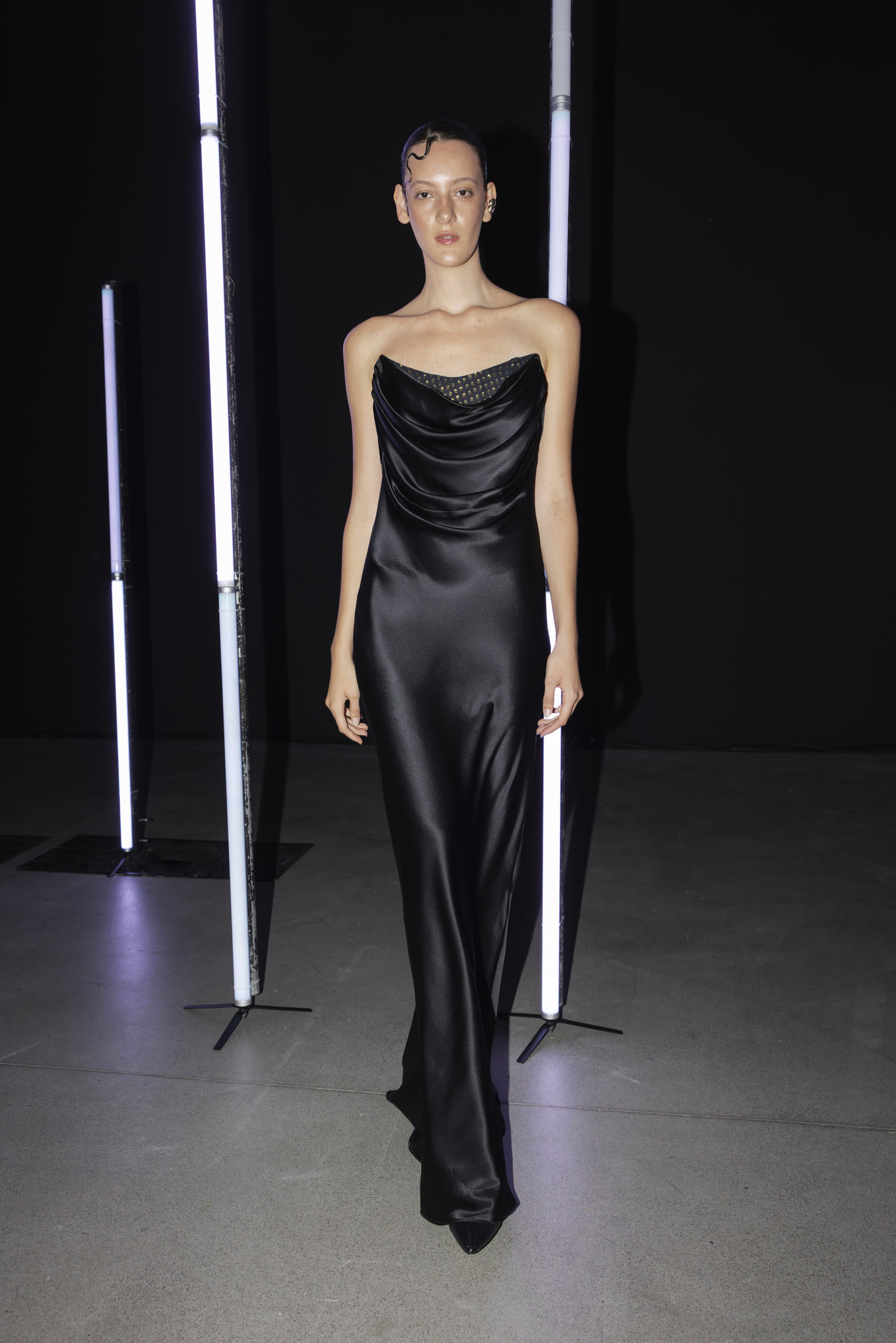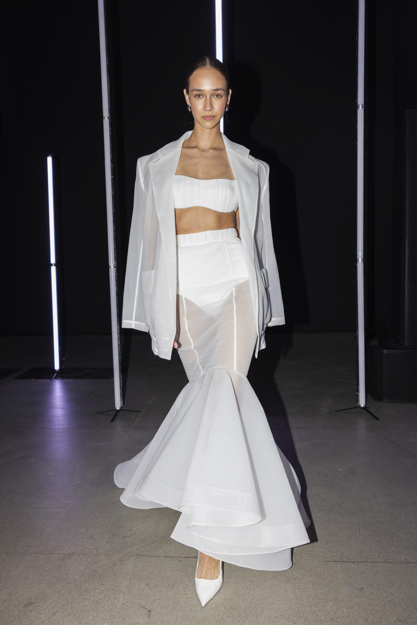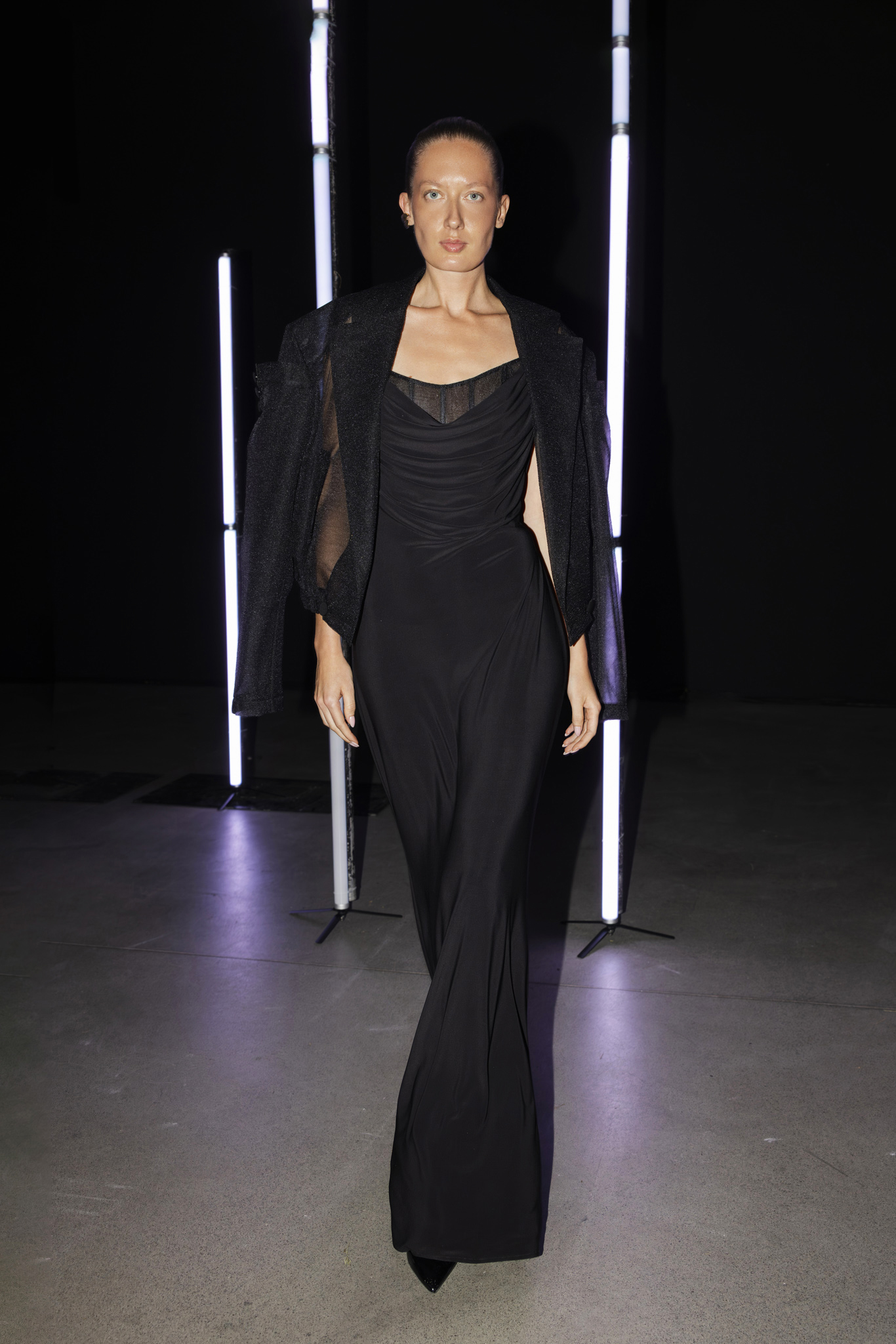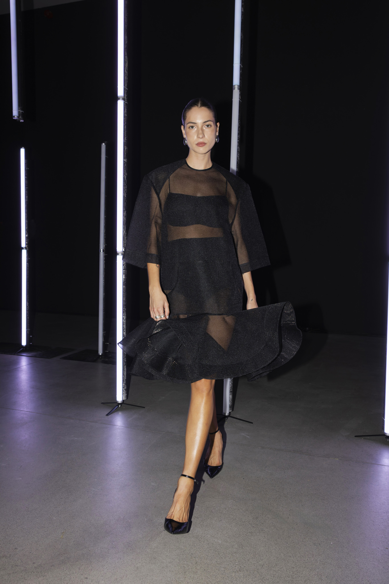 Paleta boja dodatno je podcrtala jasnoću koncepta: crna i bijela, kao temelj kontrastne igre, sofisticirana taupe nijansa, koja lebdi između sive i smeđe s maslinastim podtonom, kao znak promišljene suzdržanosti, te neonsko-žuta koja je u trenutku probijala ozbiljnost i unosila futuristički, električni naboj. Zvukovi odabrani za reviju nisu bili tek glazbena podloga, već savršeno iscrtana atmosfera kolekcije – ritmovi intenzivni i odlučni, mjestimice mračni, a ipak ispunjeni energijom koja je poticala osjećaj snage i samouvjerenosti na pisti.
