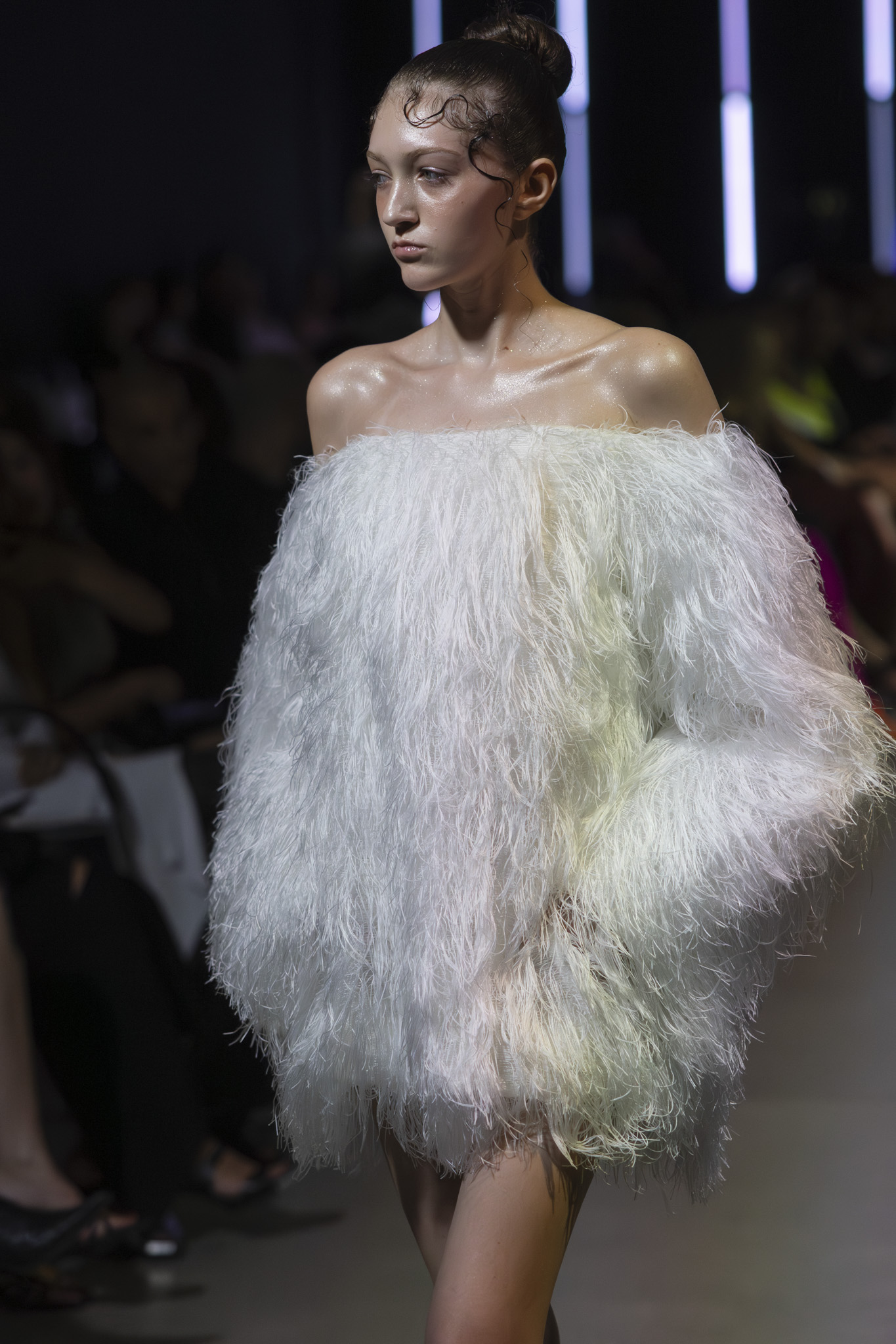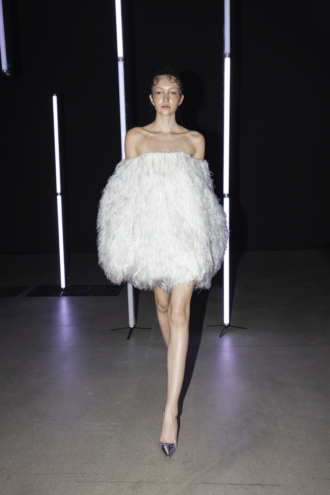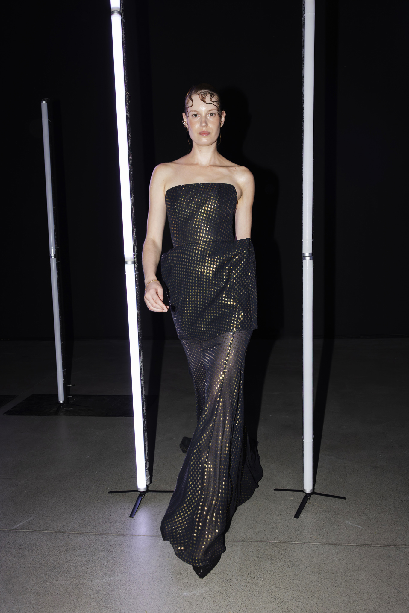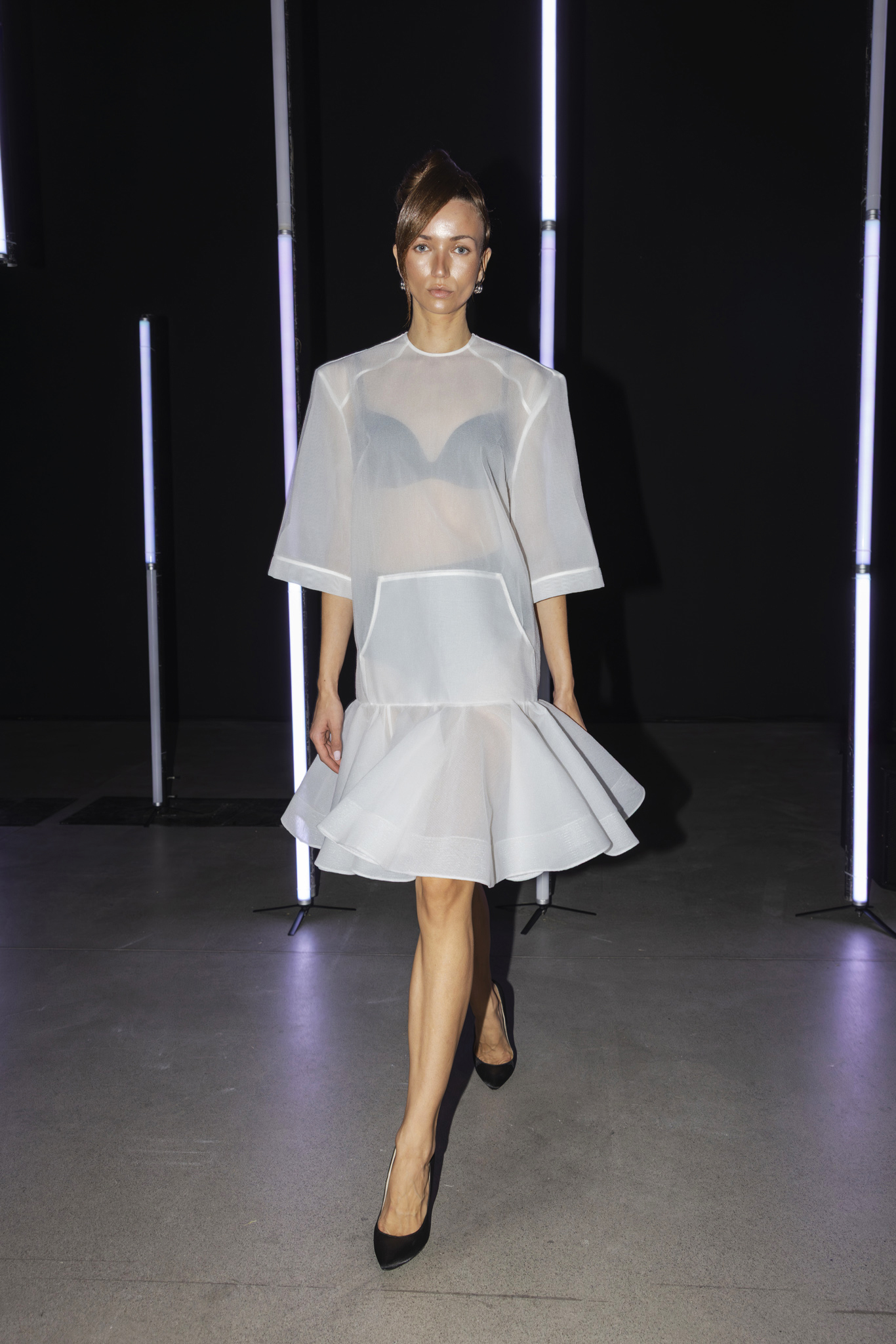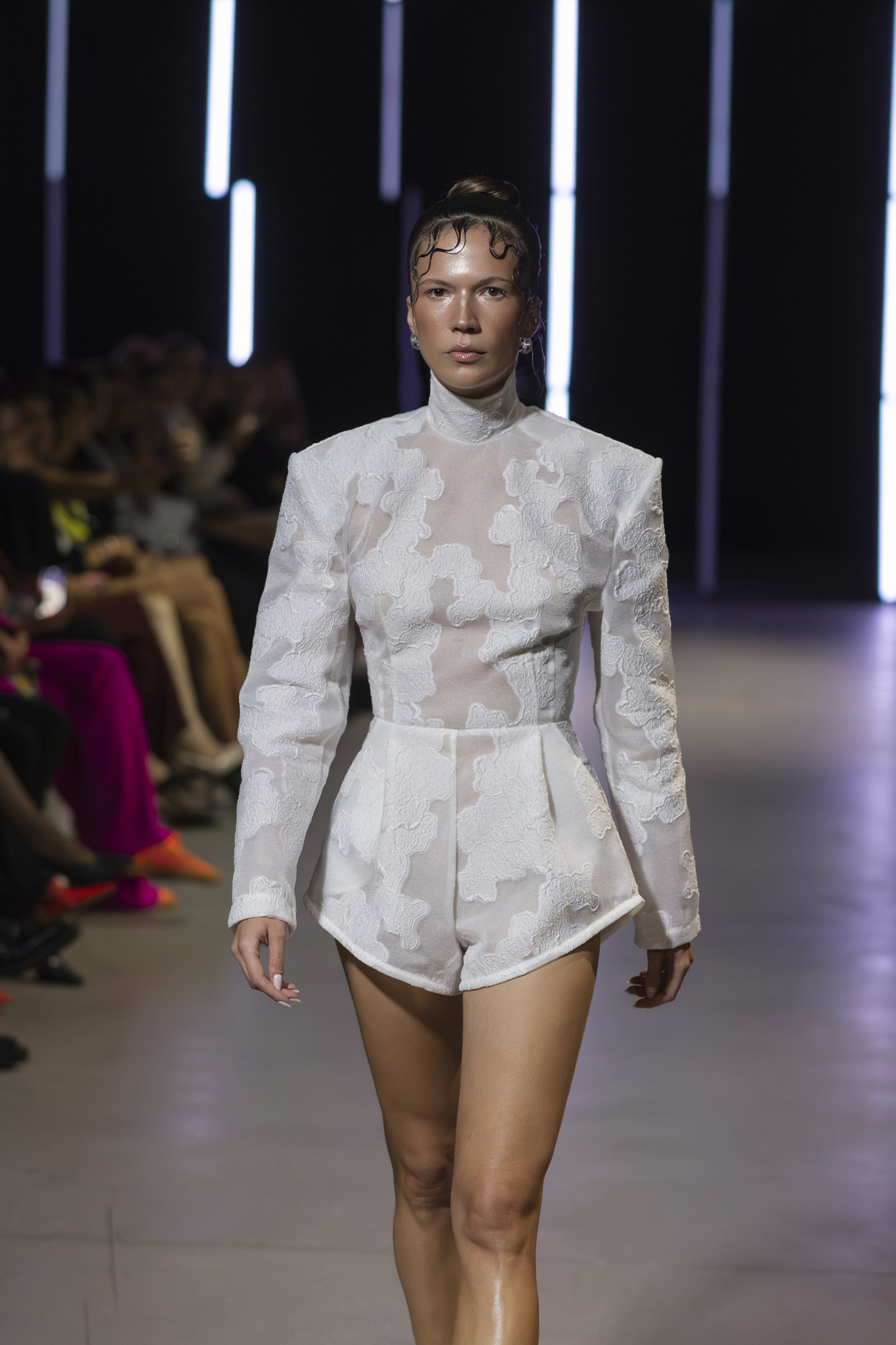 Paleta boja dodatno je podcrtala jasnoću koncepta: crna i bijela, kao temelj kontrastne igre, sofisticirana taupe nijansa, koja lebdi između sive i smeđe s maslinastim podtonom, kao znak promišljene suzdržanosti, te neonsko-žuta koja je u trenutku probijala ozbiljnost i unosila futuristički, električni naboj. Zvukovi odabrani za reviju nisu bili tek glazbena podloga, već savršeno iscrtana atmosfera kolekcije – ritmovi intenzivni i odlučni, mjestimice mračni, a ipak ispunjeni energijom koja je poticala osjećaj snage i samouvjerenosti na pisti.