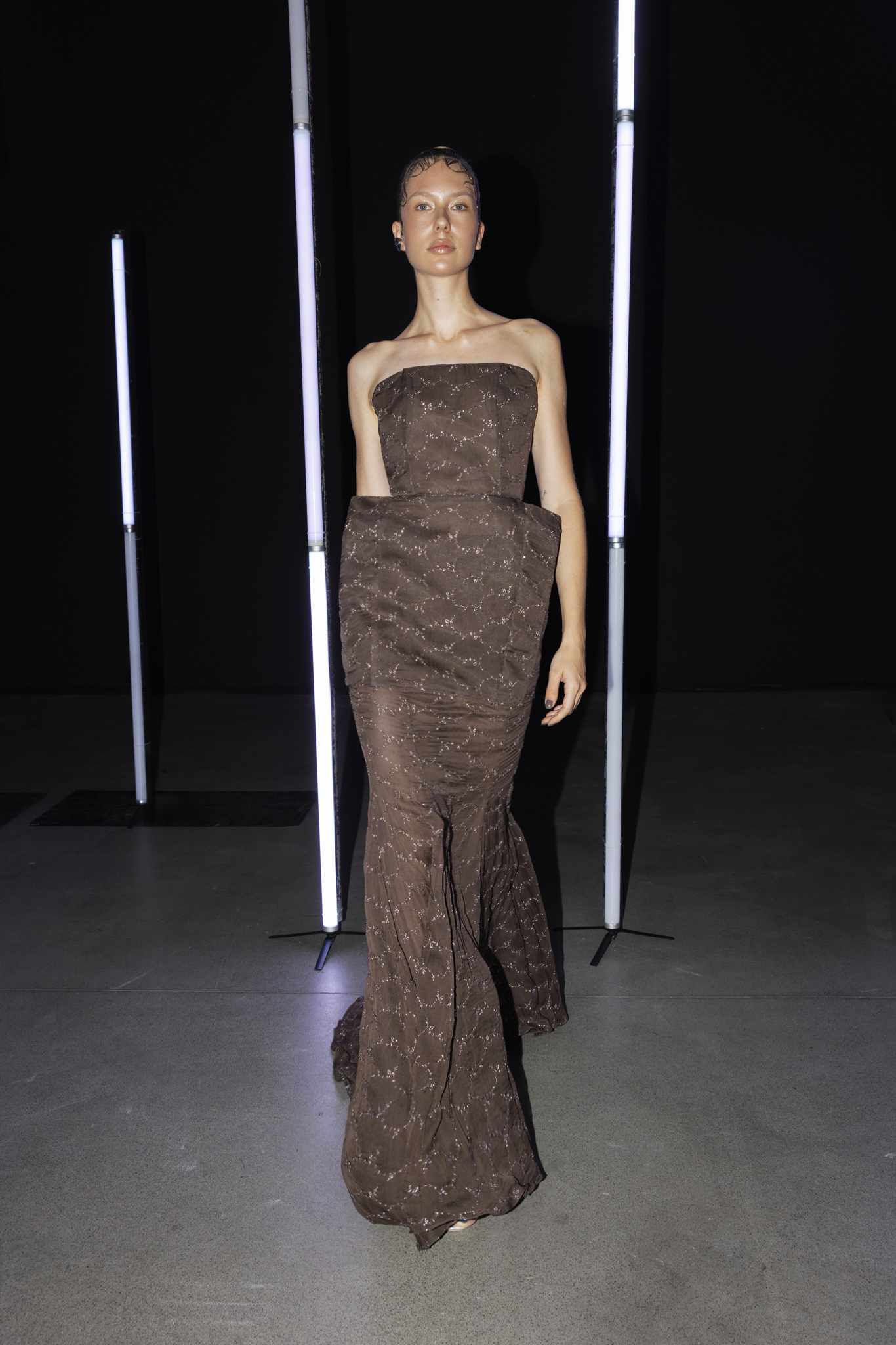 Večer je započela izložbom eNVision, realiziranom u suradnji s Tekstilno-tehnološkim fakultetom, koja je već u najavama privukla veliko zanimanje javnosti. Publika je imala priliku napokon uživo doživjeti radove studenata koji su reinterpretirali arhivske bridal kolekcije eNVy rooma i pretvorili ih u posve nove kreacije – od ready-to-wear komada do odvažnih avangardnih eksperimenata – izložene ispred monumentalnog ekrana u predvorju MSU-a. Upravo taj vizualni dijalog arhivskih silueta i mladenačkih vizija bio je snažna točka večeri, koja je naglasila koliko je važno da mladi dizajneri dobiju priliku i vidljivost.