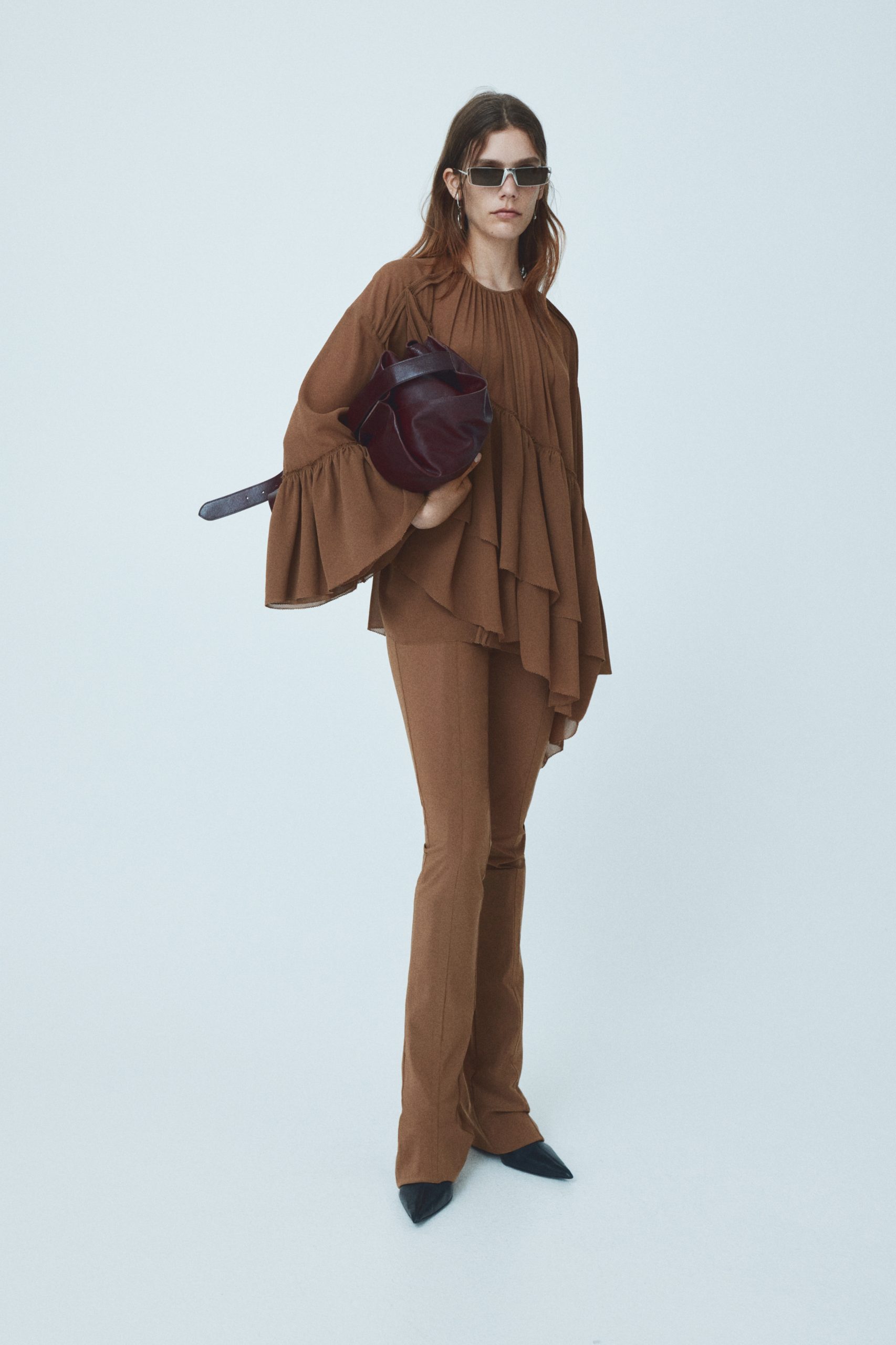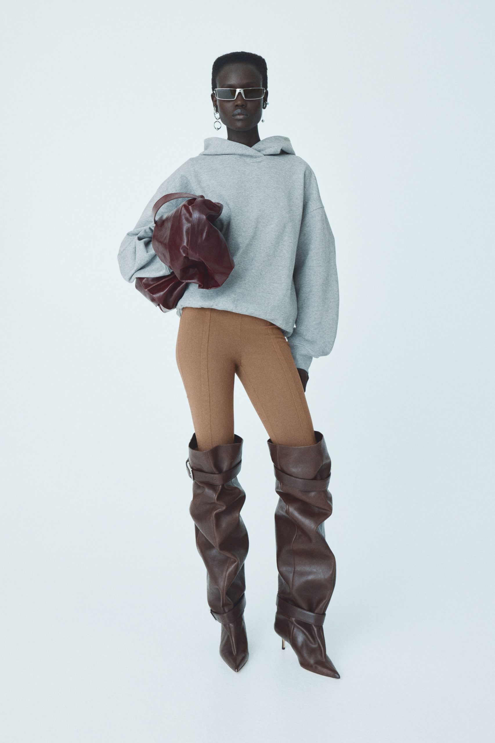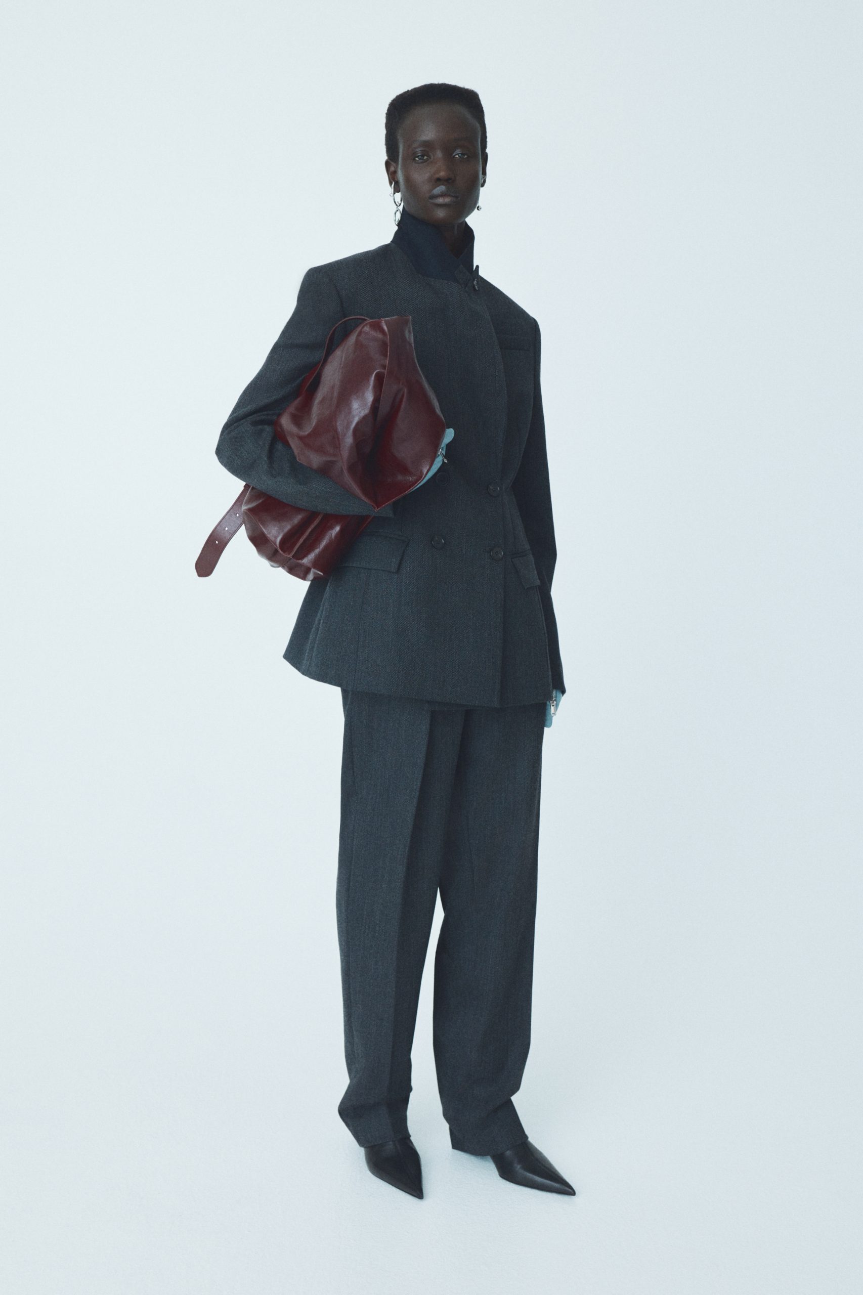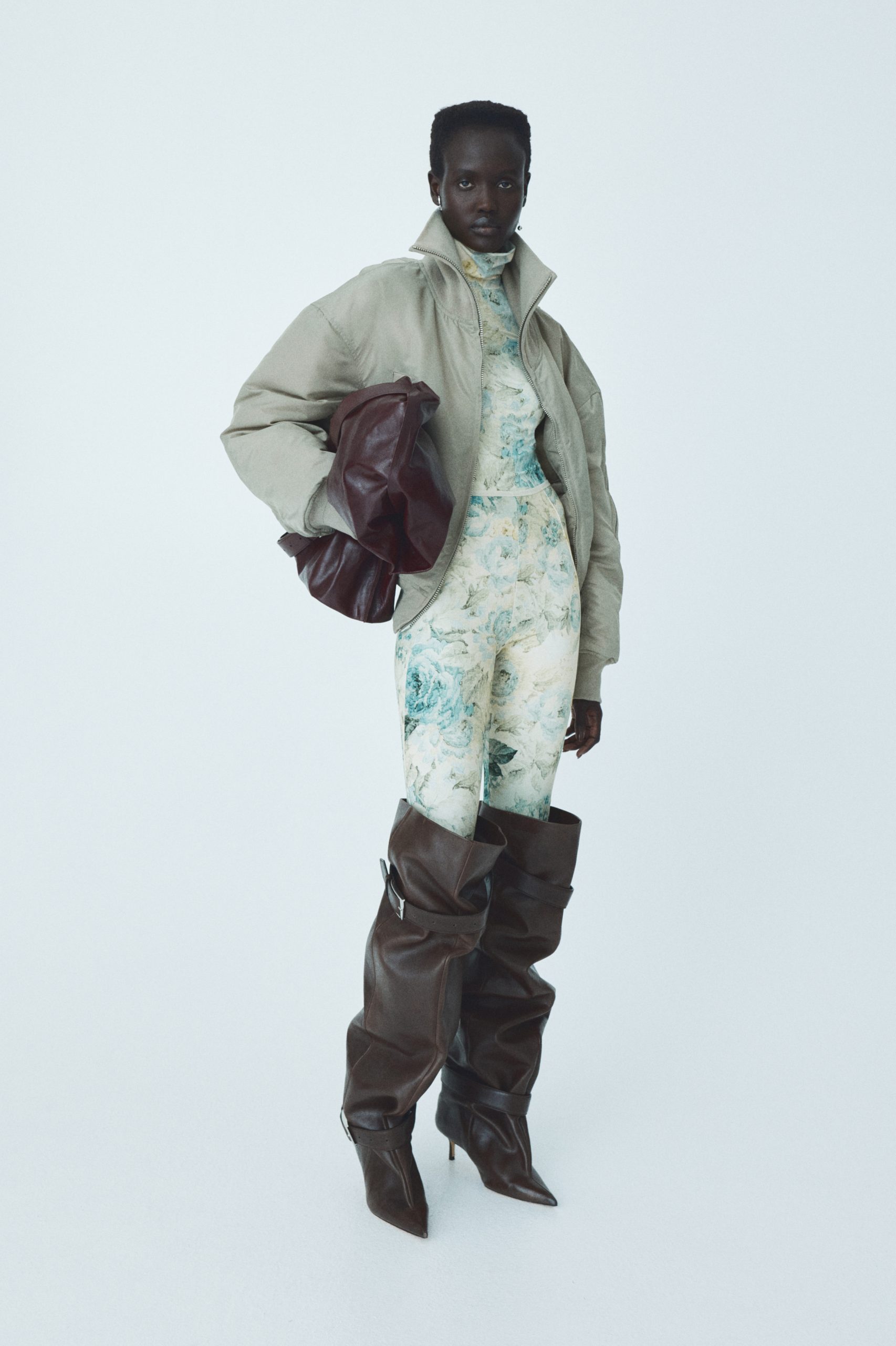 Materijali su prikazani u svom izvornom obliku, dok paleta boja – smeđa, tamnoplava, crna i betonsko siva – odaje počast brutalizmu. Akcenti u crvenoj, ružičastoj, plavoj te vintage cvjetni uzorak unose vibrantnu kreativnu energiju. Modni dodaci uključuju tamnosmeđe kožne čizme na petu s odvojivim kopčama, veliku mekano nabranu torbu od bordo kože, kožne rukavice u plavoj nijansi te upečatljive naušnice i manžete za uši.