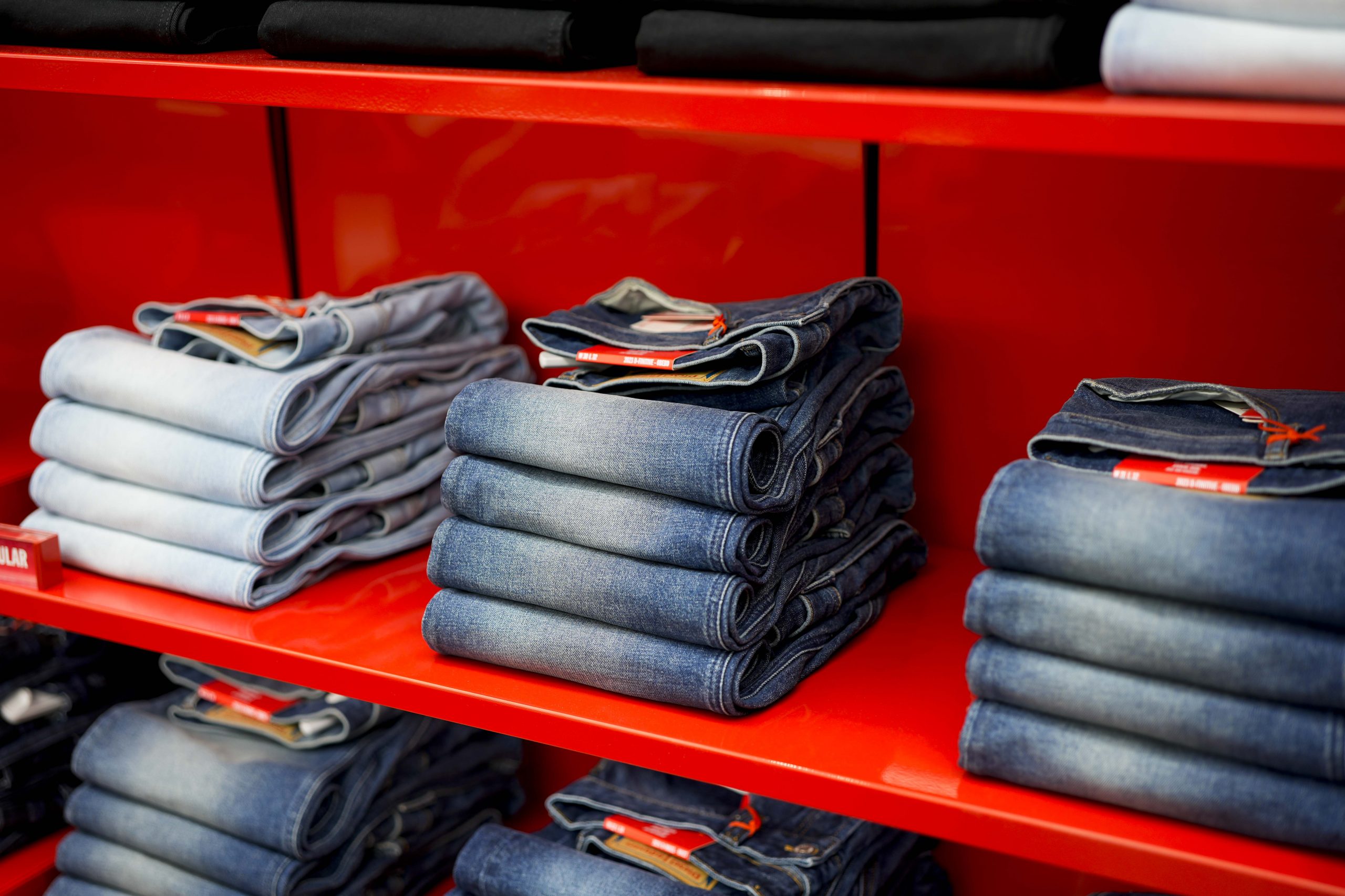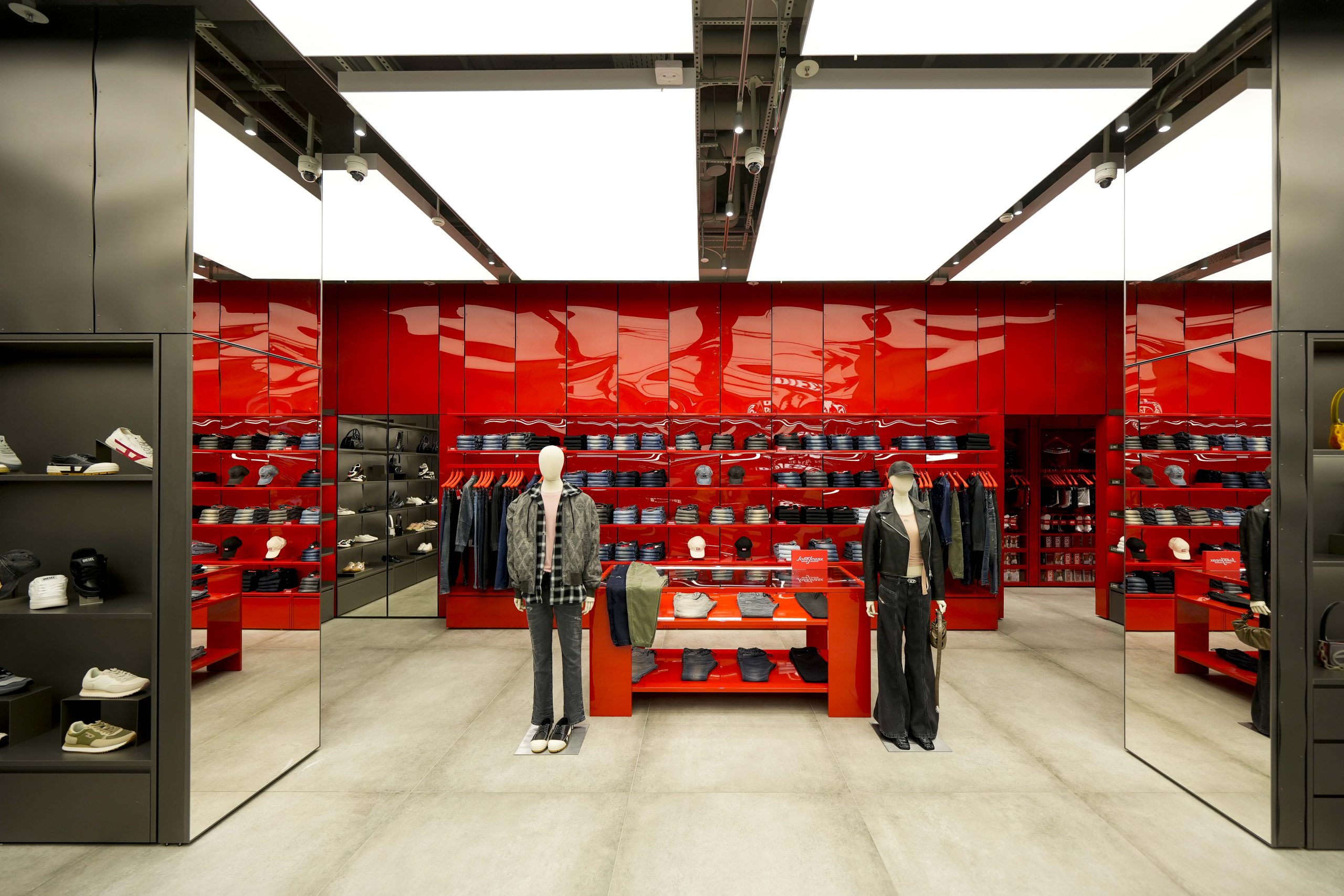 Centralni dio trgovine rezerviran je za denim kolekcije, srce Diesel identiteta. Police i izložbeni moduli ispunjeni su različitim krojevima trapera – od klasičnih modela do suvremenih reinterpretacija koje Diesel već desetljećima čine jednim od najutjecajnijih brendova u svijetu jeansa.