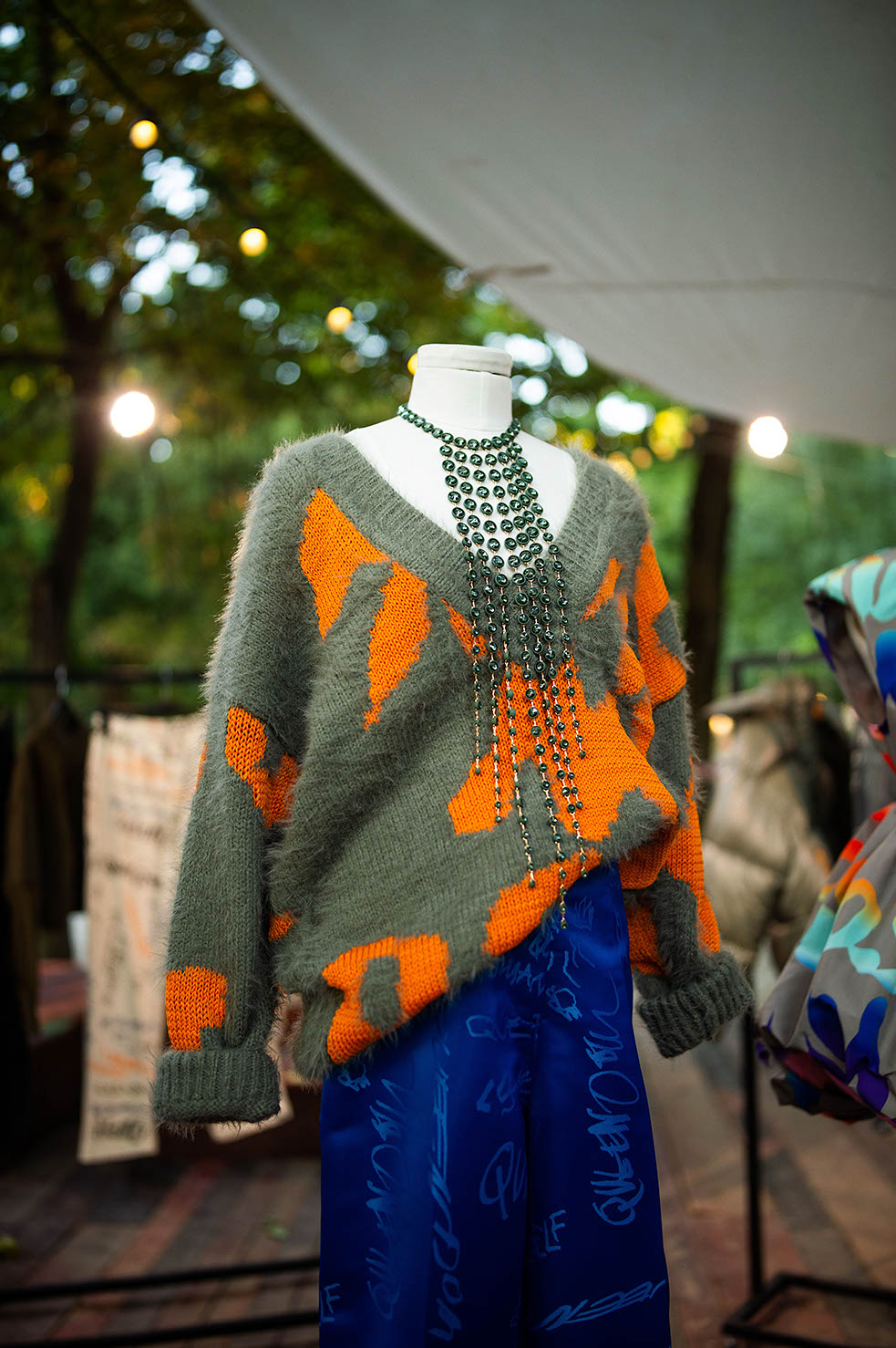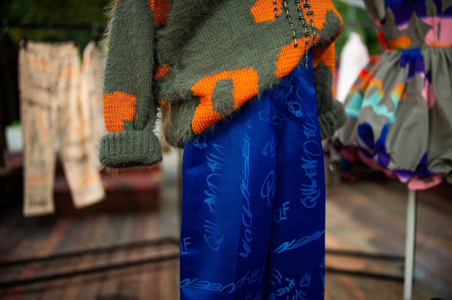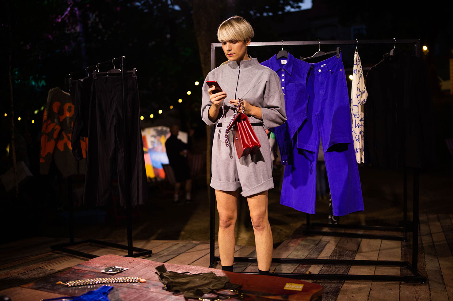 “Puffer“ jakne, mini plesna „puff“ haljina i niz hlača širokih nogavica sa zanimljivim otvorima na koljenima ključni su komadi. Svakako valja istaknuti i suvremenu varijaciju trodijelnog prugastog odijela: uska jakna i prsluk u kombinaciji s hlačama vrećastog kroja. Mrežasti topovi posuti umjetnim dragim kamenjem, kao i poput druge kože uski kombinezoni i tajice, hrabro mijenjaju i naglašavaju siluetu. Modni dodaci miješajući glamur i borbenost drže se načela maksimalizma – “više je više” pa nas očekuju gumene ogrlice prstenastog oblika i „choker” koji podsjeća na vodopad u kombinaciji sa željeznim kopčama, koje sadržavaju reciklirani cink i mjed. “Stiletto” čizme visokih potpetica s krupnim potplatom i teške gumene čizme, djelomično su izrađene od VEGEE, biljne alternative životinjskoj koži, od kože grožđa odbačene u procesu proizvodnje vina, što donosi posebnu draž večernjim kombinacijama.