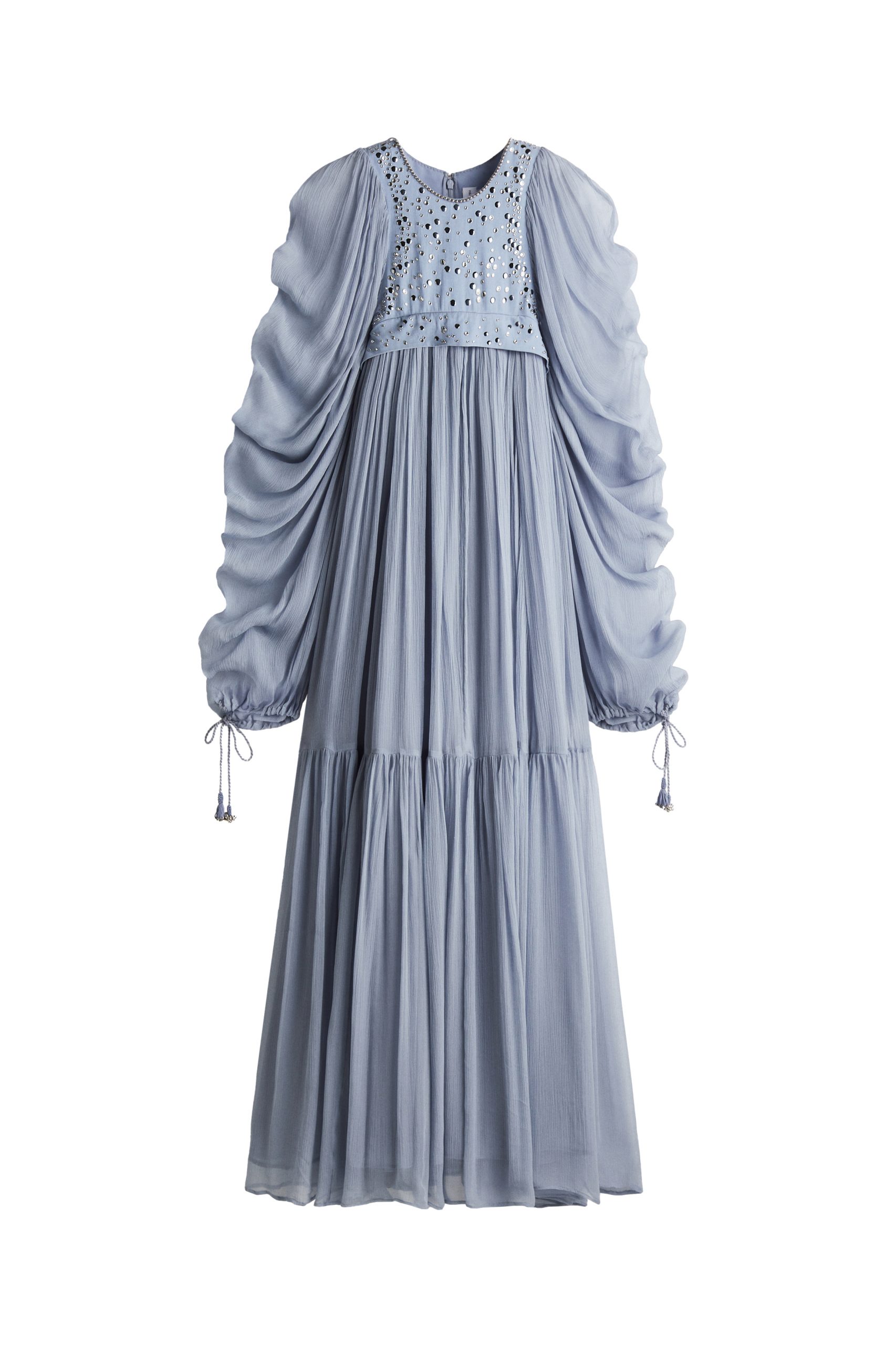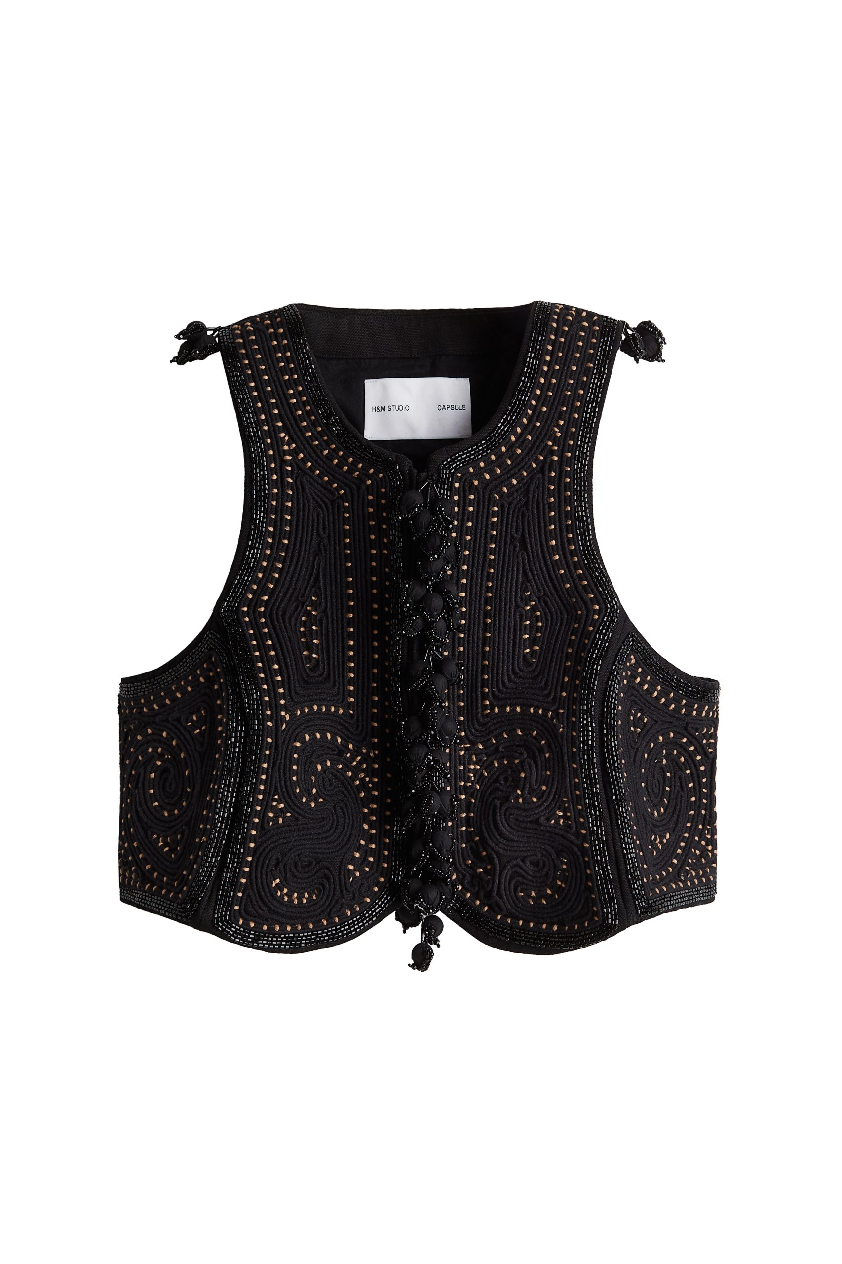 Crni kratki prsluk ima kontrastne šavove, obložene gumbe, perle na porubu i male rese. Plava maksi haljina ima prozirne rukave, detalje sa zakovicama, nabore i izrez na leđima. Bijela košulja od teškog pamučnog popelina također ima bočne izreze za oštriji izgled. Široke hlače koje ju prate imaju opušteni kroj s vezanjem u struku i detaljima s resama.