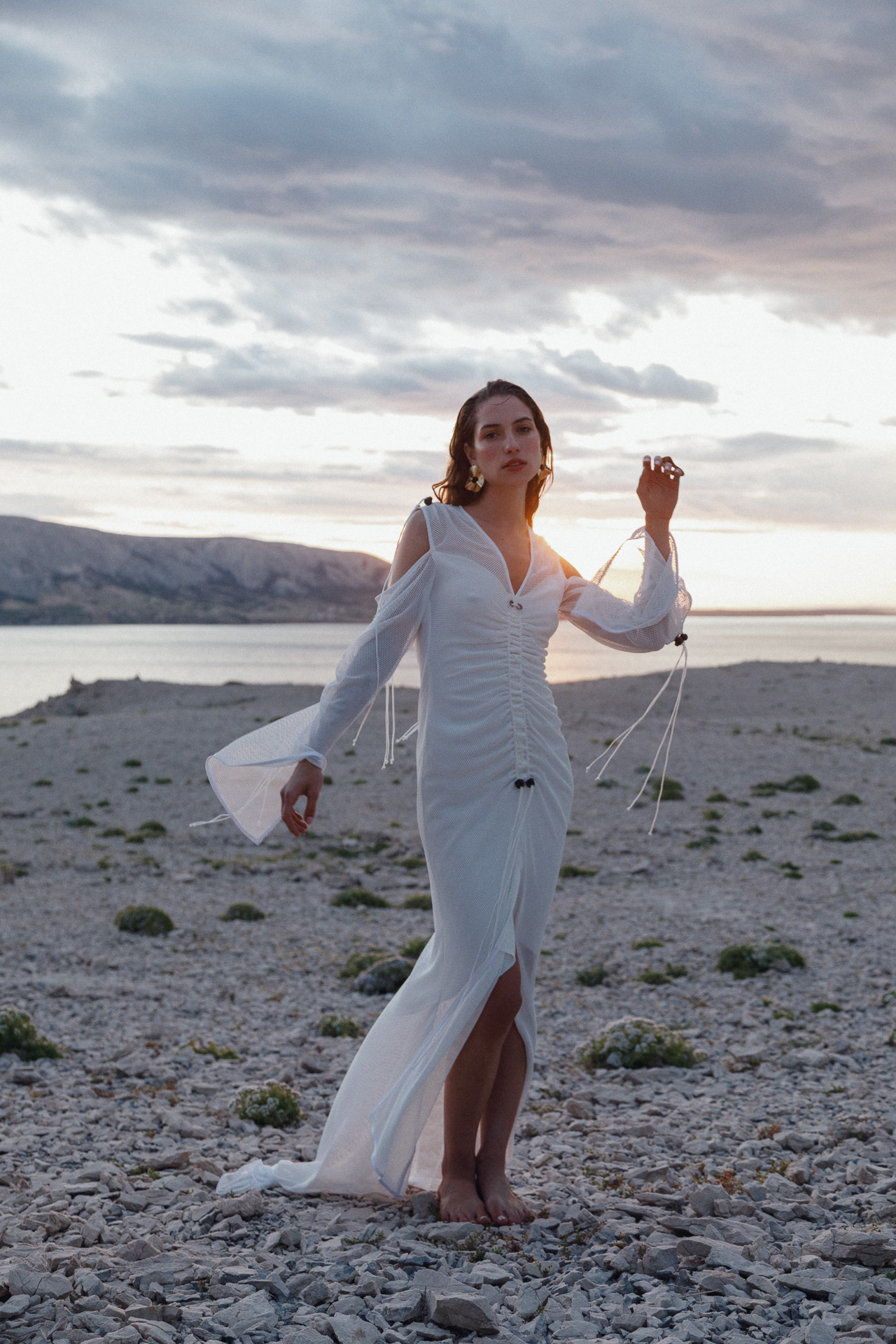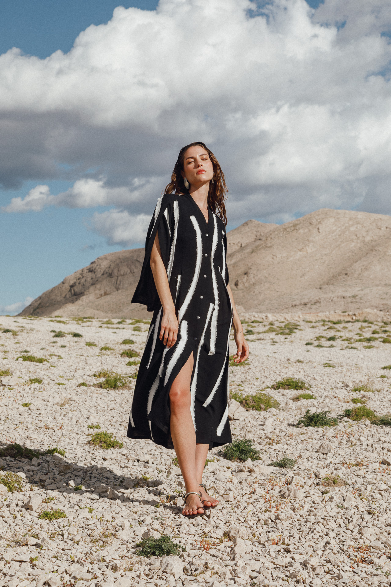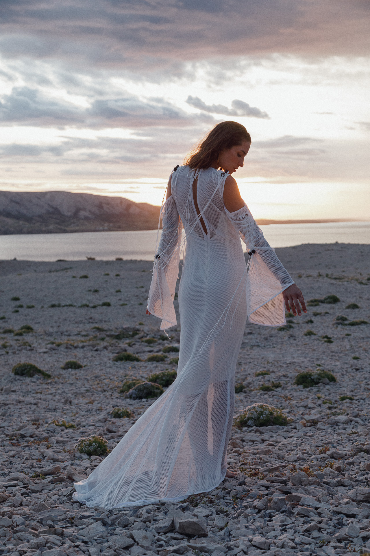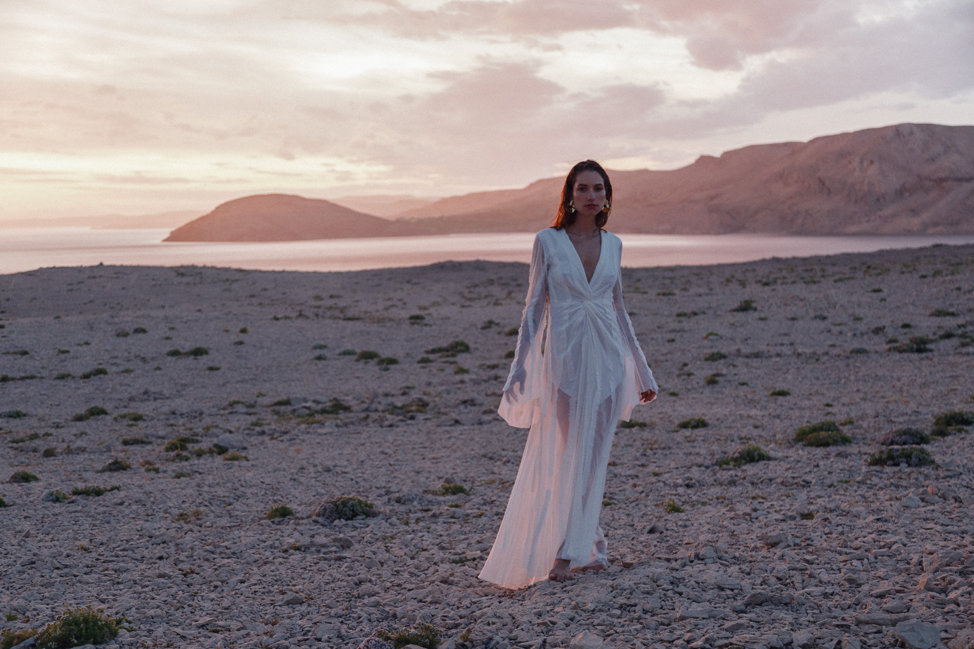 Fotografirana na Pagu, među stijenama lišenima vegetacije, kolekcija vizualno pulsira poput egzotičnog cvijeta na mjestu gdje ga najmanje očekujete. Vjetar koji je nosio tkanine tijekom snimanja savršeno je oživio ideju lepršavosti i lakoće odjevnih komada.