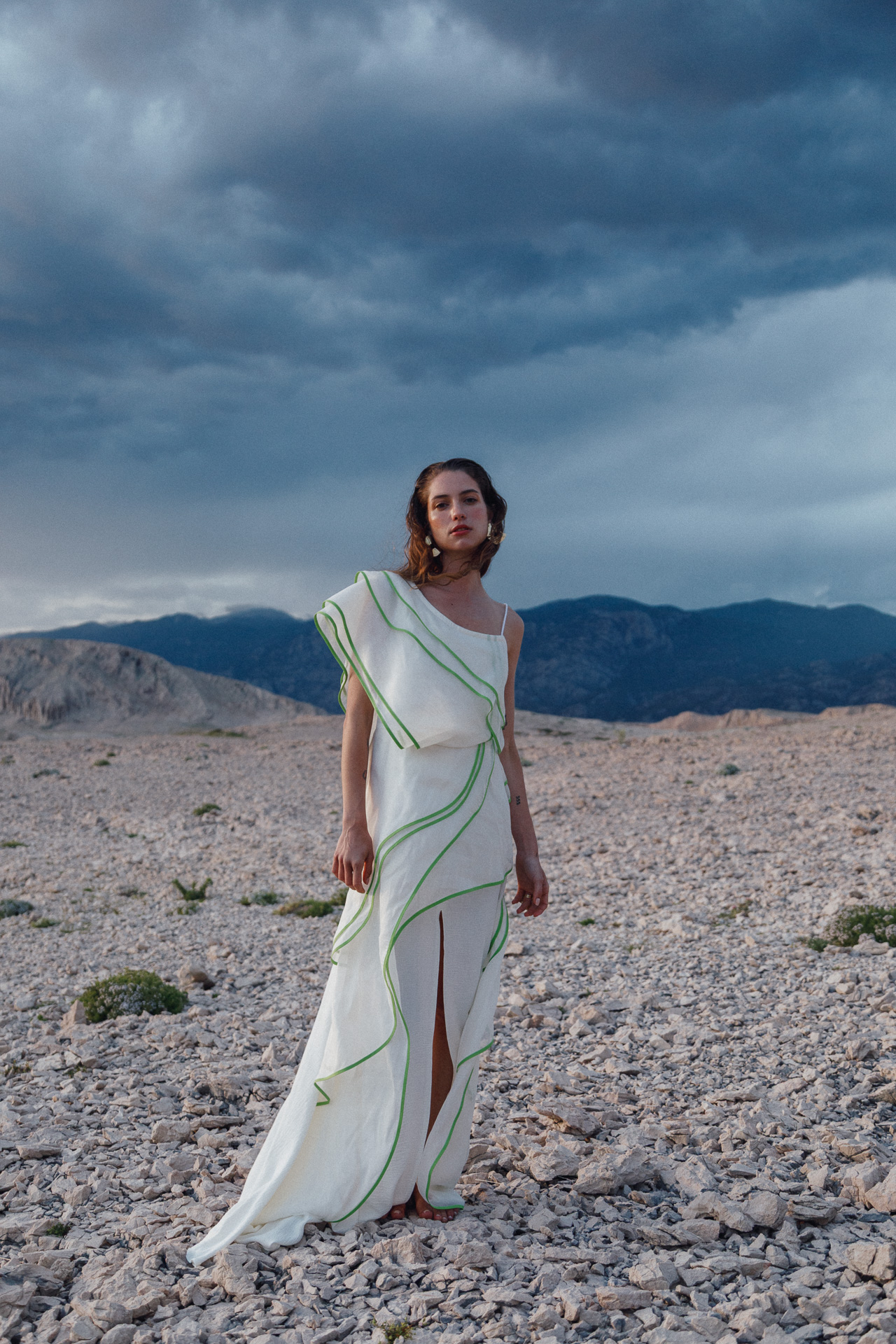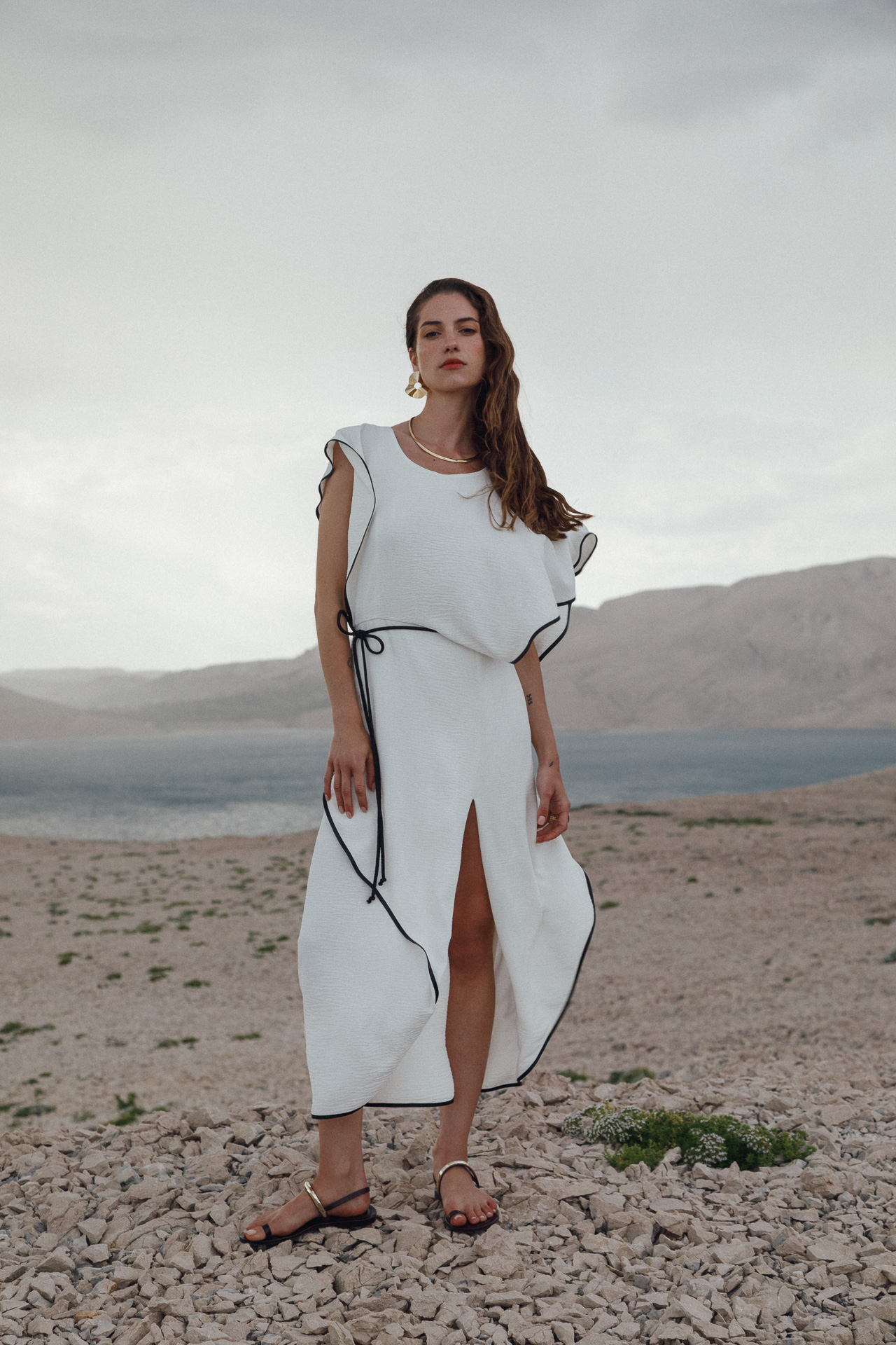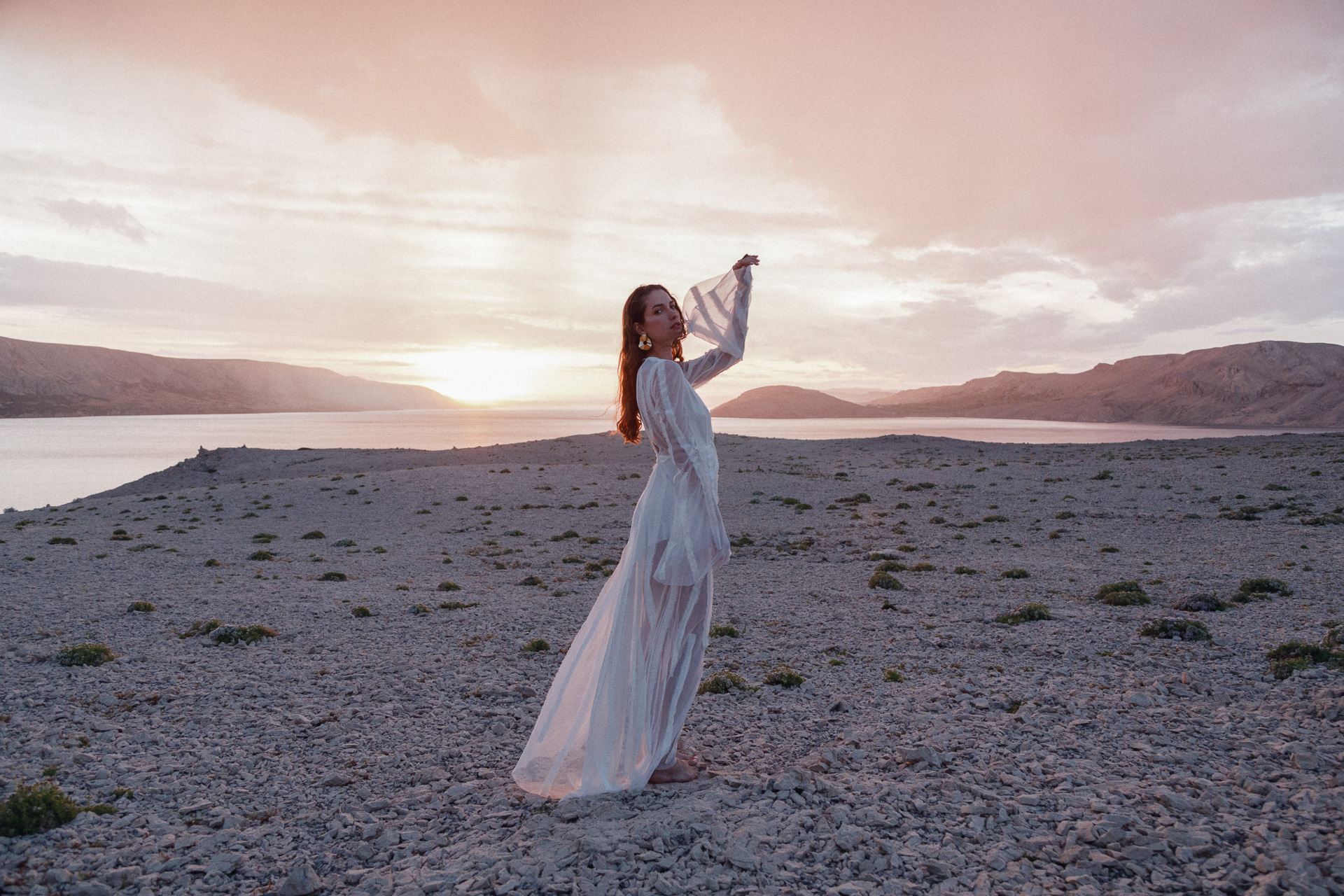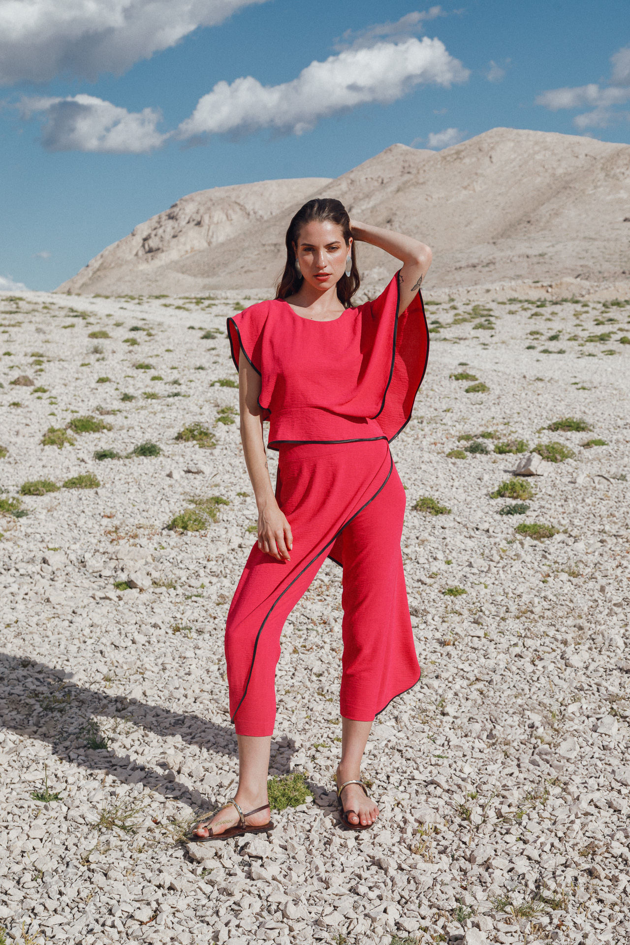 Fotografirana na Pagu, među stijenama lišenima vegetacije, kolekcija vizualno pulsira poput egzotičnog cvijeta na mjestu gdje ga najmanje očekujete. Vjetar koji je nosio tkanine tijekom snimanja savršeno je oživio ideju lepršavosti i lakoće odjevnih komada.