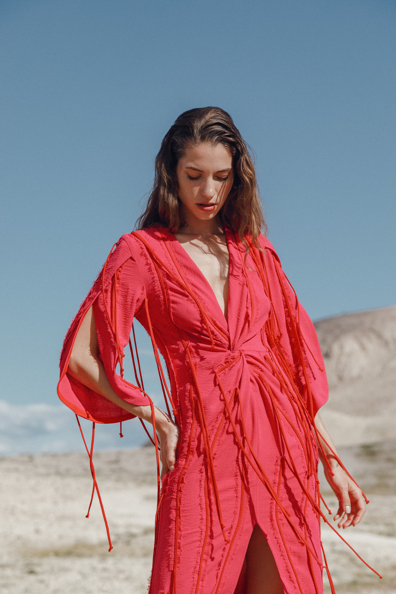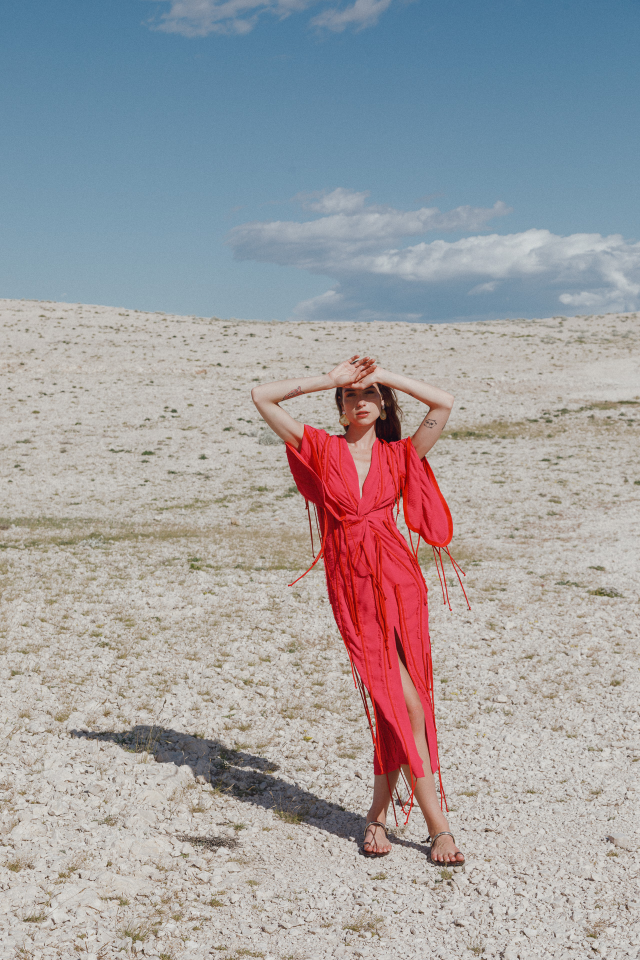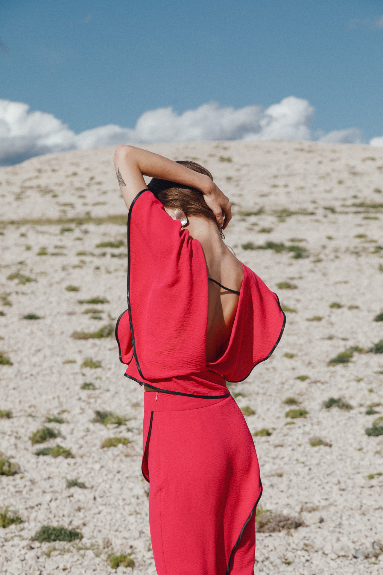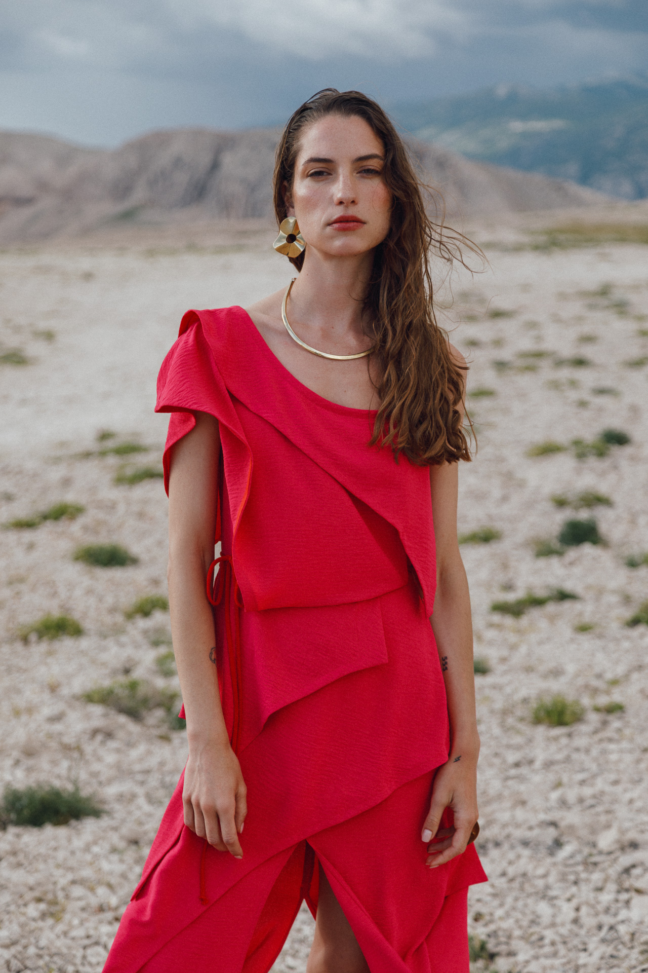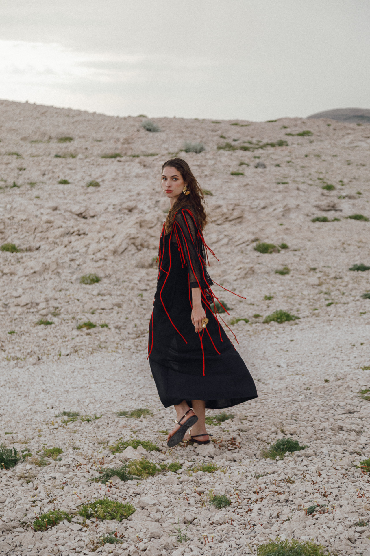 Fotografirana na Pagu, među stijenama lišenima vegetacije, kolekcija vizualno pulsira poput egzotičnog cvijeta na mjestu gdje ga najmanje očekujete. Vjetar koji je nosio tkanine tijekom snimanja savršeno je oživio ideju lepršavosti i lakoće odjevnih komada.