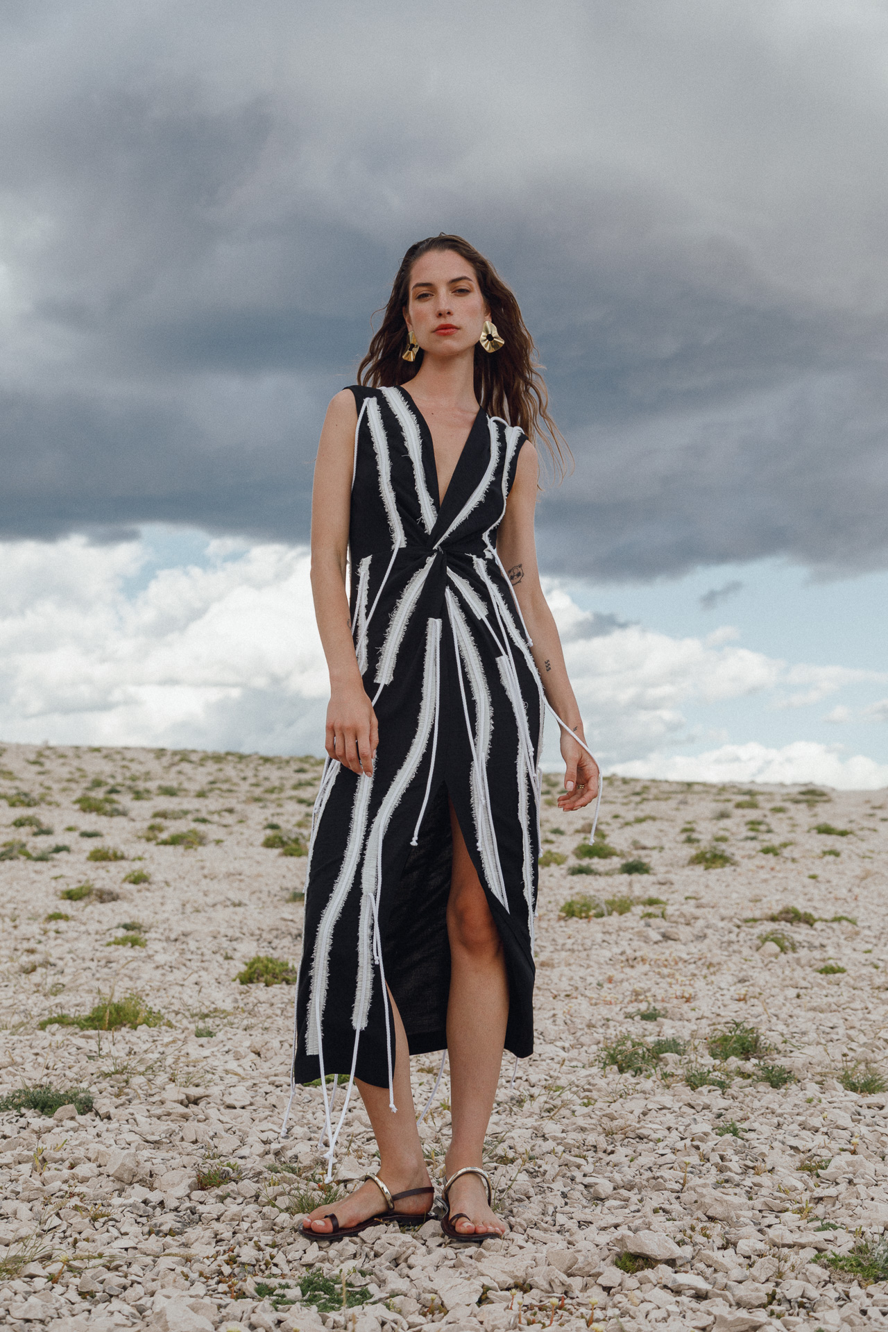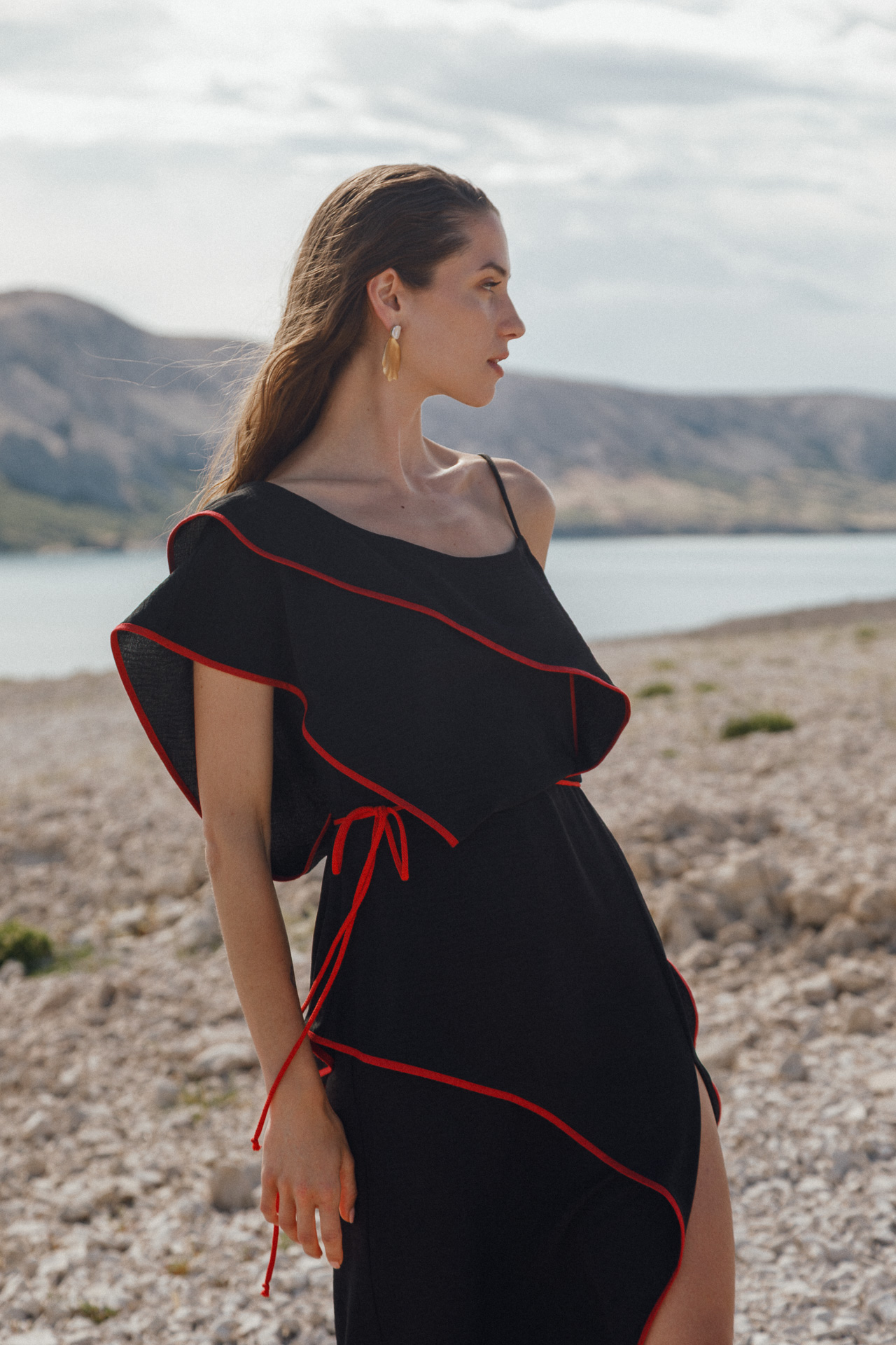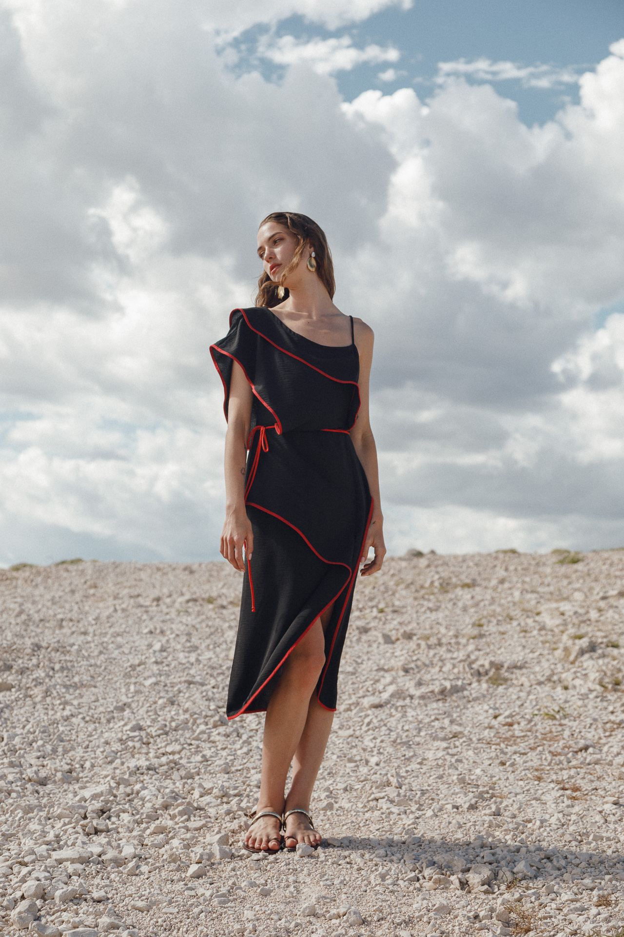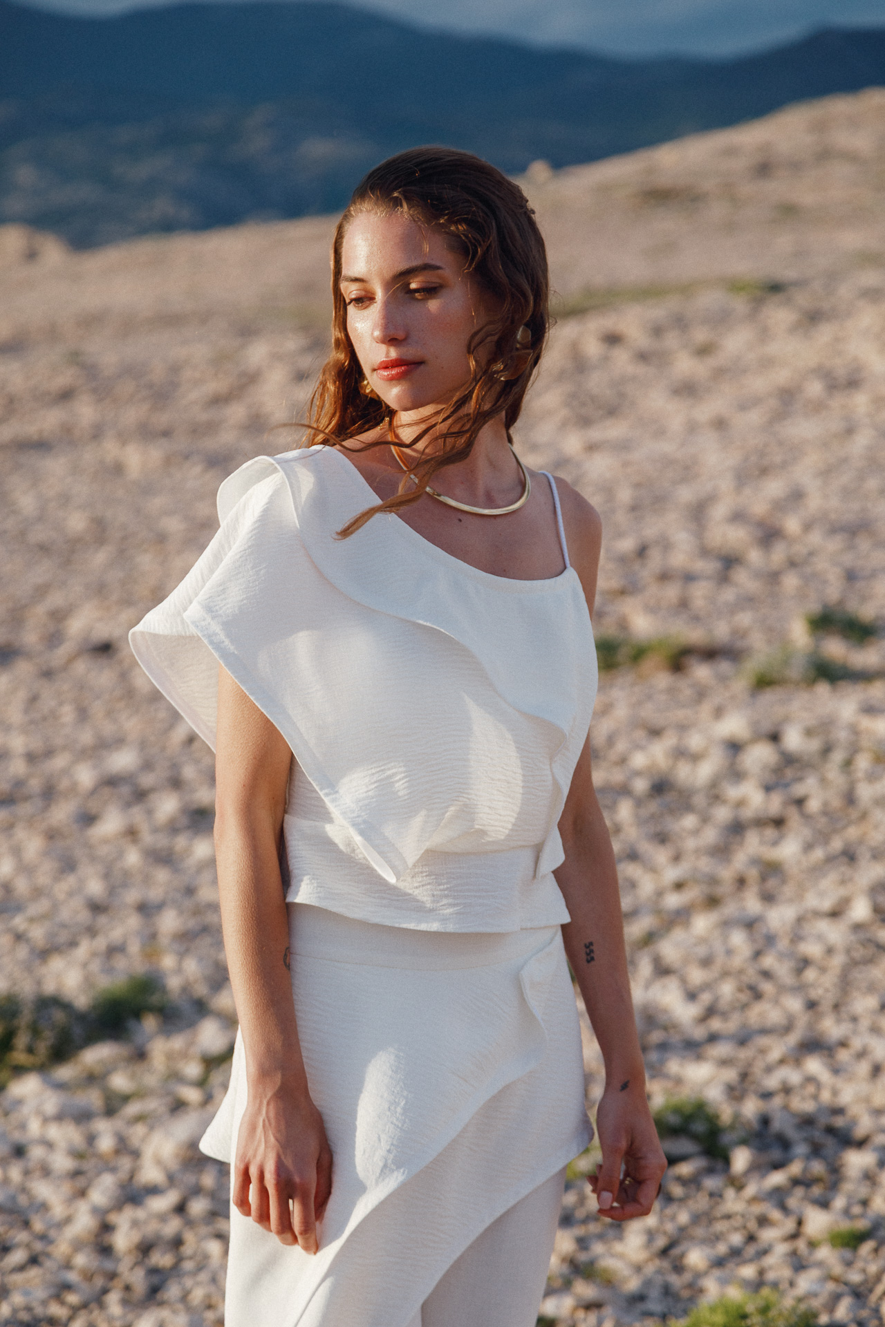 Fotografirana na Pagu, među stijenama lišenima vegetacije, kolekcija vizualno pulsira poput egzotičnog cvijeta na mjestu gdje ga najmanje očekujete. Vjetar koji je nosio tkanine tijekom snimanja savršeno je oživio ideju lepršavosti i lakoće odjevnih komada.