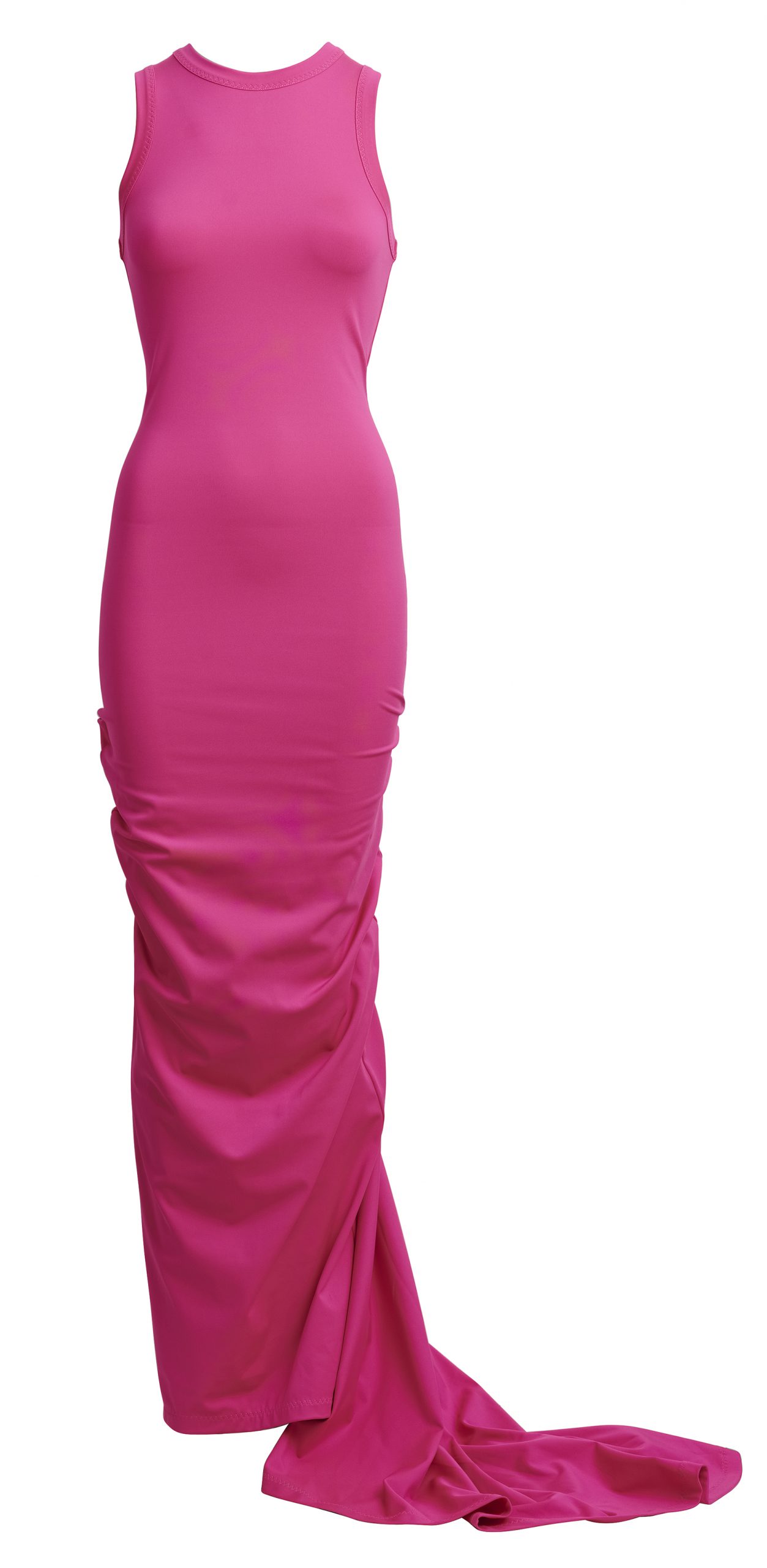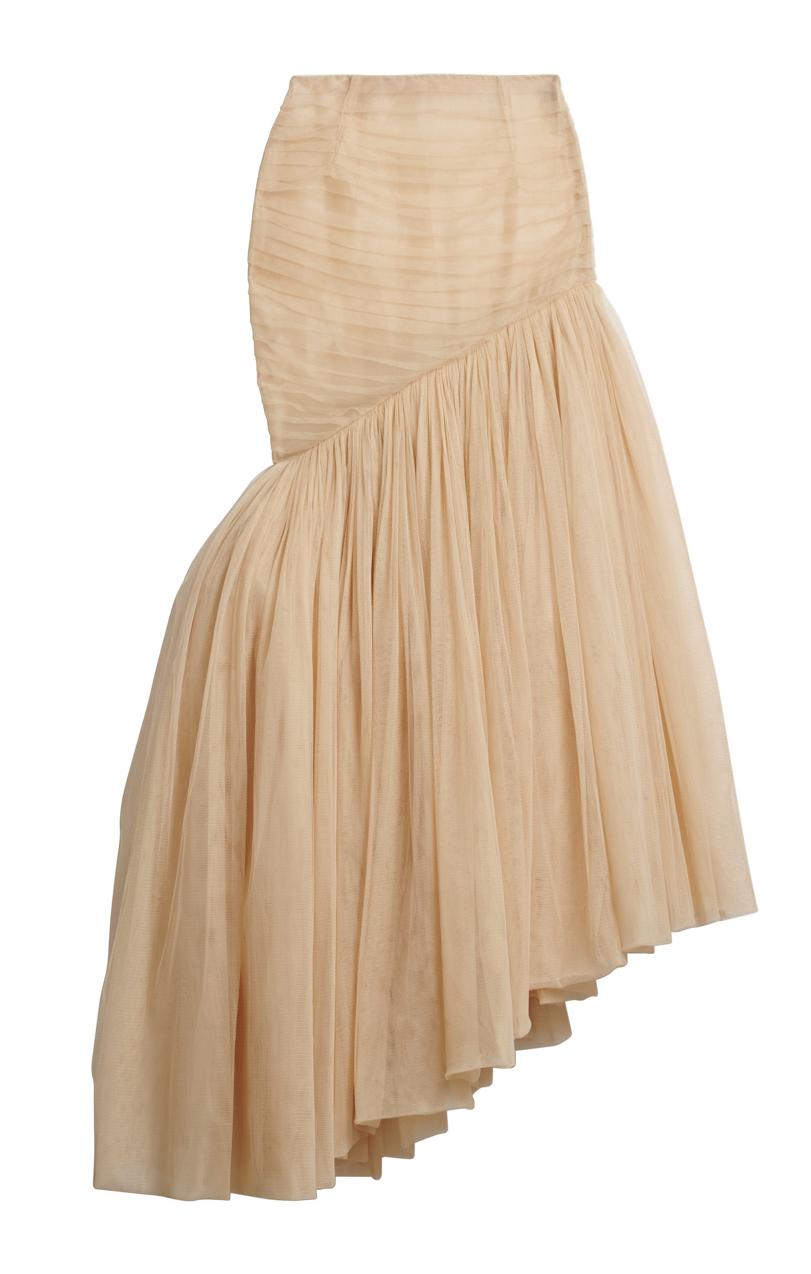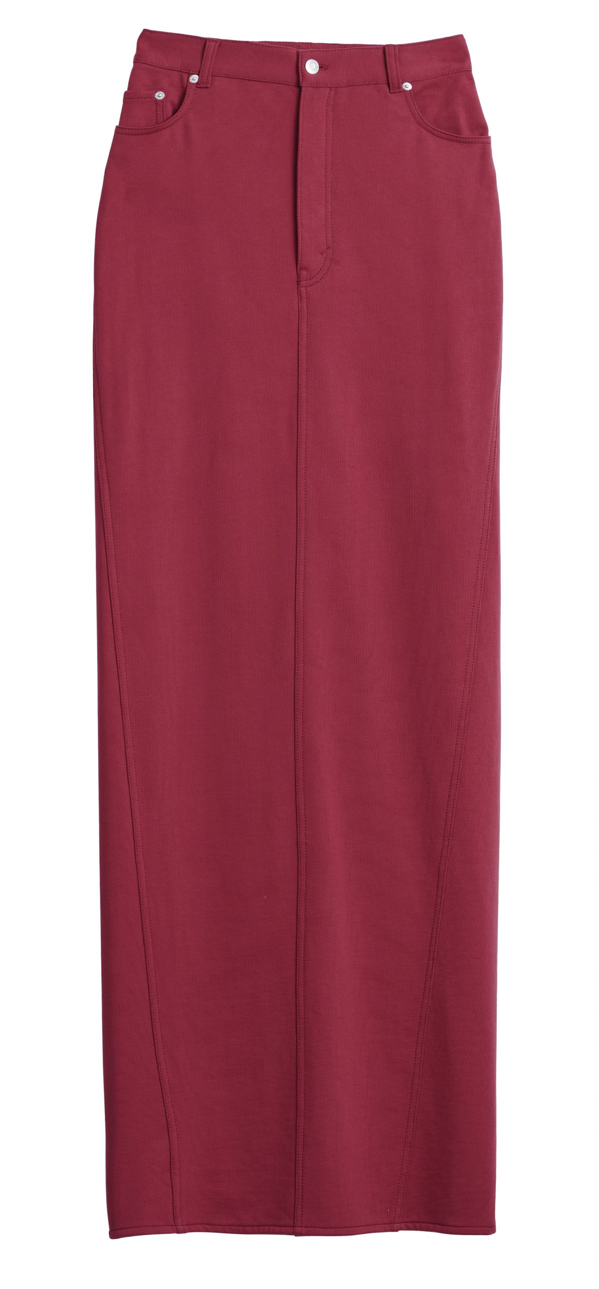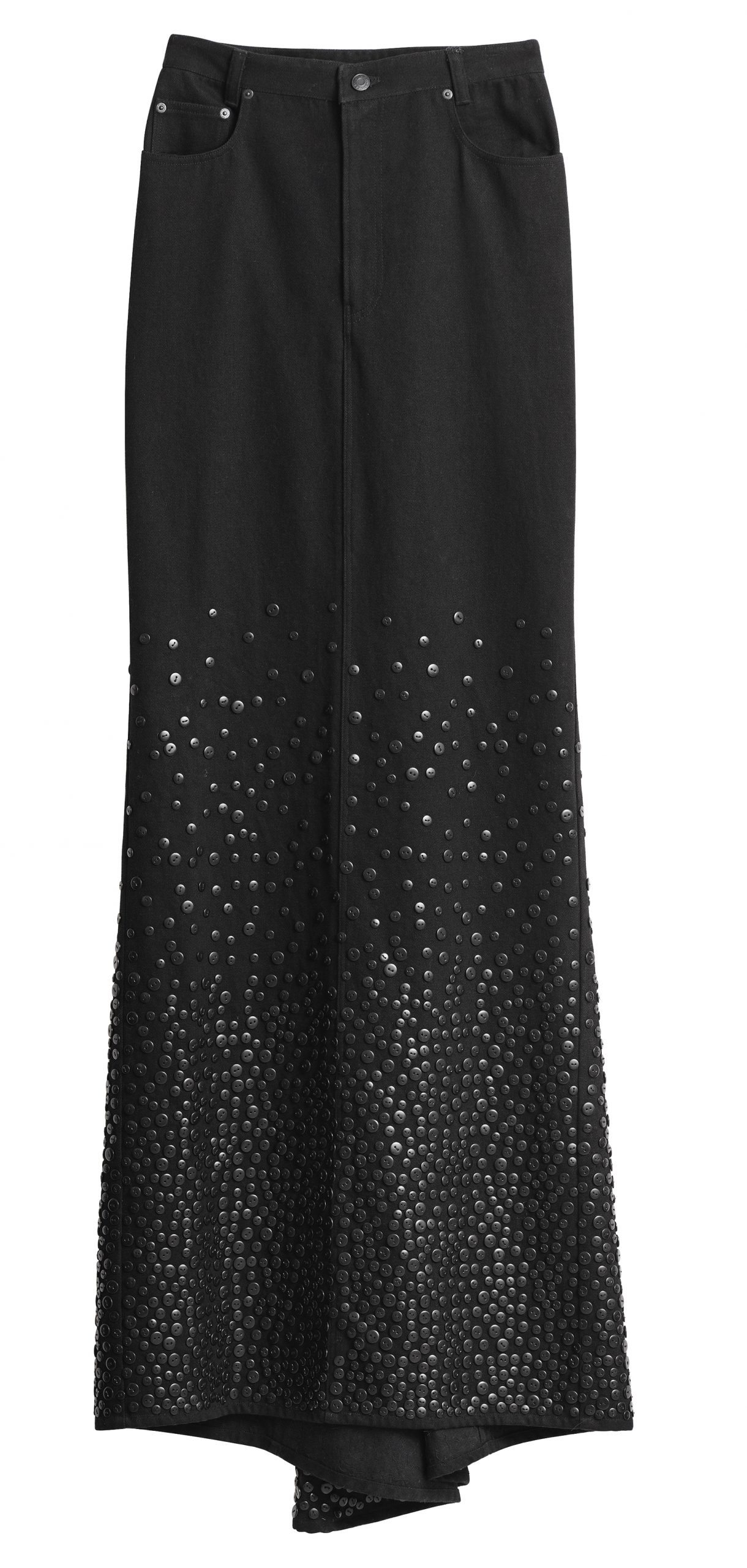 Dva ženska odjevna komada, predimenzionirani prsluk i maksi suknja visokog struka, oba izrađena od mješavine organskog i otpadnog pamuka, ukrašena su stotinama ručno ušivenih gumba.