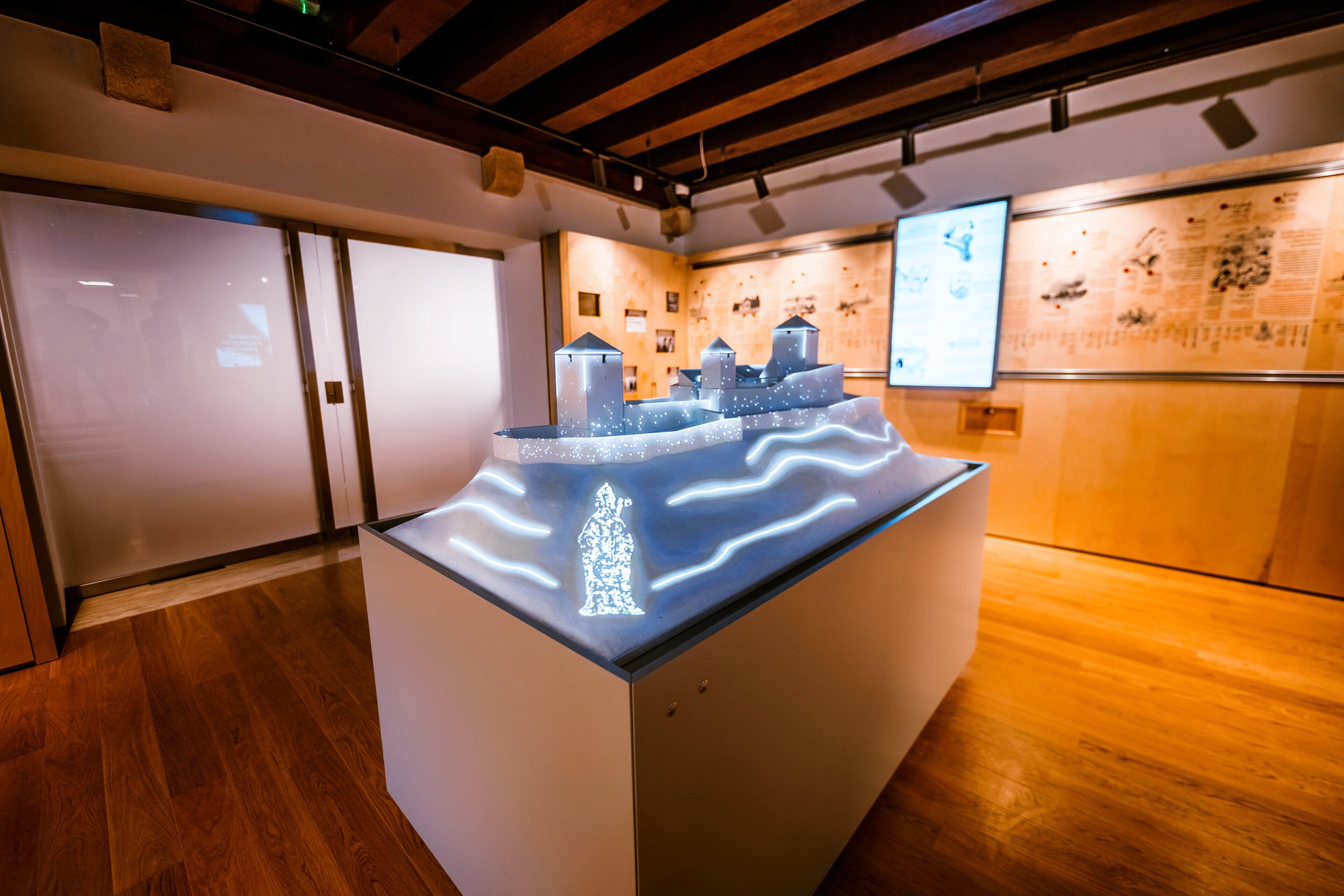 U Velikom – zapadnom palasu nalazi se informacijski centar s info pultom i suvenirnicom. U njegovoj središnjoj dvorani postavljena je muzejska izložba „Začarana povijest“ koja interpretira zanimljivu i bogatu povijest Medvedgrada te samog Parka. U Malom – istočnom palasu nalazi se stalna muzejska izložba „Tajne drevne planine“, a sastoji se od srednjovjekovne smočnice i kazališta sjena. Posebno atraktivna je Južna kula koja prikazuje prirodne i kulturne vrijednosti i važnosti zaštićenog područja. Kreativni izlošci praćeni interpretacijskim tekstovima izvedeni su dijelom u kompleksnoj multimedijalnoj produkciji. Uz navedeno, u Centru je otvoren i prostor na kojem se mogu odvijati razni programi, radionice, događanja i slično.